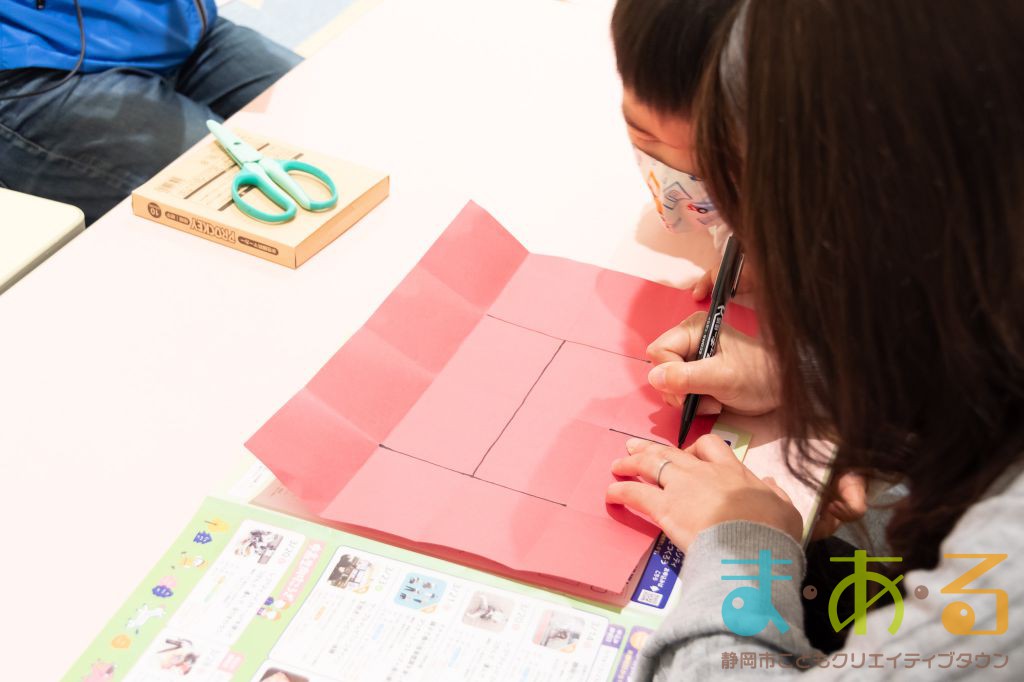 折りたたむ前に大きな紙に絵を描いてから、切って畳んで、出来上がった本のページに現れる線から、何かを想像して描いてみたり、