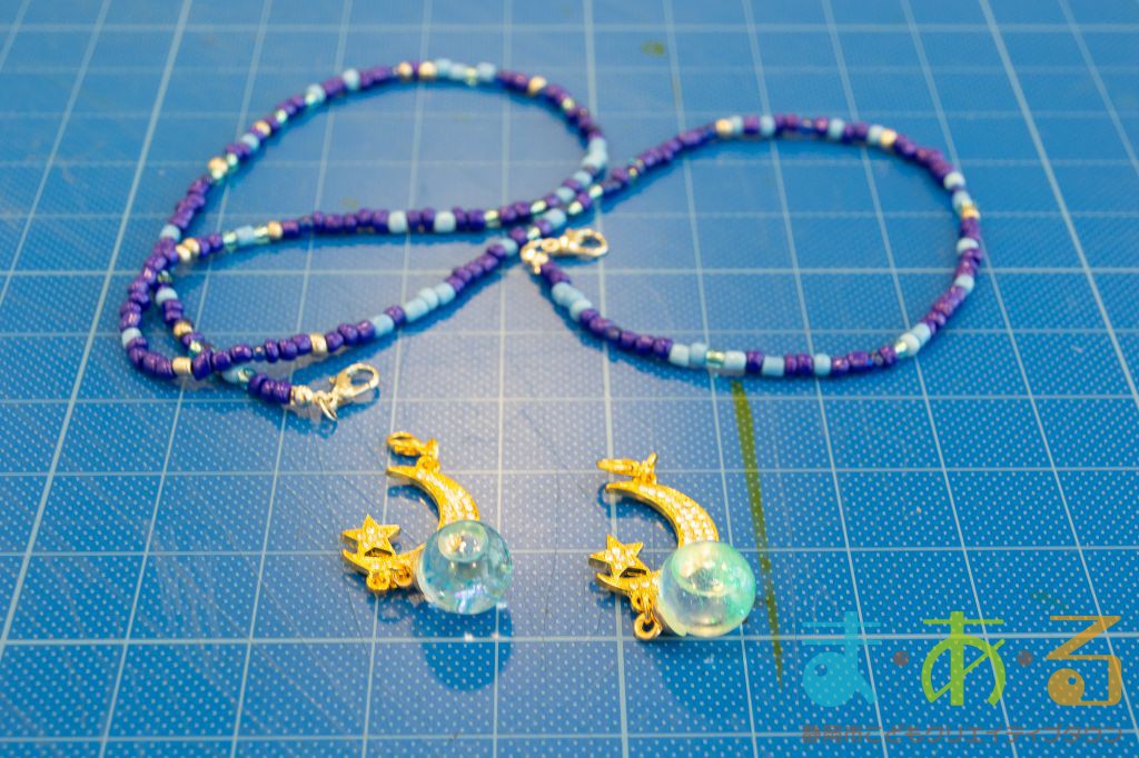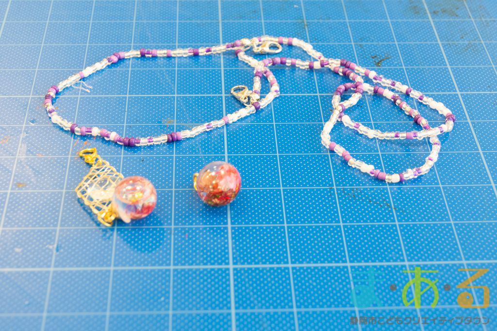 チャームの上の部分にCカンとカニカンをつけて、先生が作ってきてくださったネックレスとつなげました。