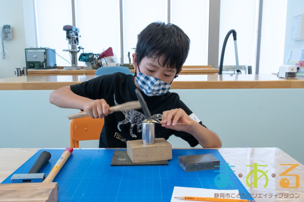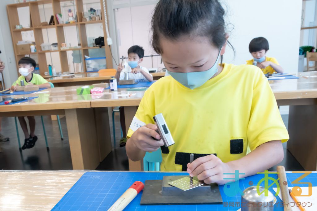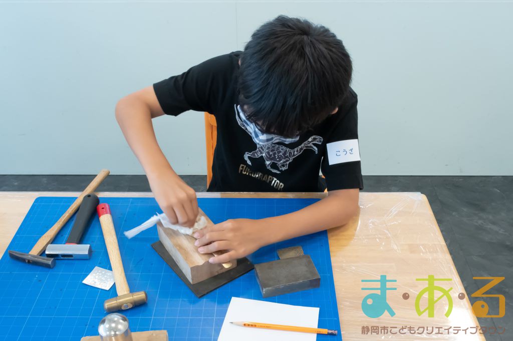 はじめに、アルミの板に刻印の練習をしました。