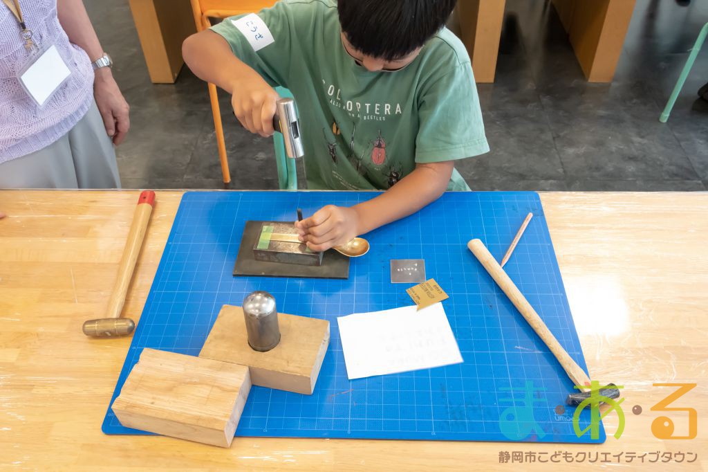 アルファベットが1文字ずつ書かれた金型をしっかり持って、重めのハンマーで2回ドン、ドンと叩きます。