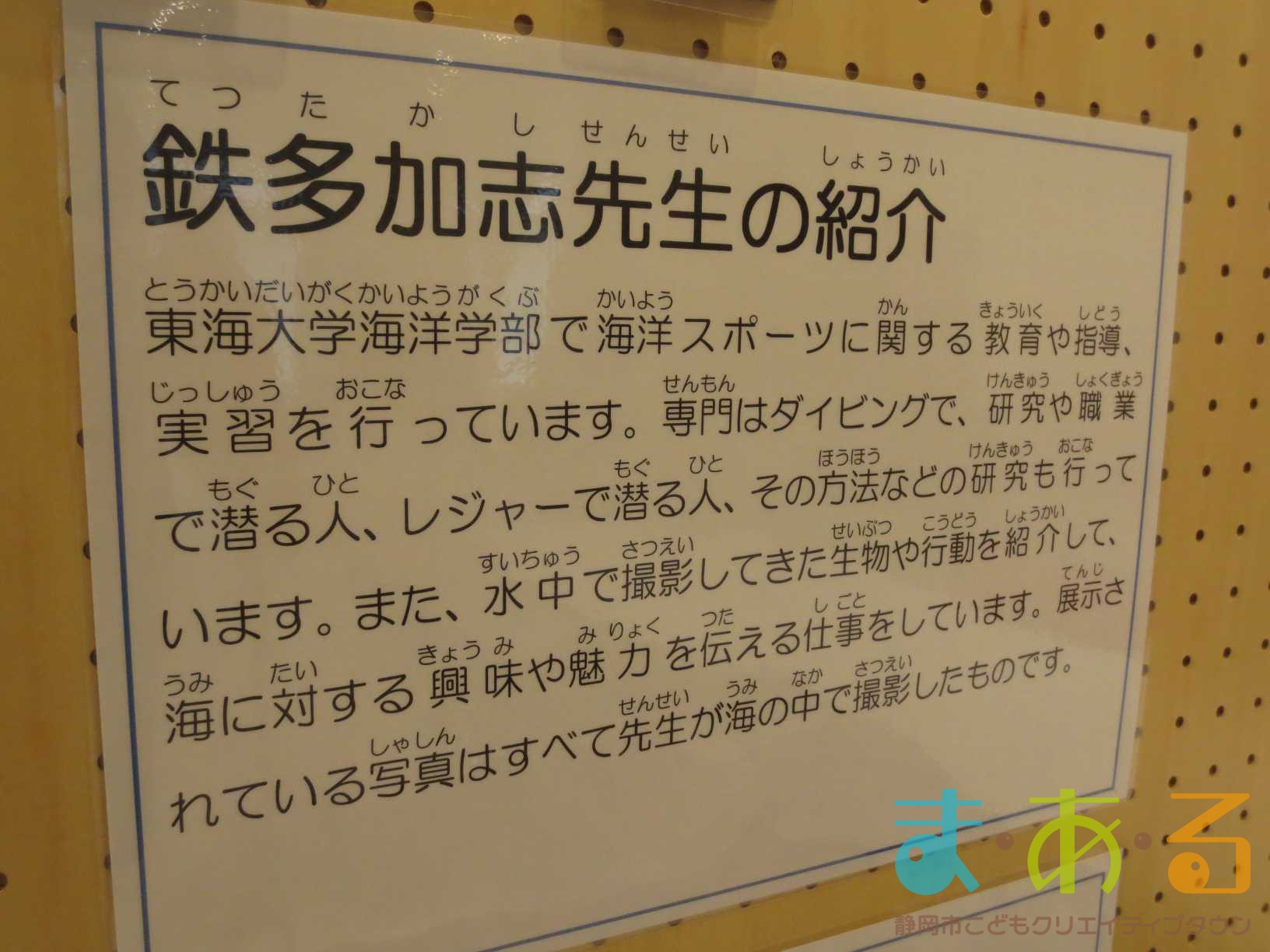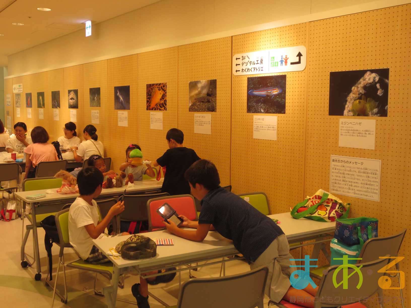 8月27日に行われた「海洋スポーツ研究者に学ぶ スタンドアップパドルボート体験」で講師をしてくれた東海大学海洋学部の鉄先生の写真展「鉄先生の三保のおさかな展」がま・あ・る4階のギャラリーにて行われました。こちらの展示は静岡市のプレミアムフライデー(プレミアムウェークエンド)のイベントとして開催しました。