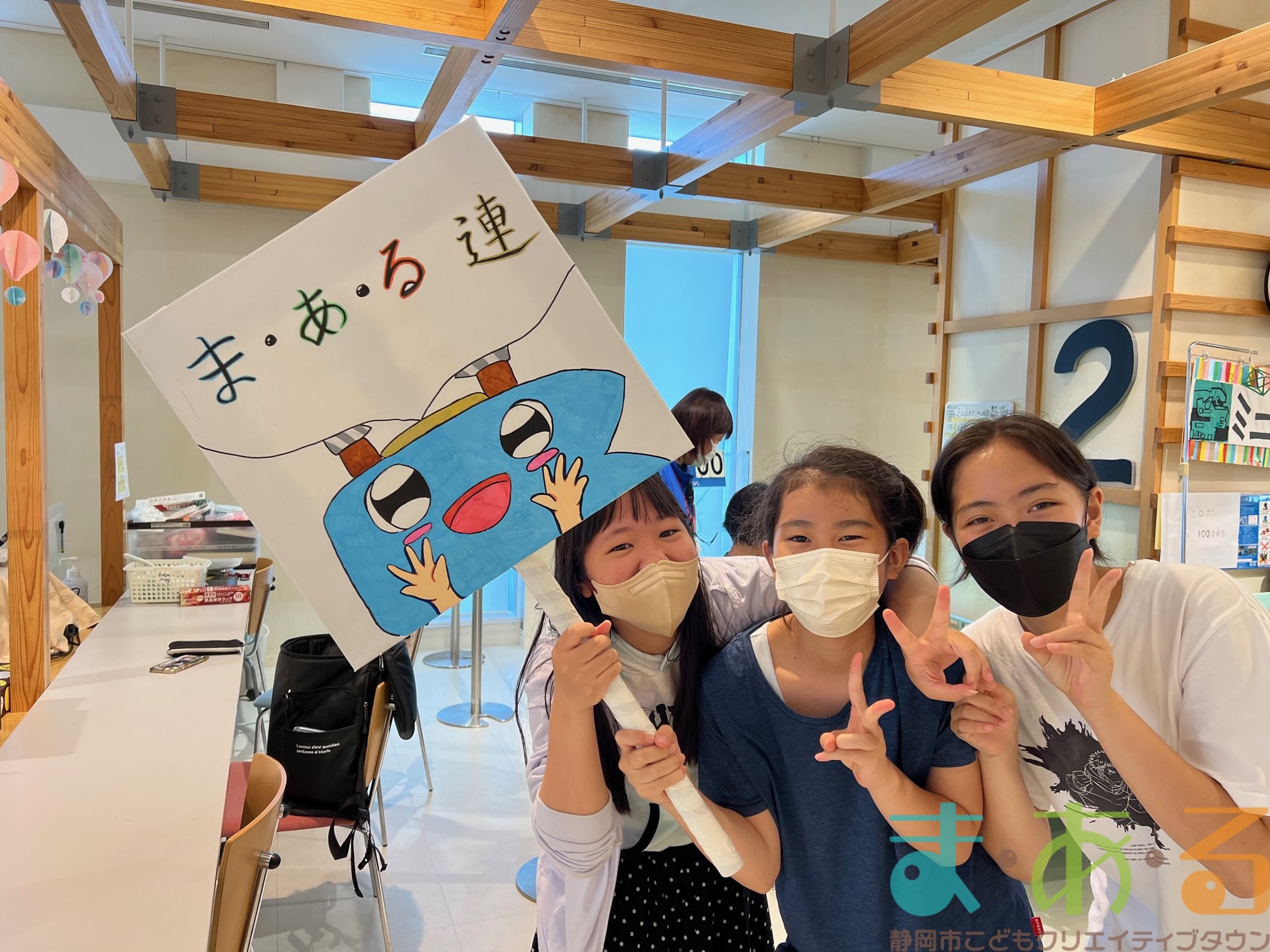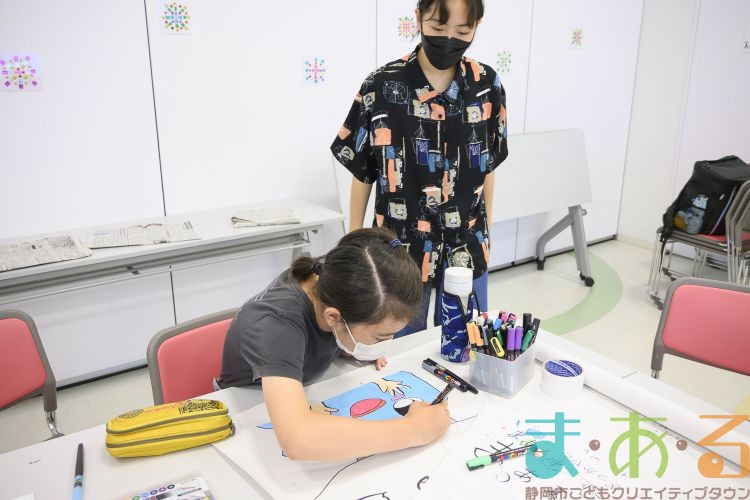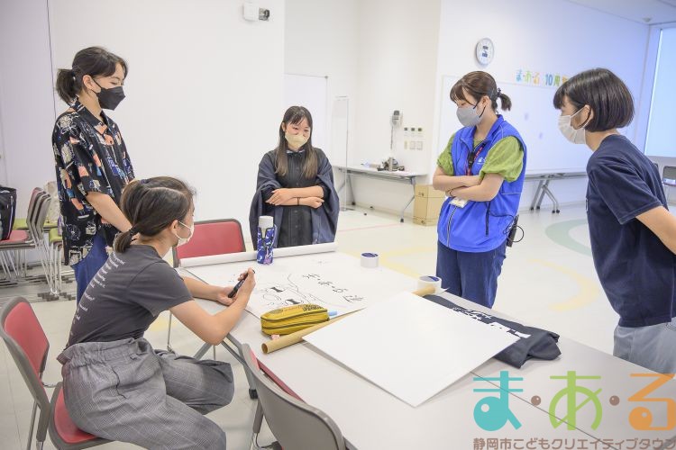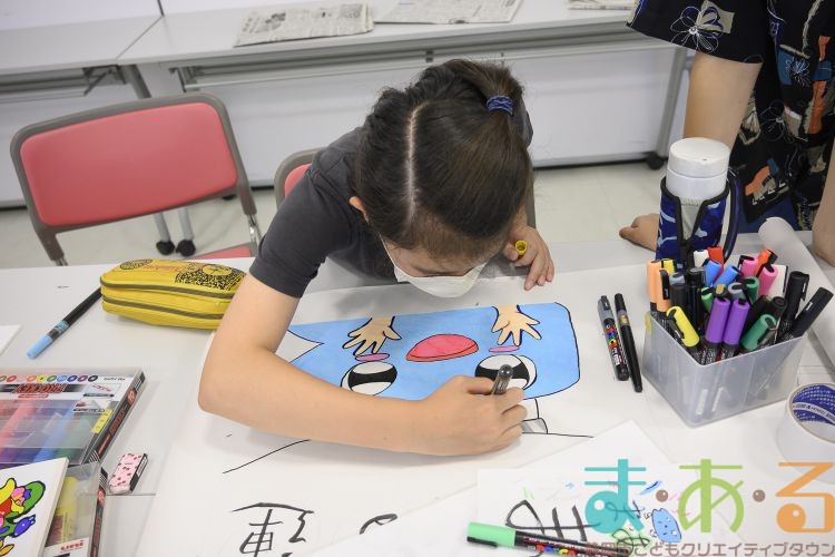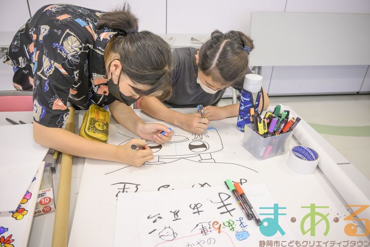 描いている途中で、かっぽれのリズムが聞こえると自然と踊りだす「プラカード作成チーム」。