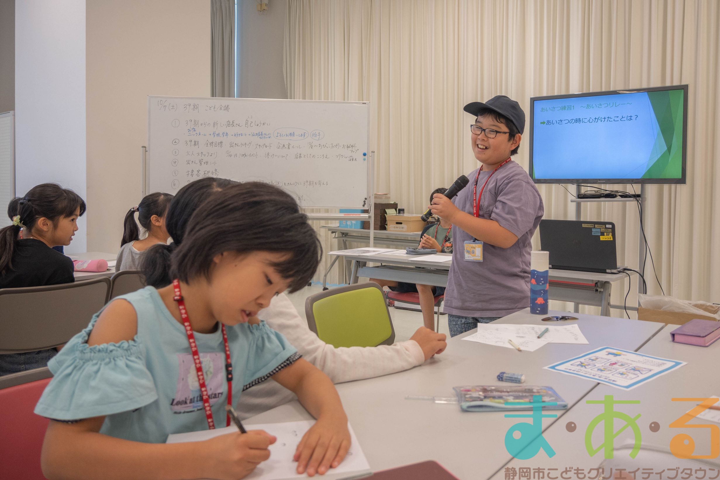 最初に、39期から新しく仲間入りする新人こども店長の自己紹介からスタートです。39期担当するお店、ニックネーム、学年、学校名、好きなもの、どんな店長さんになりたいか、を発表してもらいます。