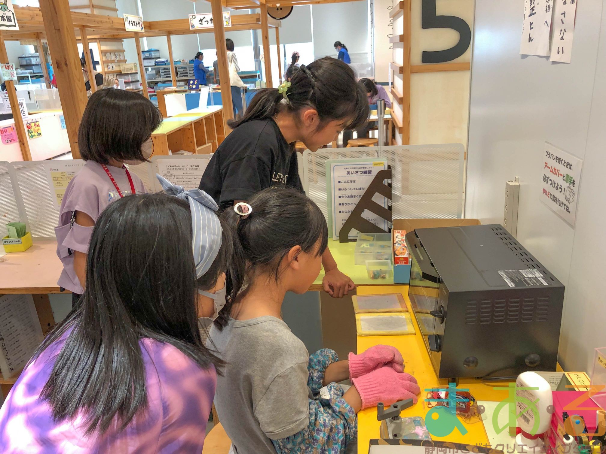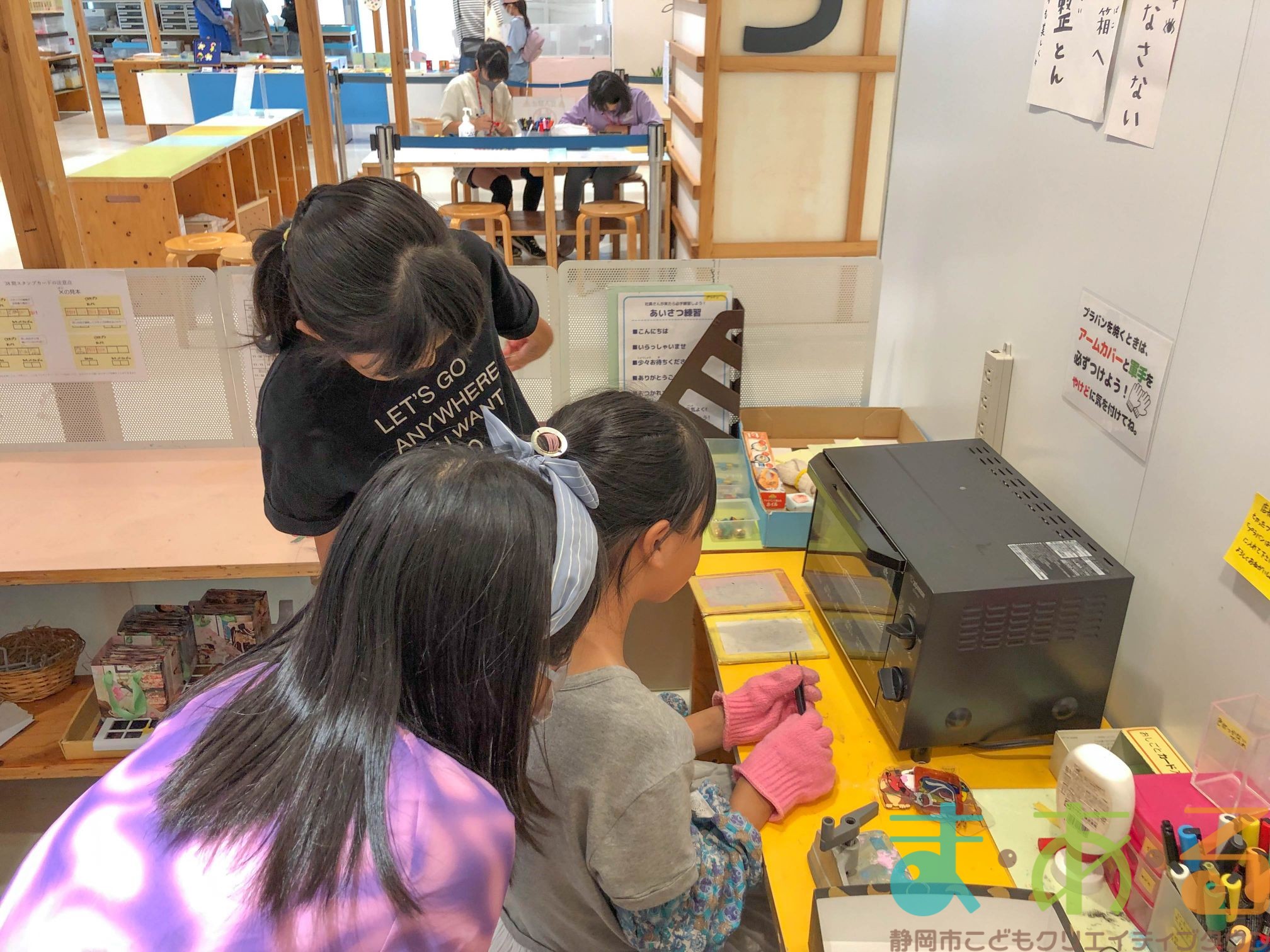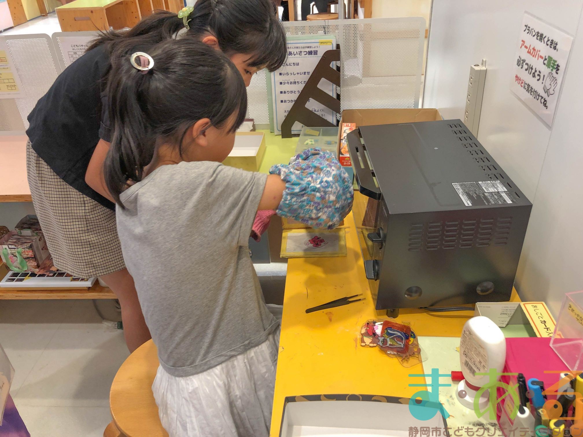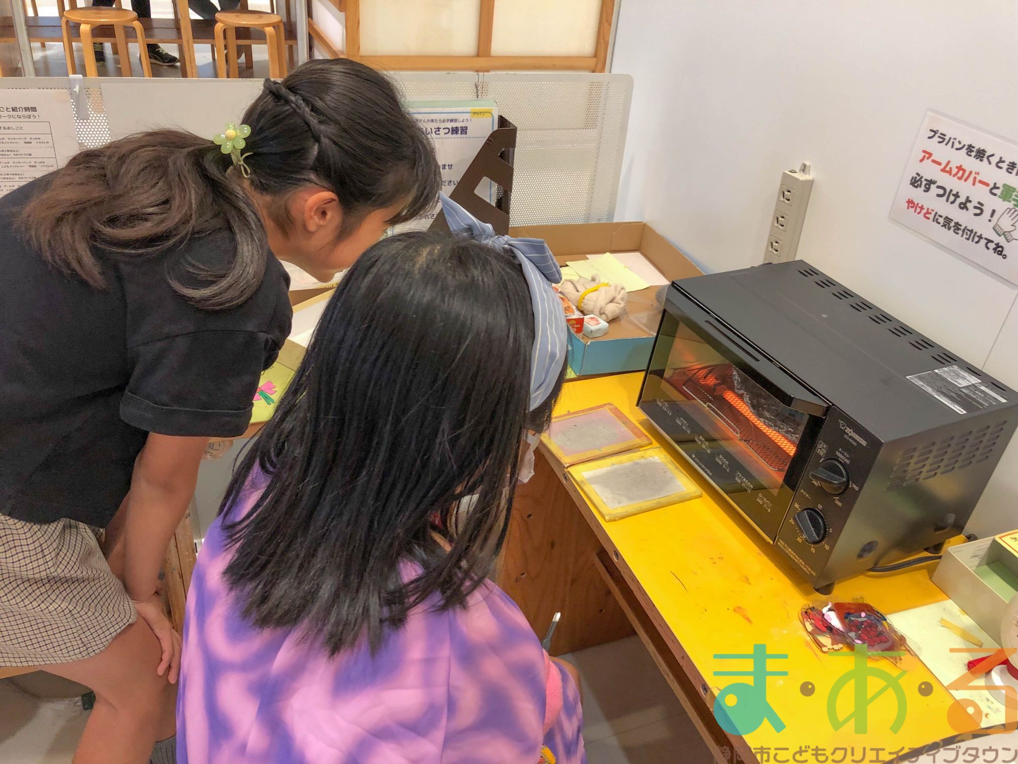 プラバンやでは、先輩店長に教えてもらいながら実際にプラバンを焼いてみます。