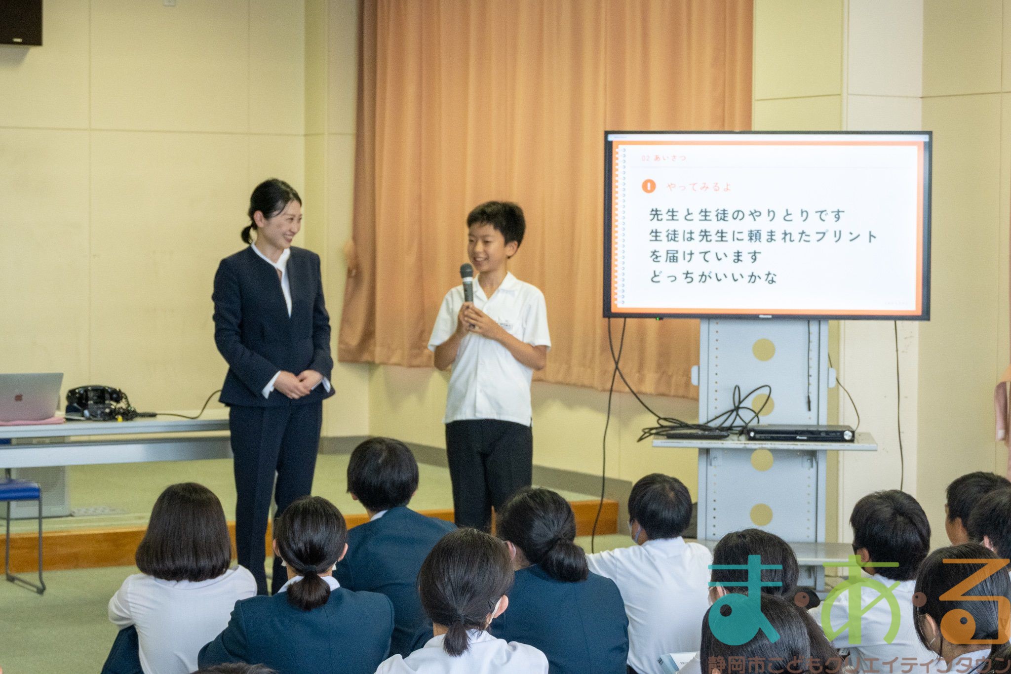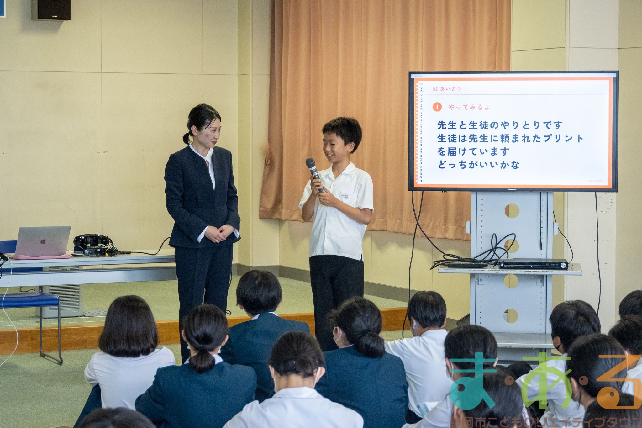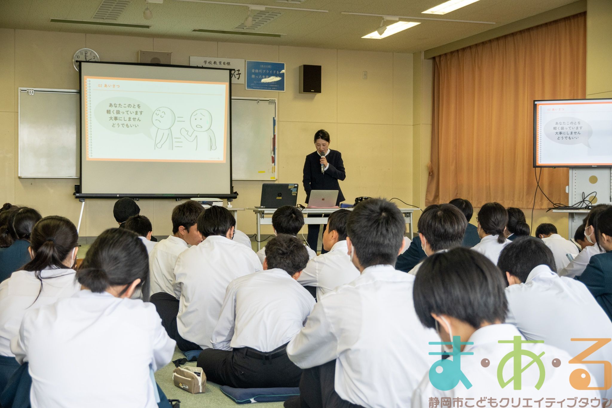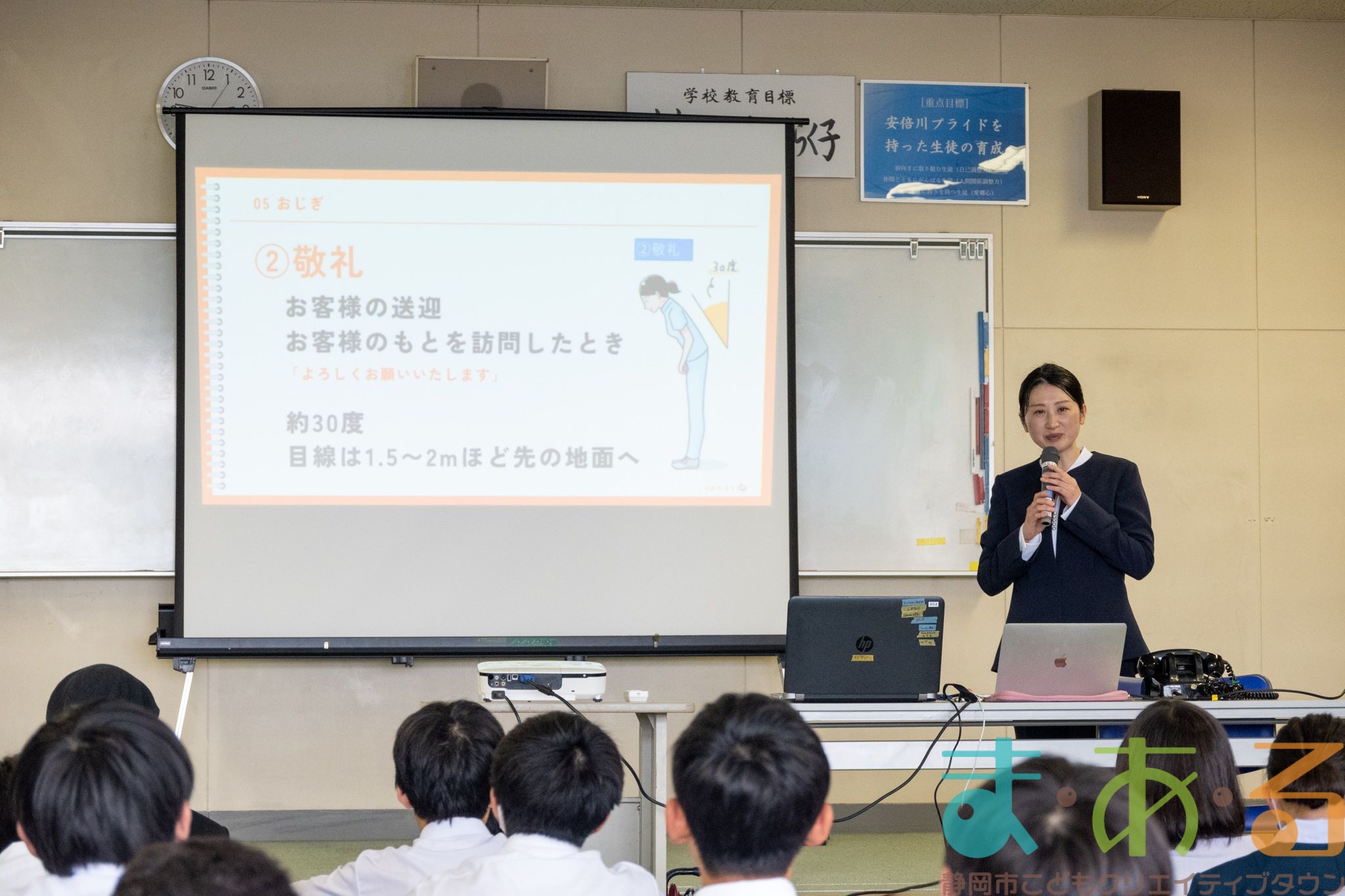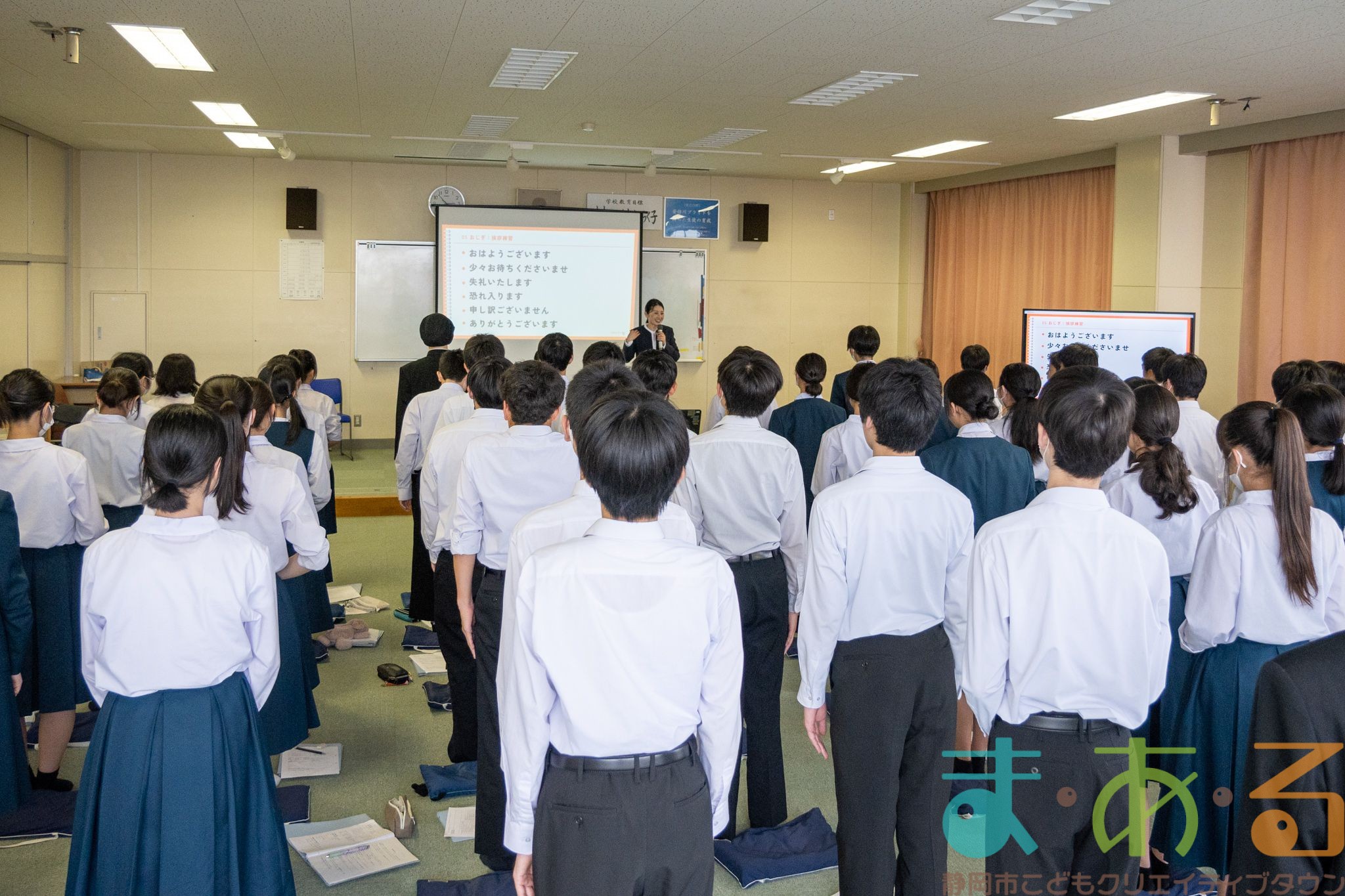 講座の内容は、なぜマナーが必要なのか、あいさつの練習、おじぎの練習など90分間のマナー講座でした。