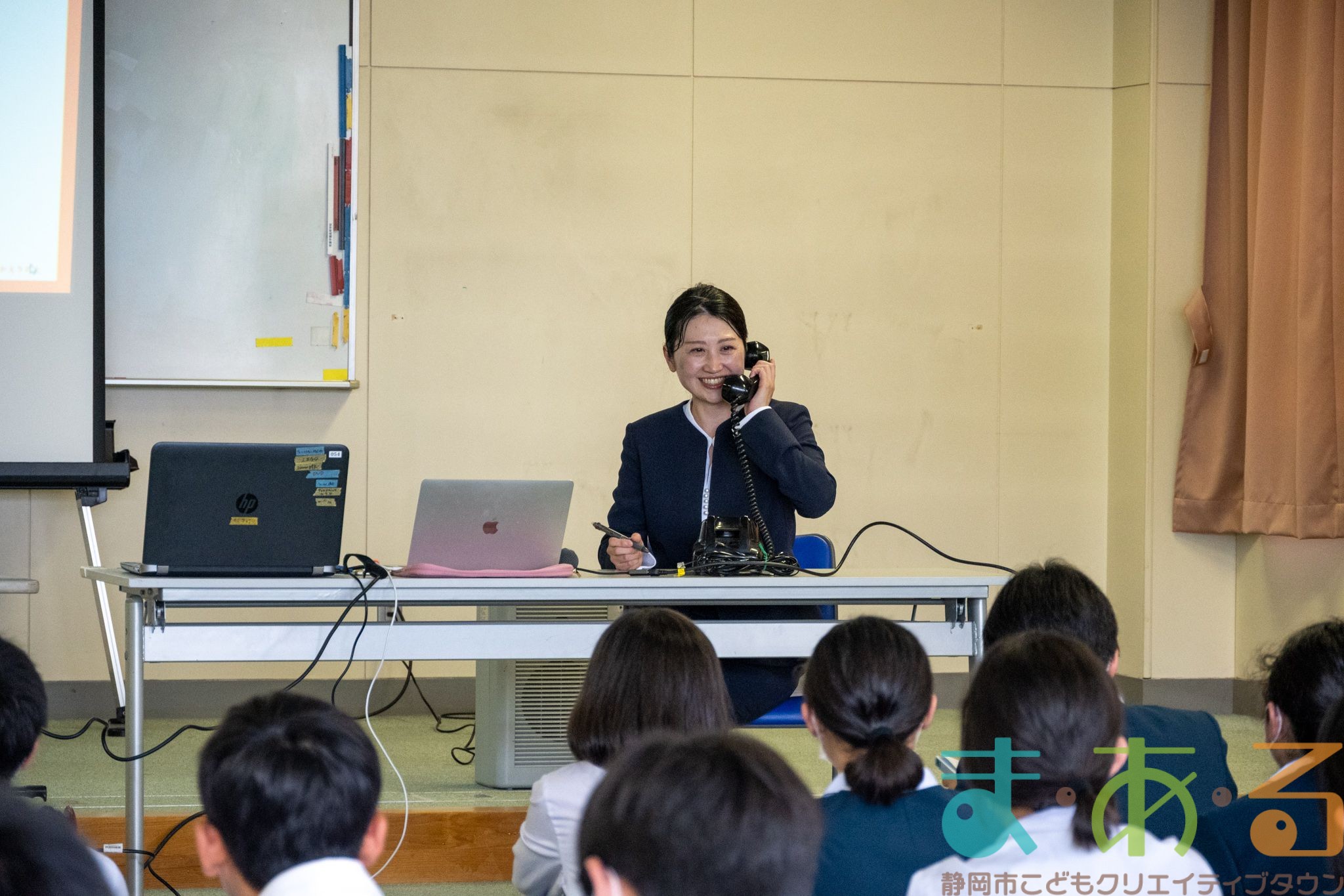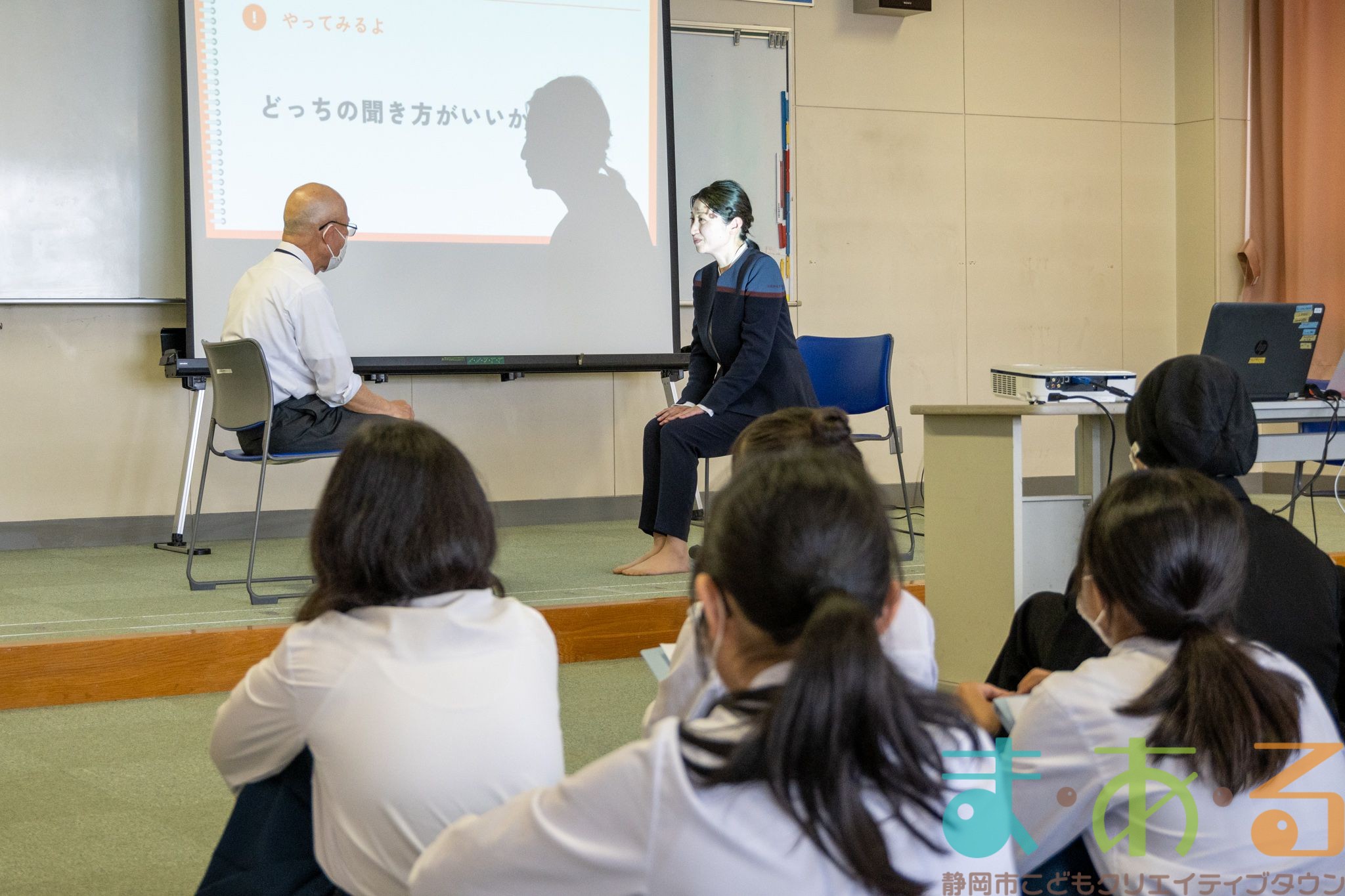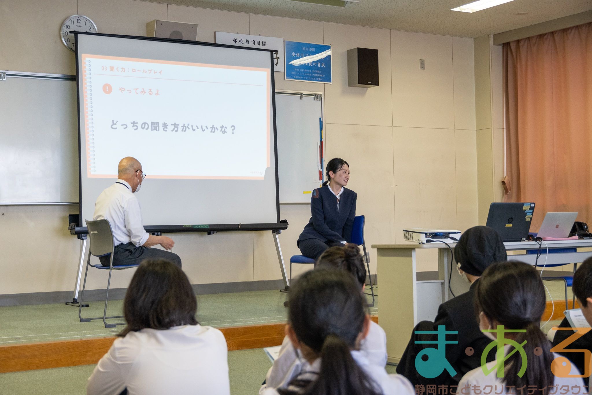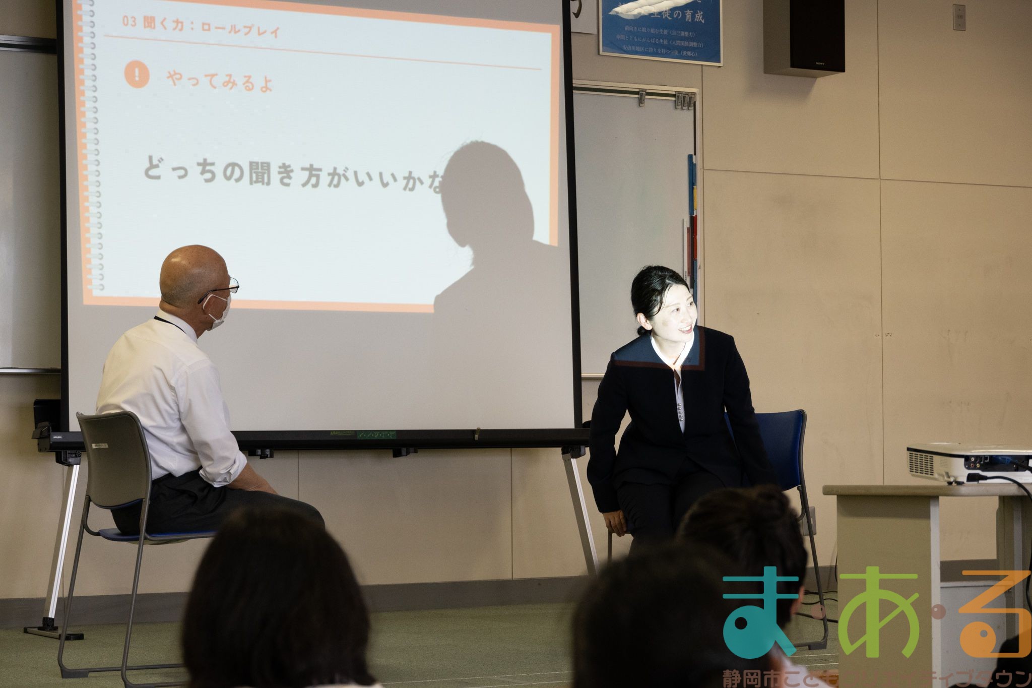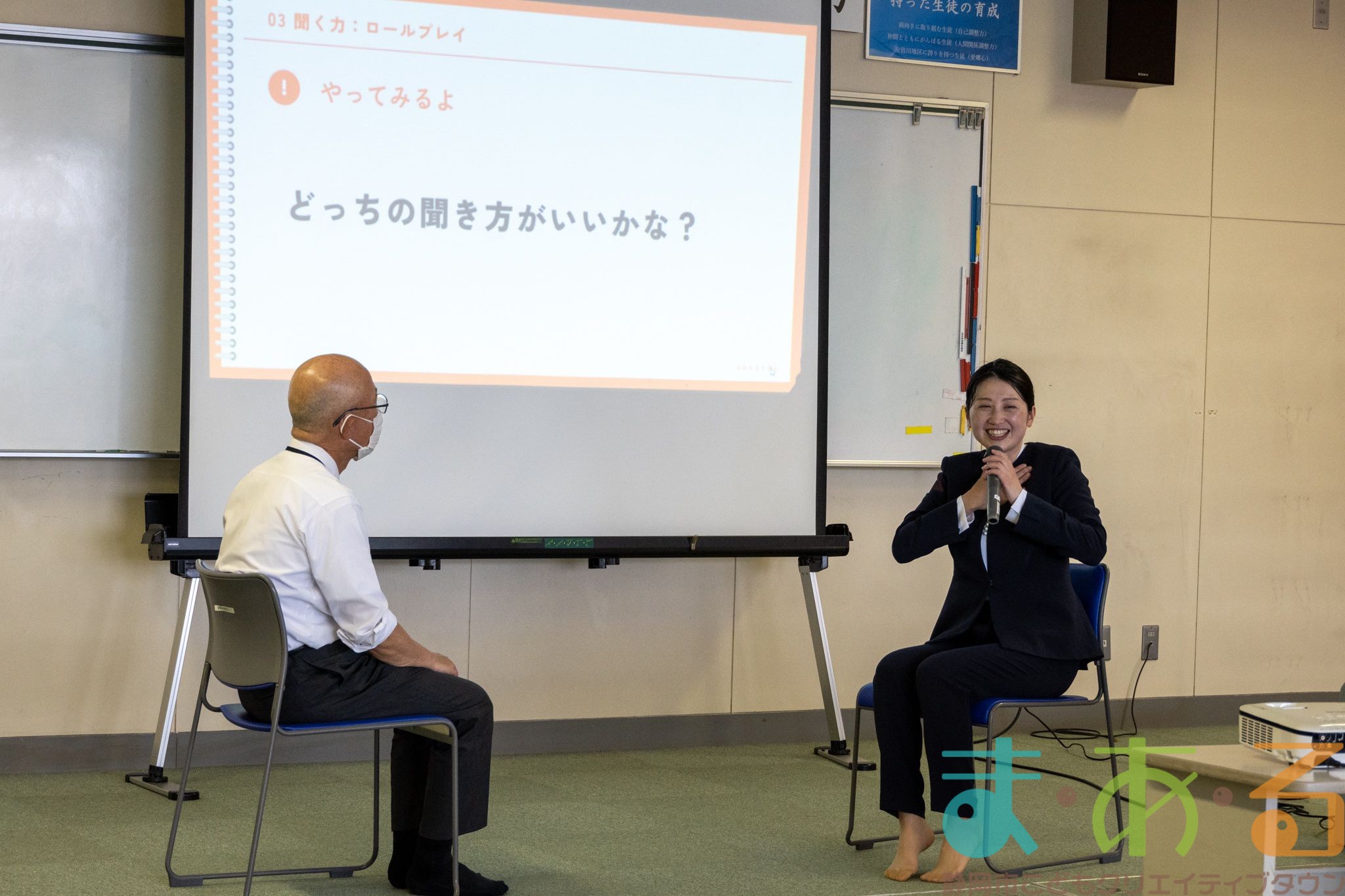 先生や生徒の方に協力いただき、ロールプレイングもしました。名演技のおかげで、会場は大盛り上がり!