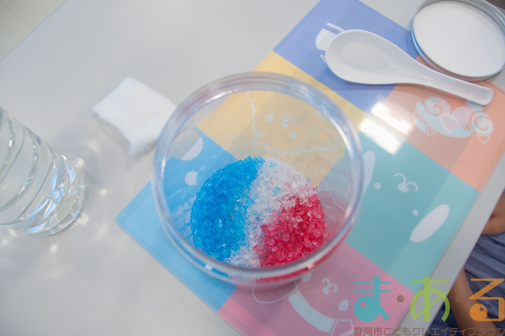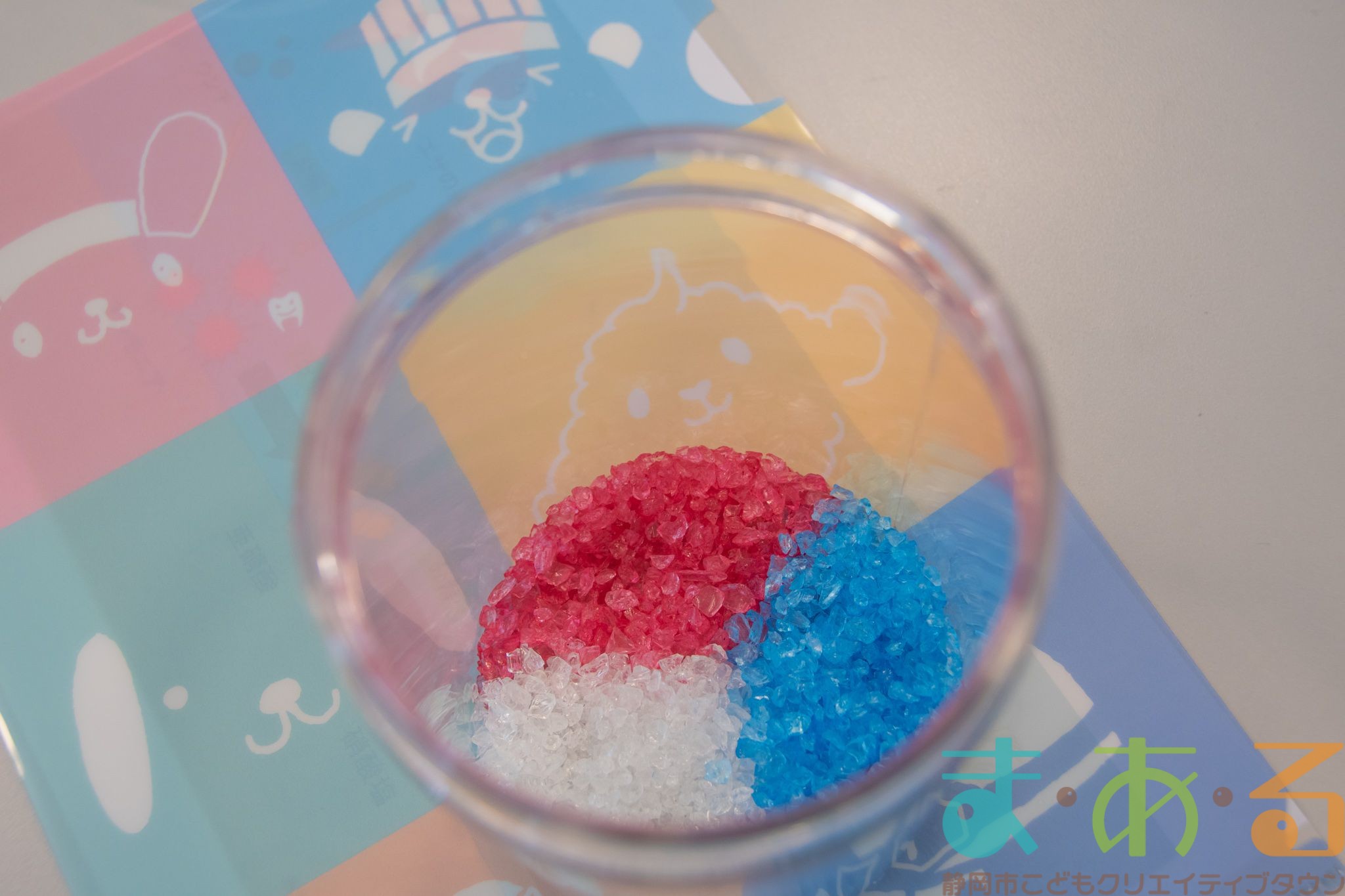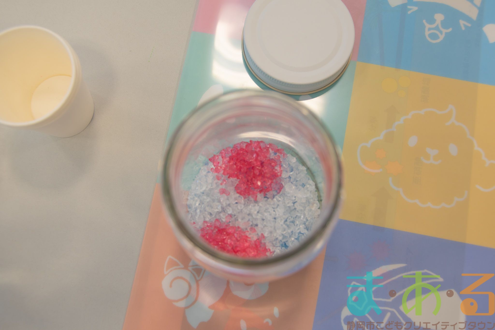 色は、赤、青、白です。レンゲを使って少しずつ、ボトルの中に入れます。