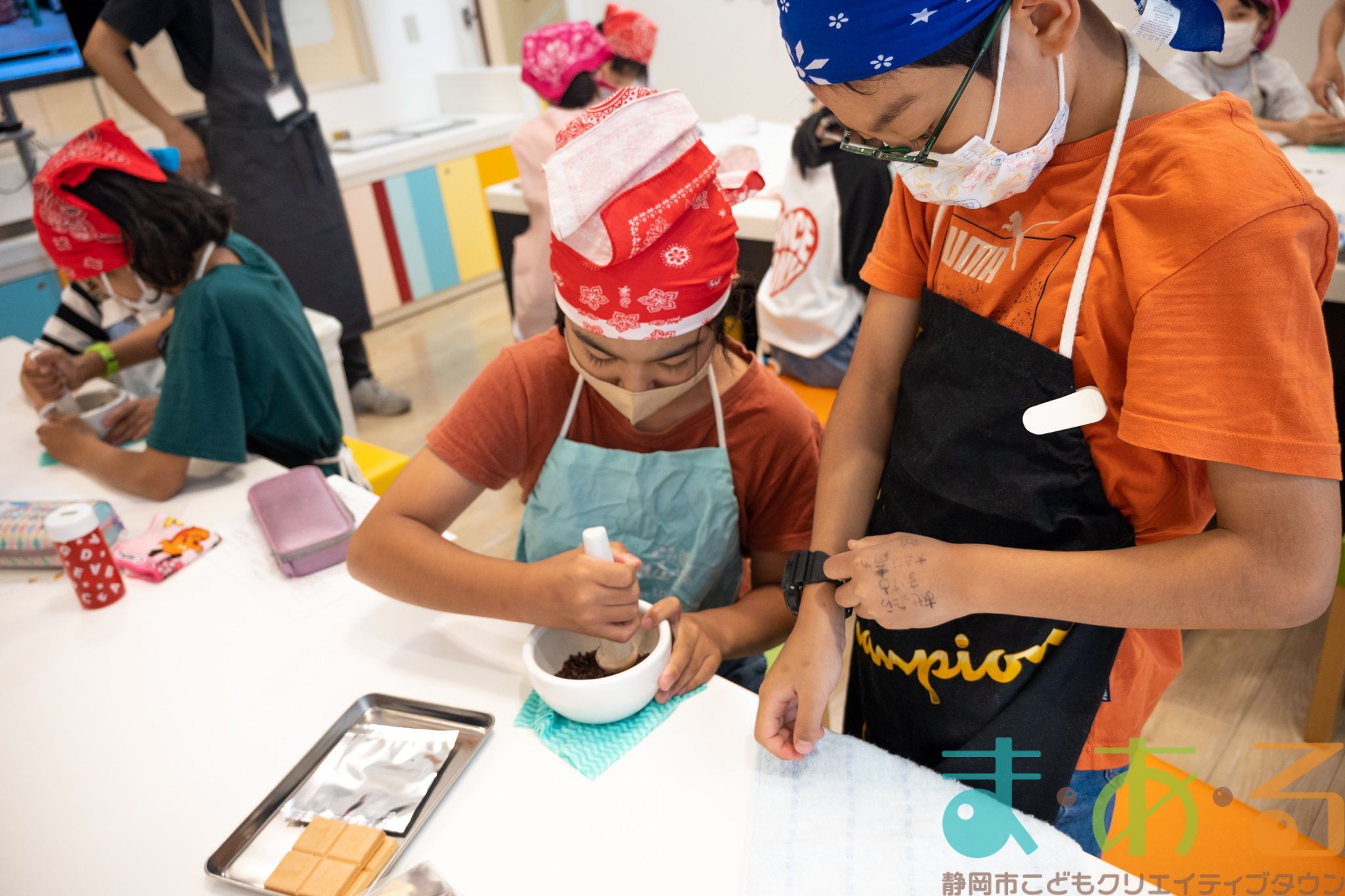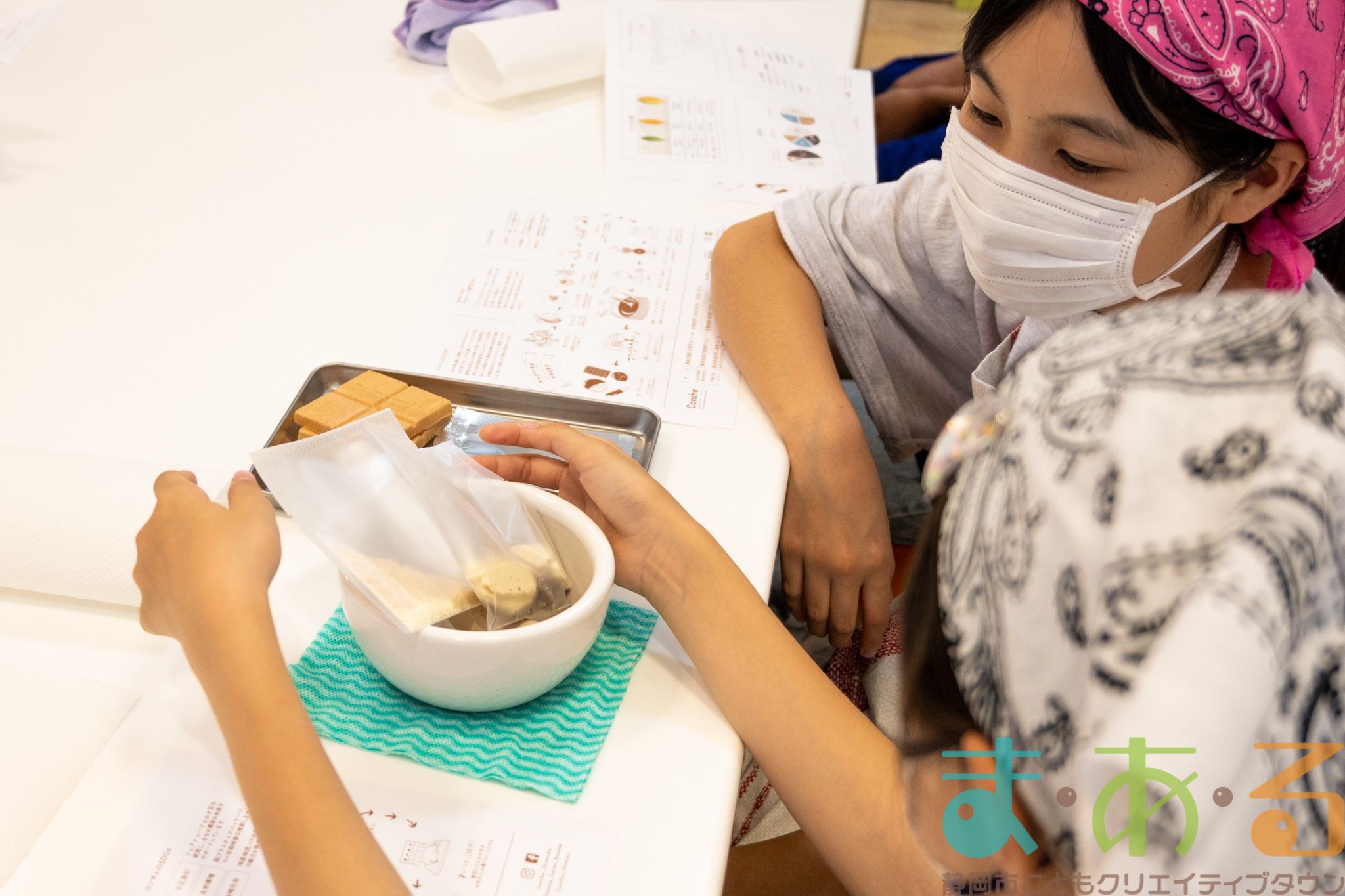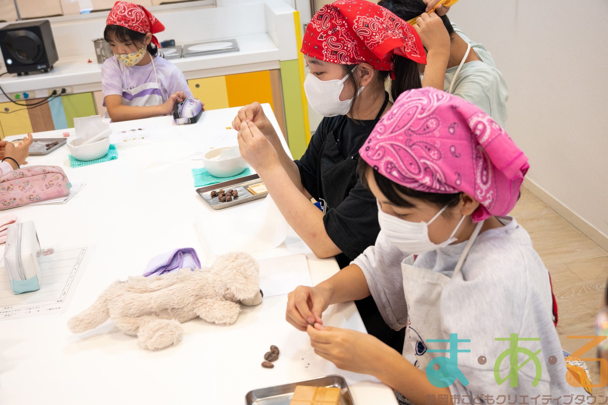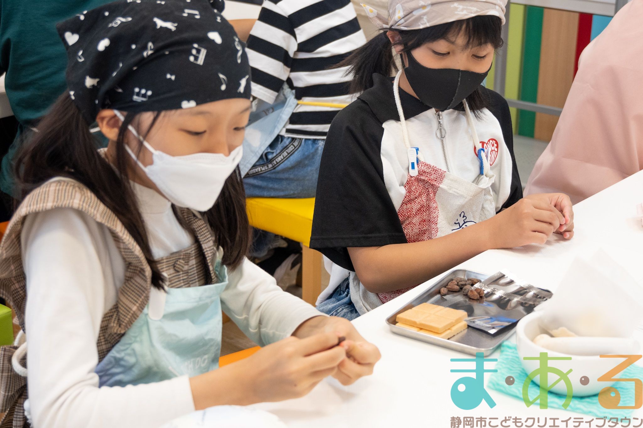 チョコレートについて学んだ後は、2人1組になってカカオ豆からチョコレートを作っていきます。