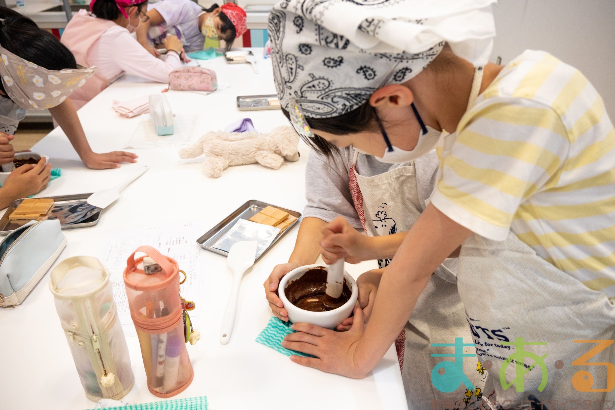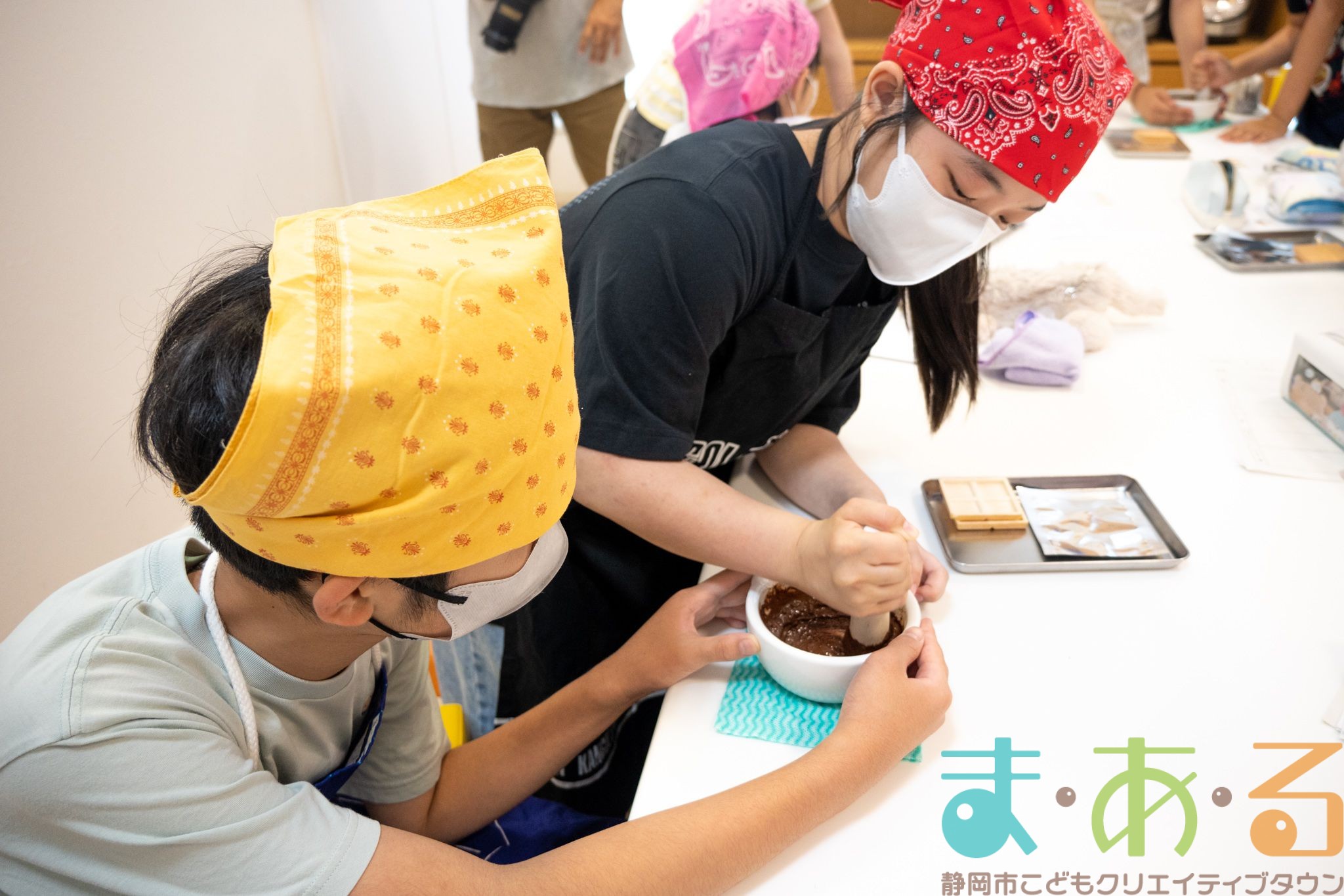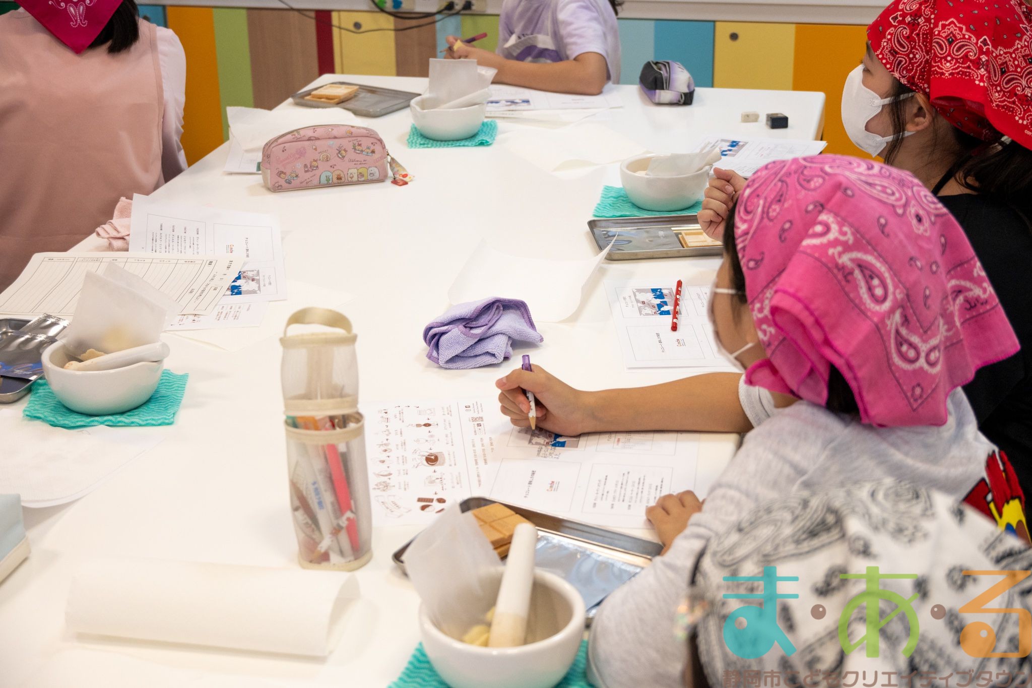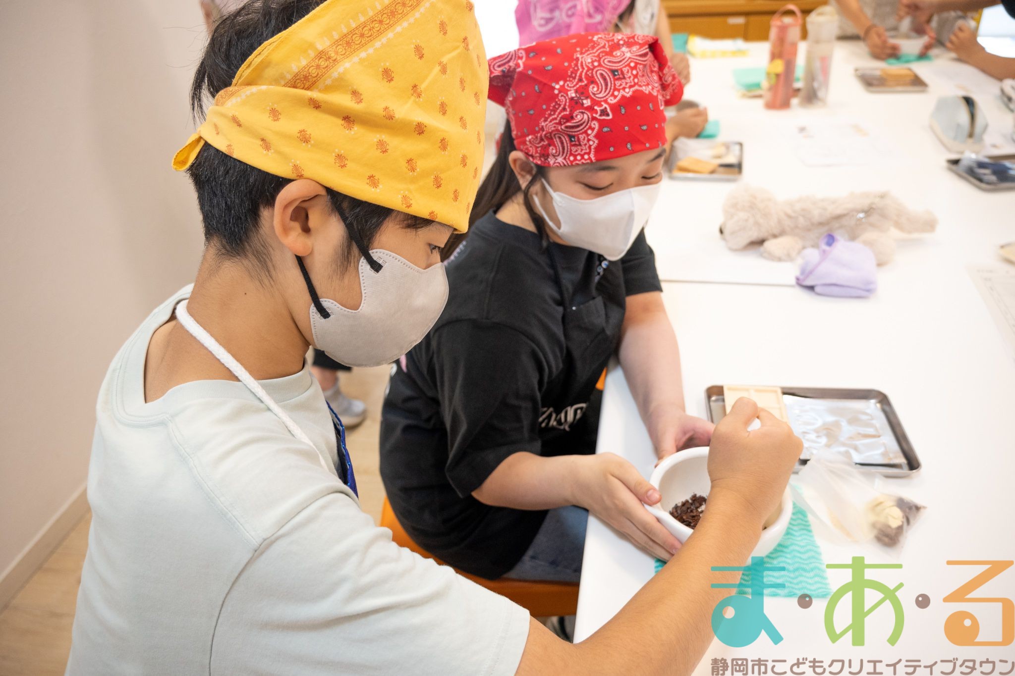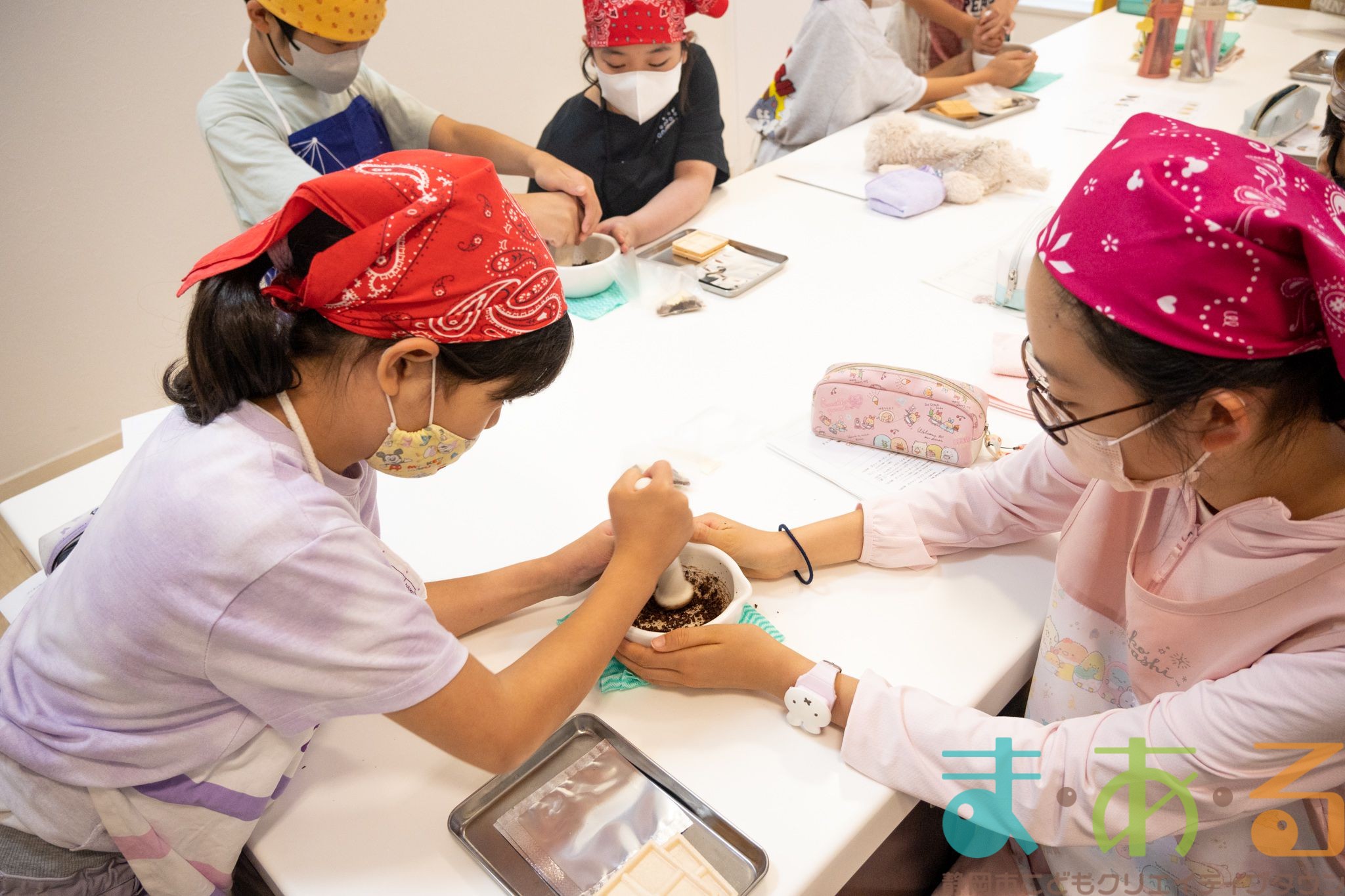 チョコレートについて学んだ後は、2人1組になってカカオ豆からチョコレートを作っていきます。