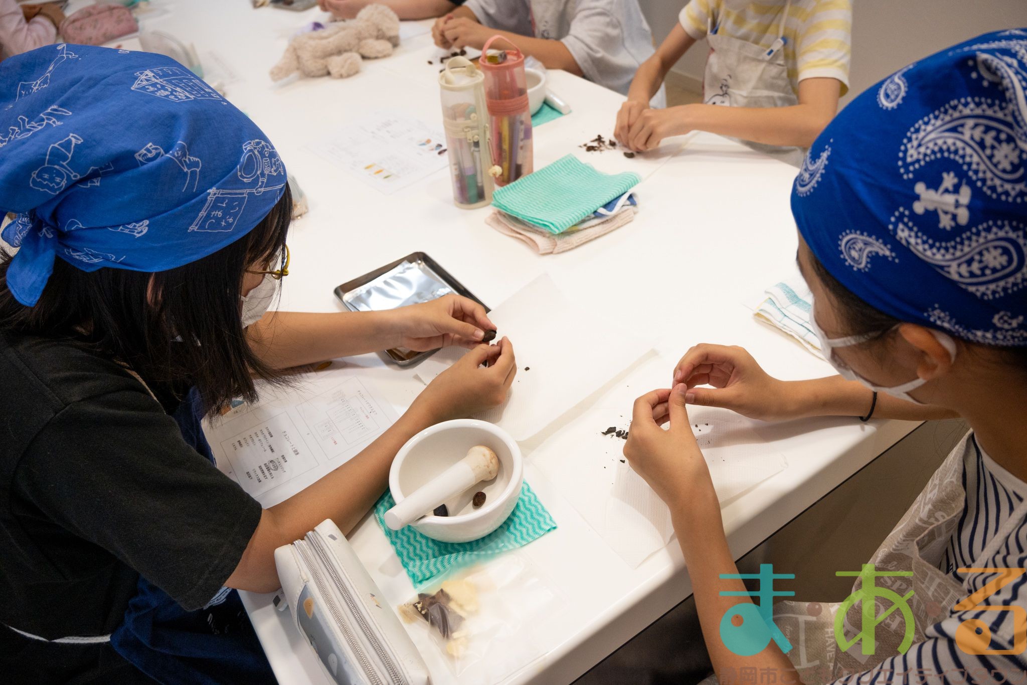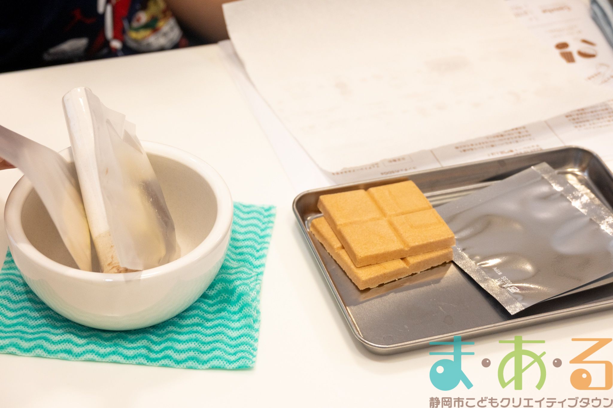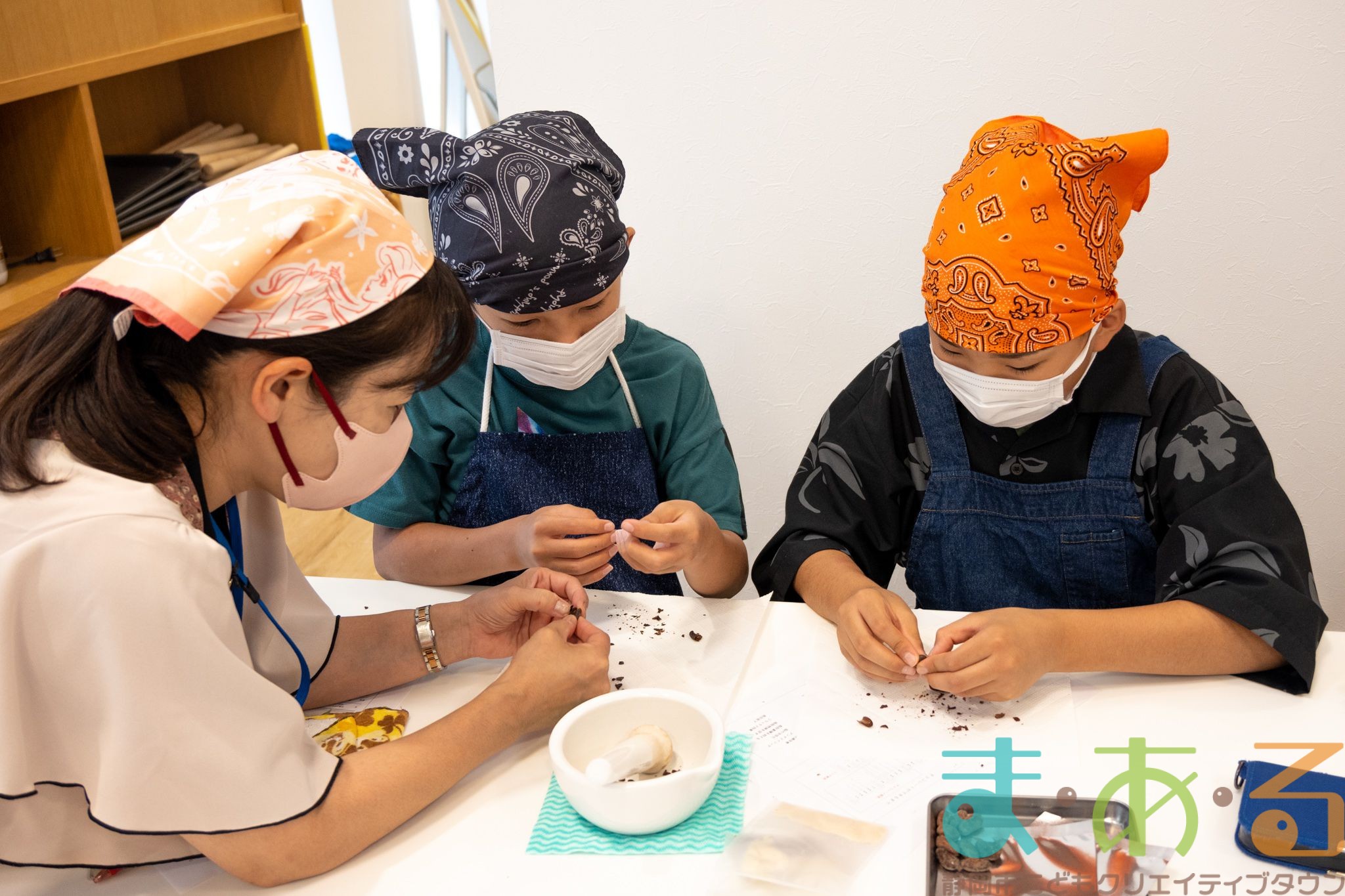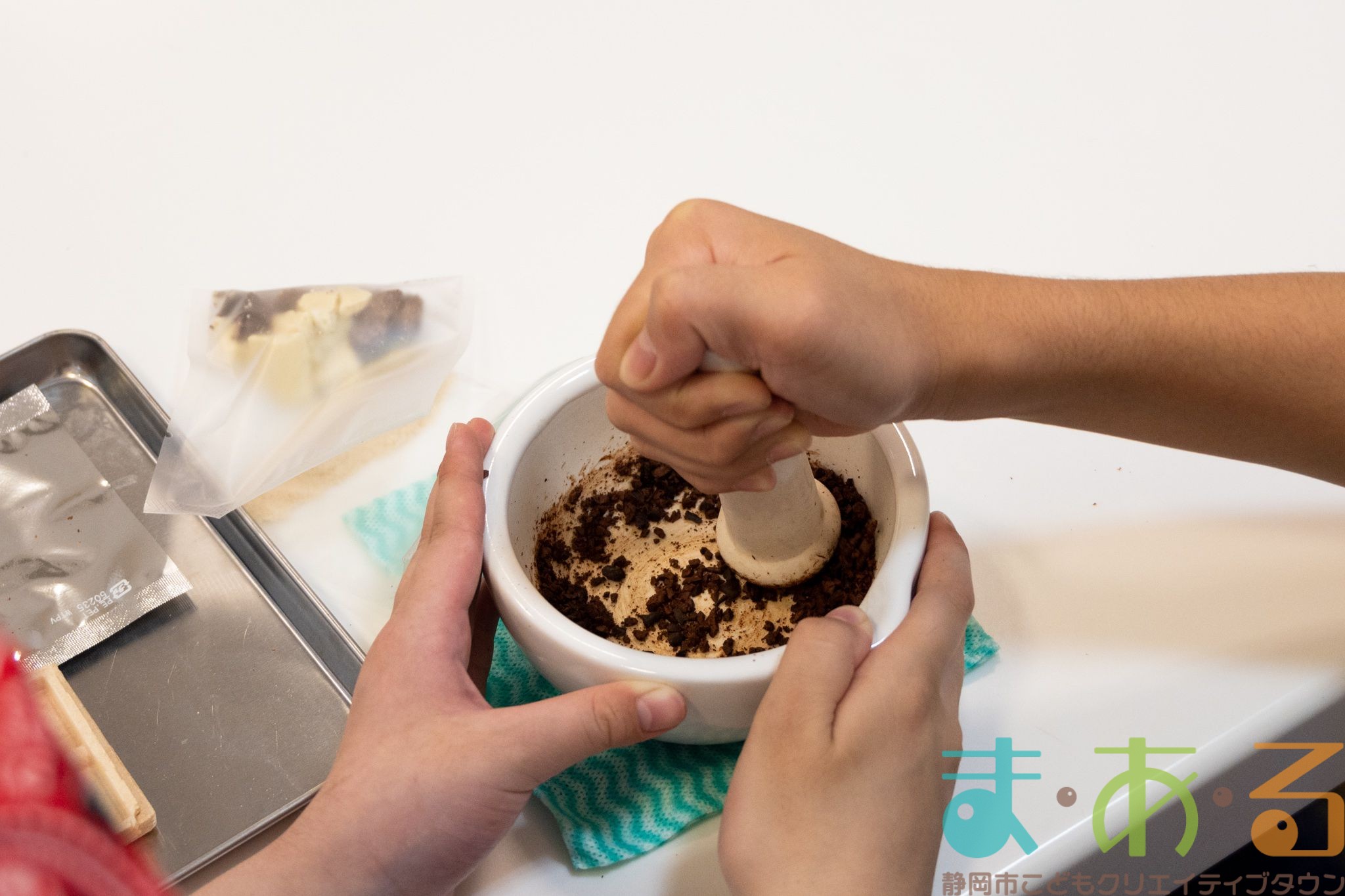 細かい作業に苦戦している方もいましたが、みなさん上手にむけました。むいたカカオ豆を乳鉢に入れてすりつぶしていきます。
