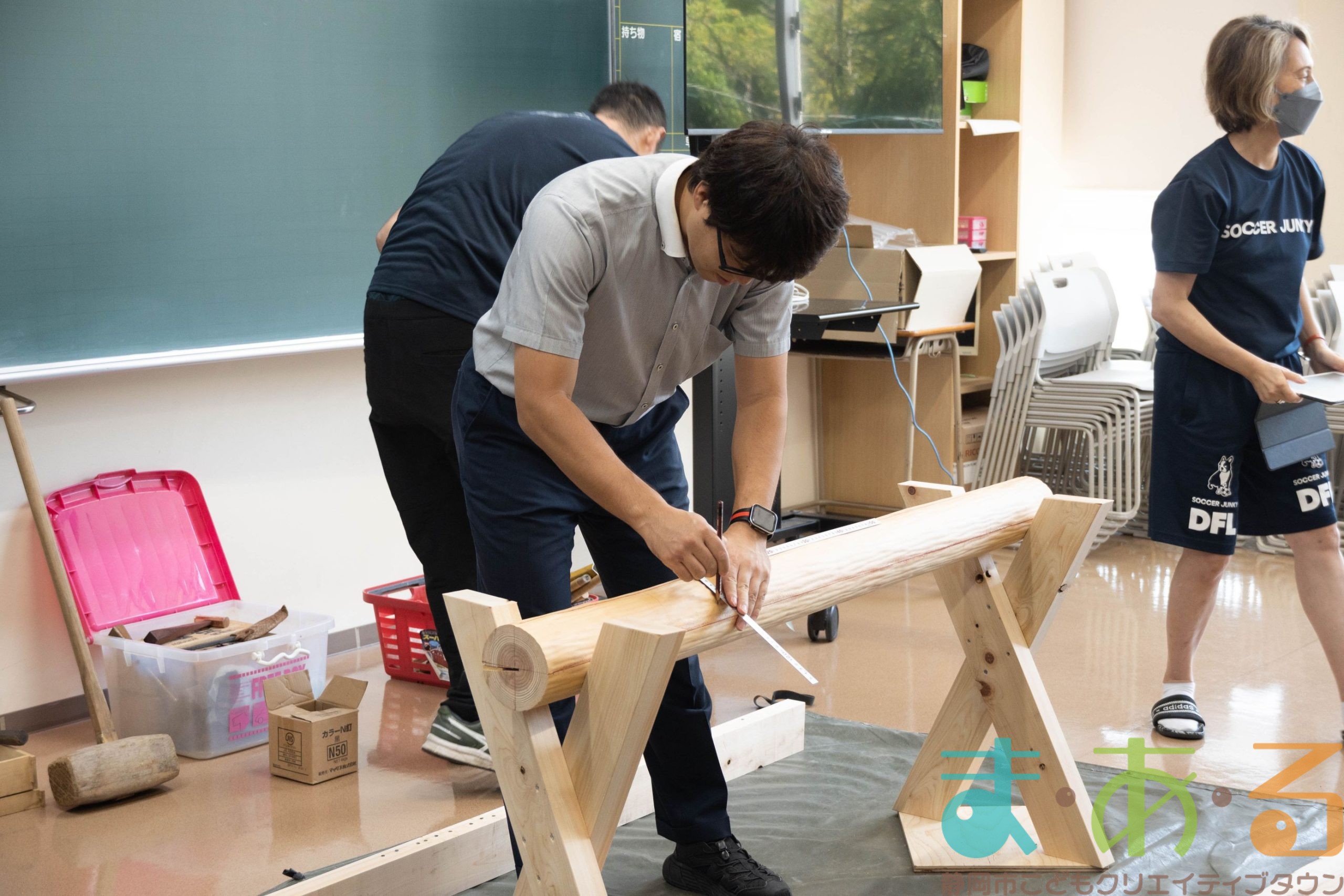 円柱の木材にまっすぐ線を引くのは中々難しそうです。