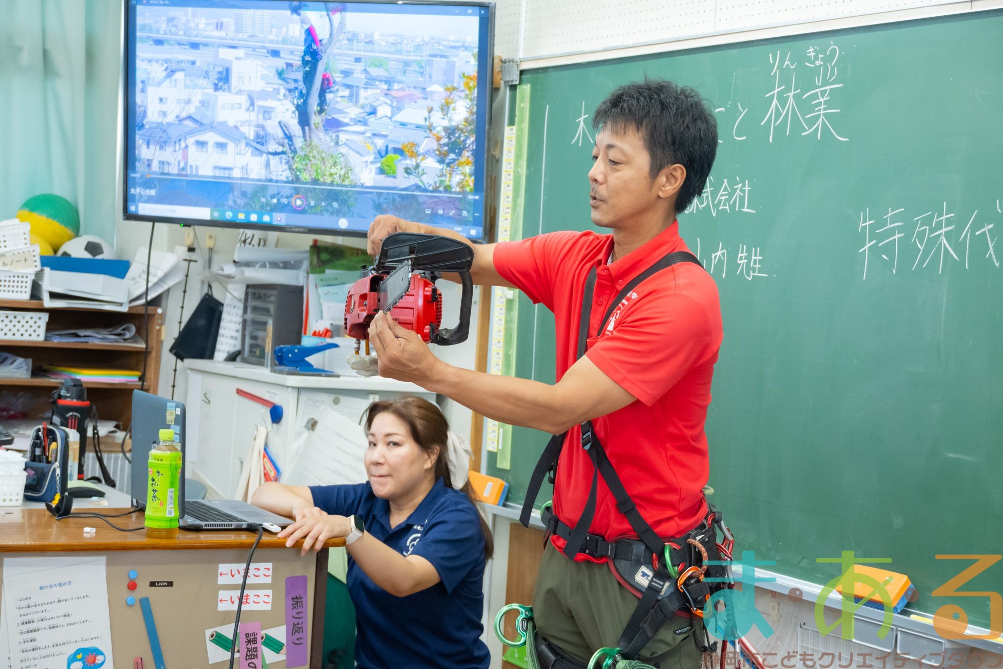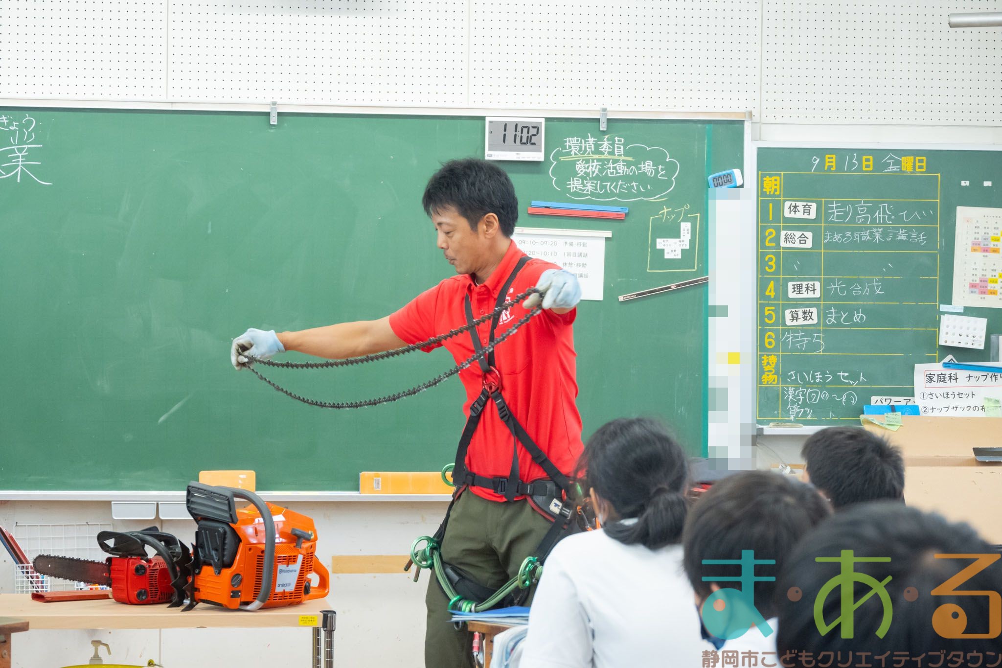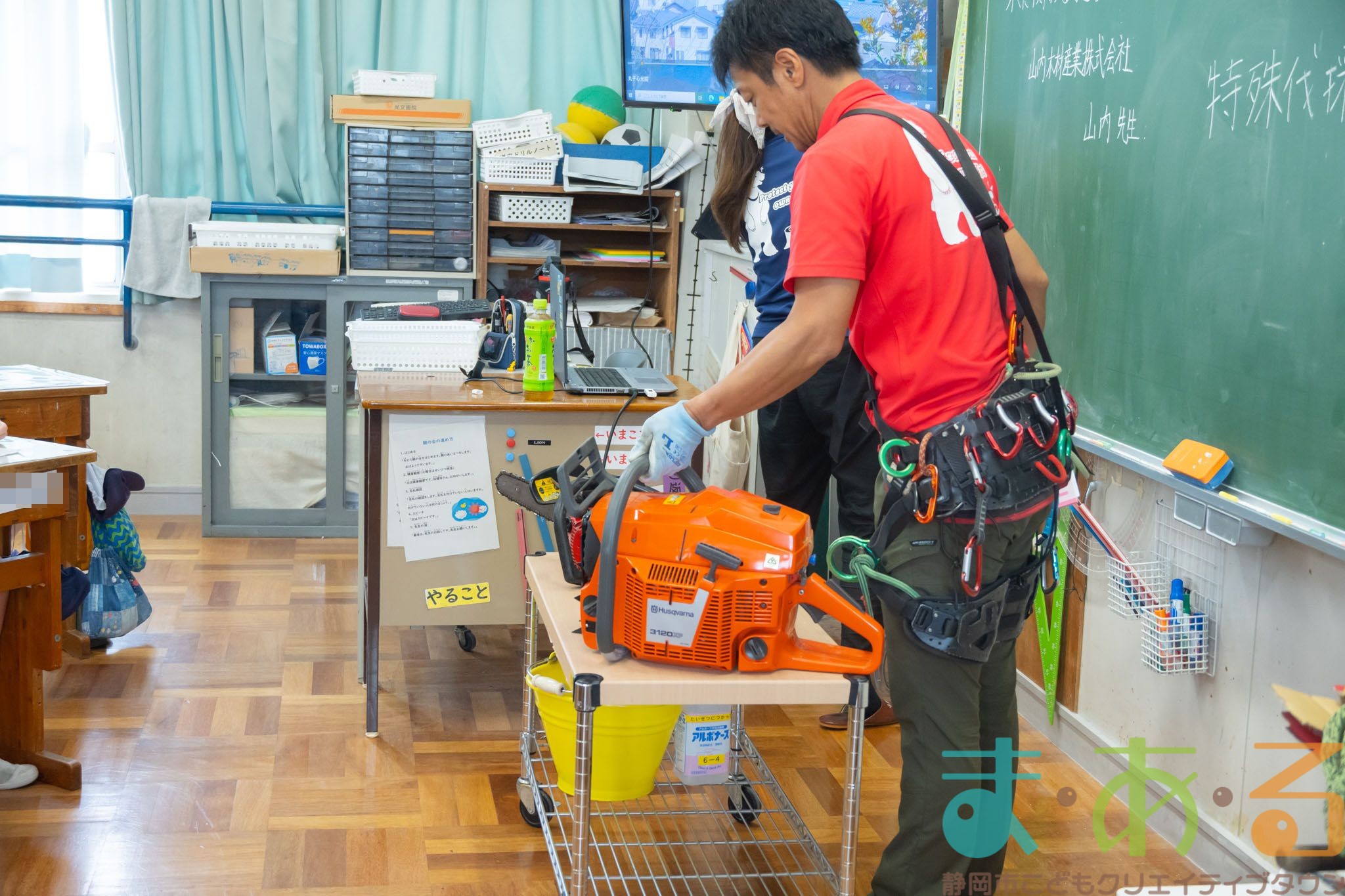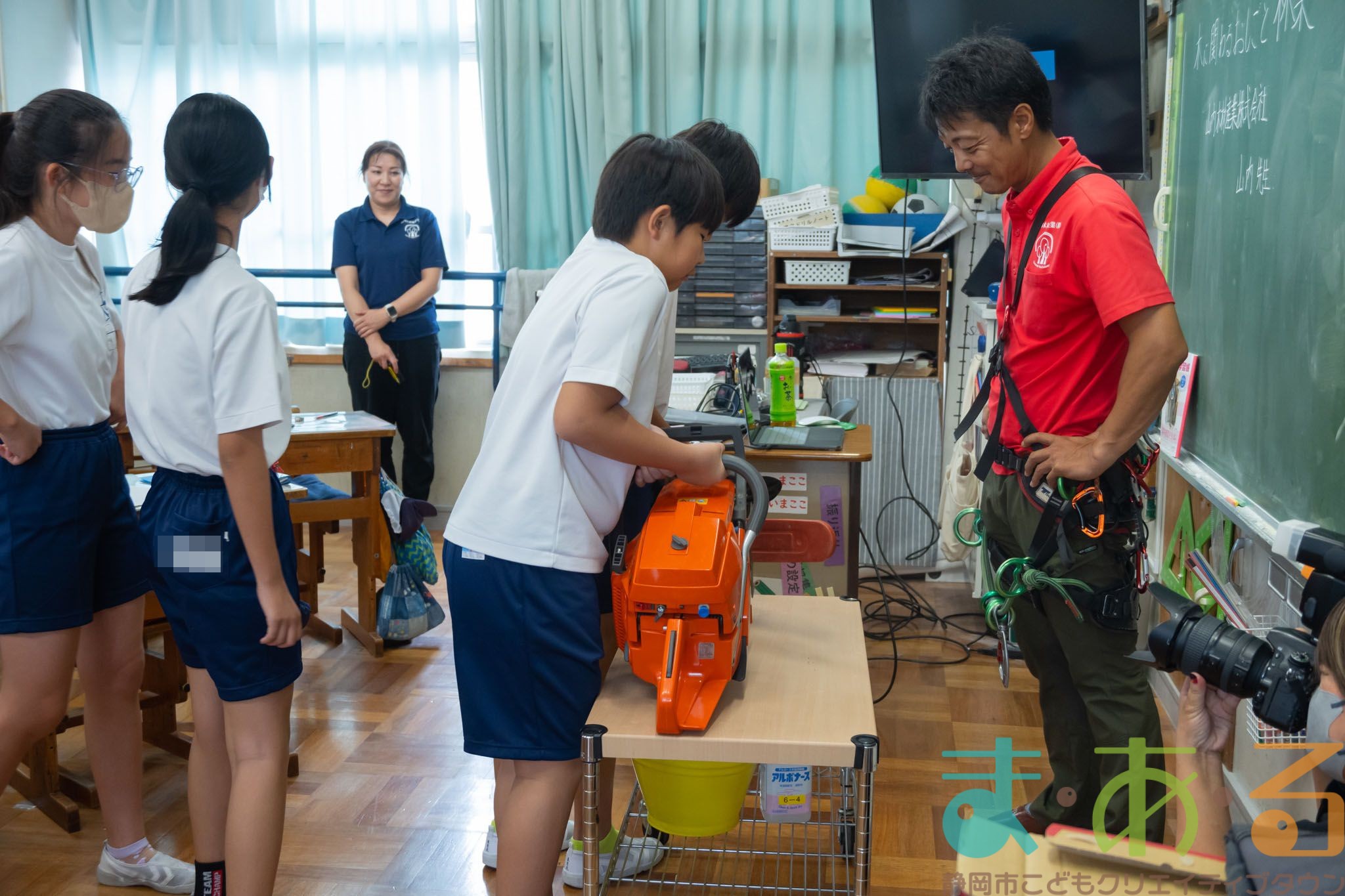 チェーンソーは大きいものだと刃の部分が約1mもあるそうです。初めて見る大きさに皆さん興味深々の様子でした。