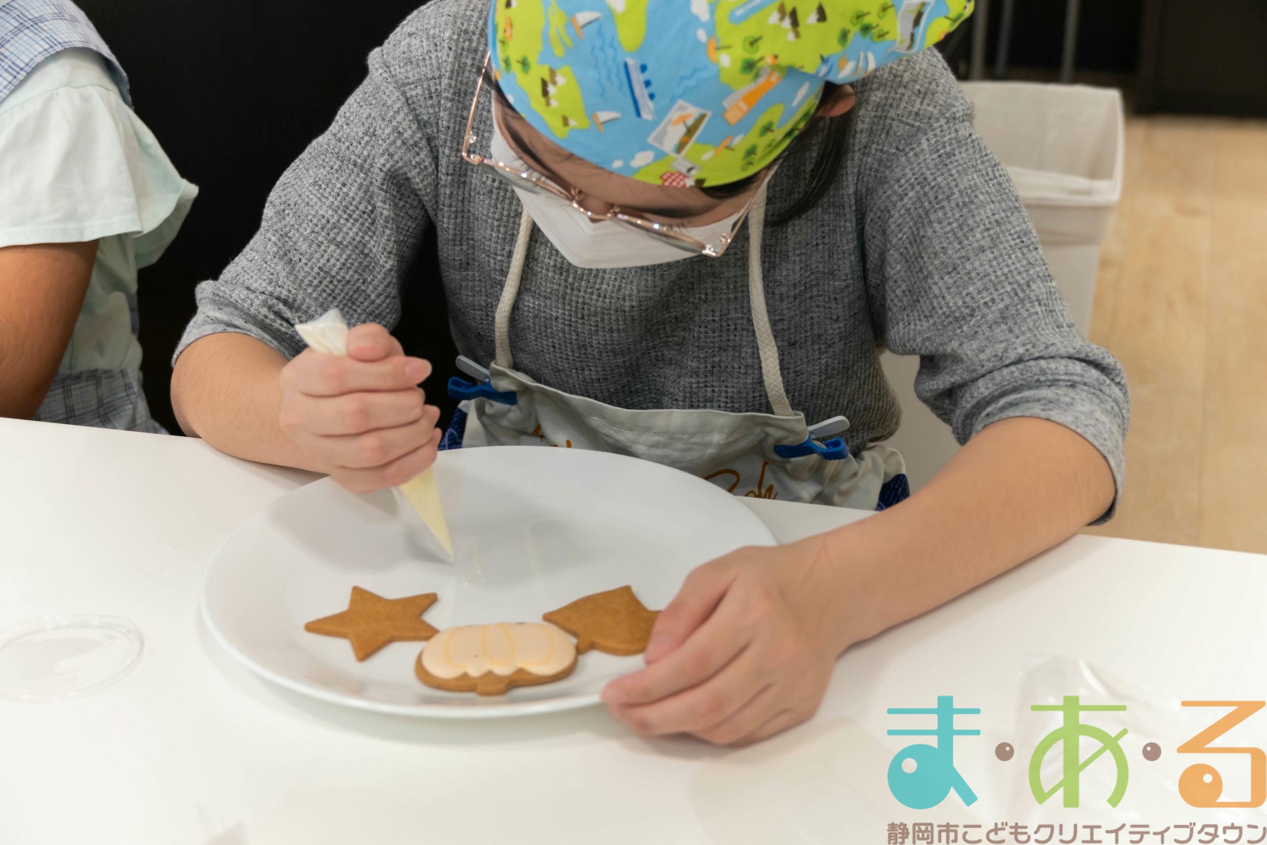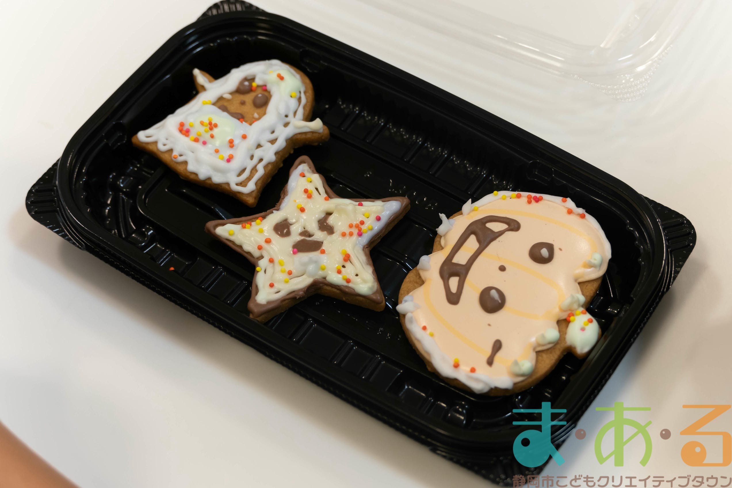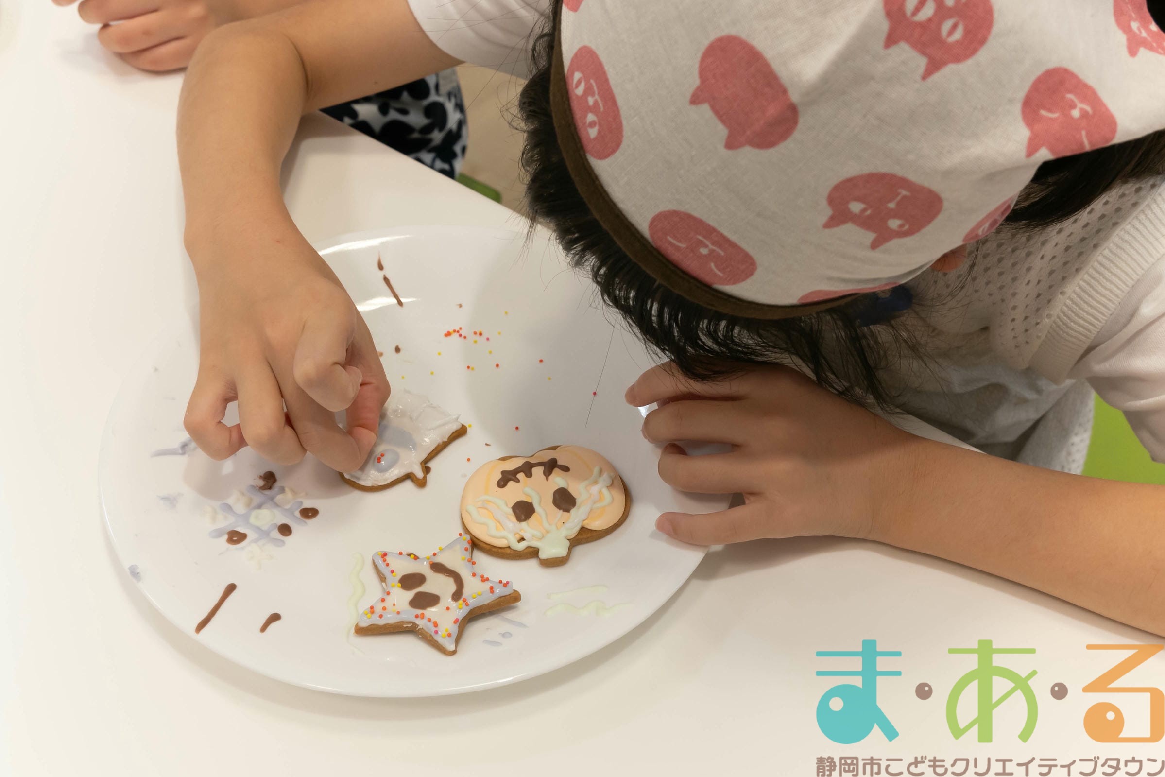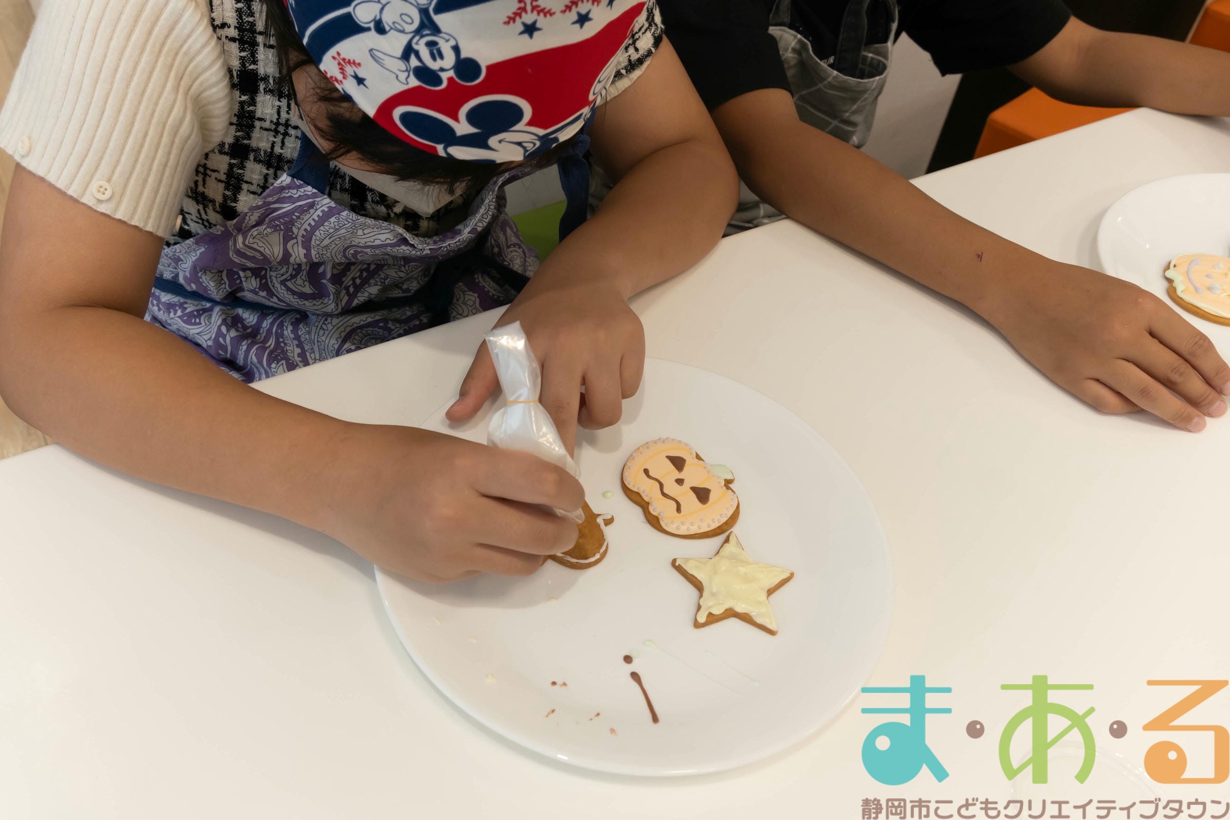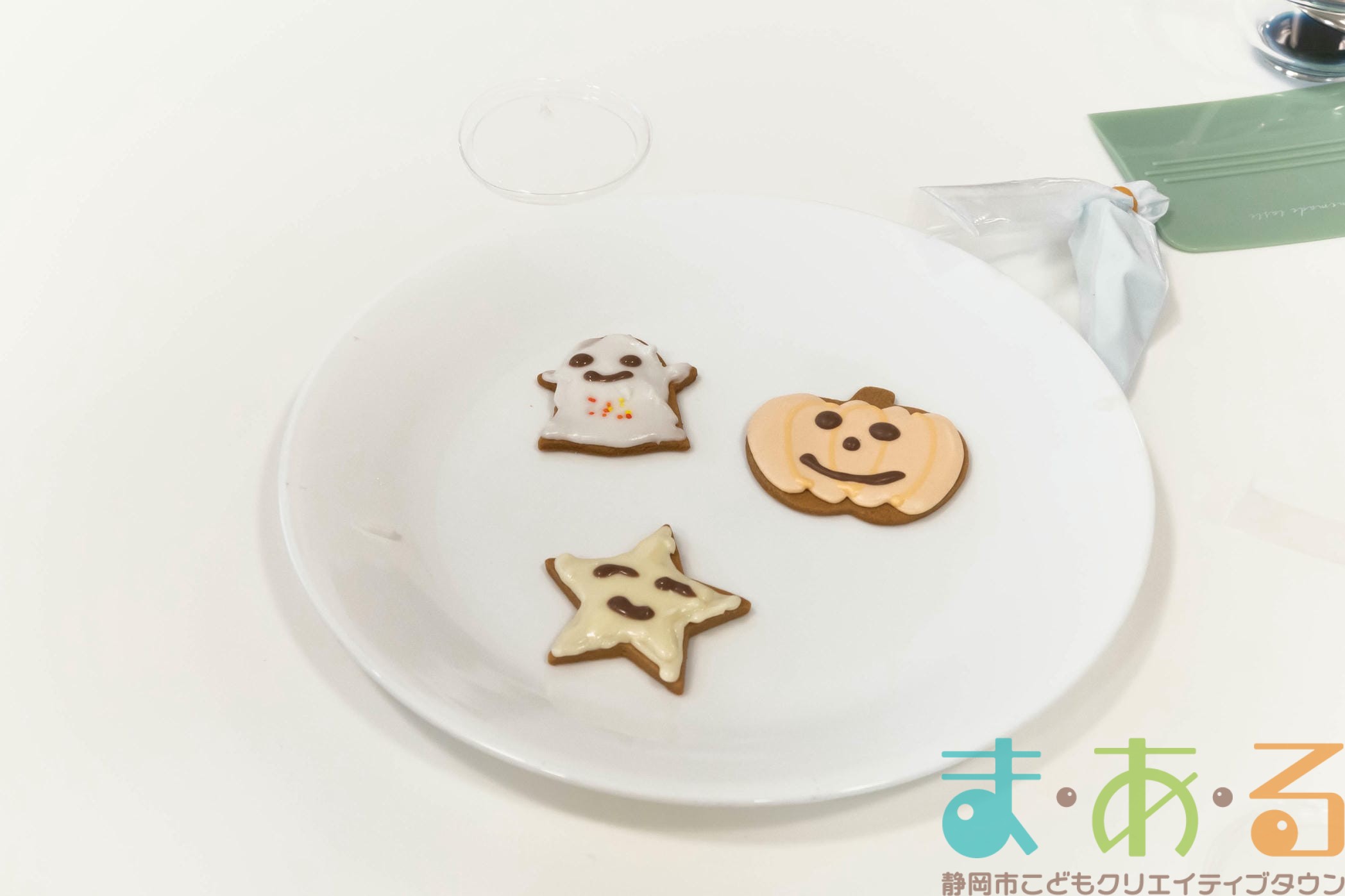 今日は先生が焼いてきてくれた「おばけ」「かぼちゃ」「星」3種類のクッキーに、アイシングクリームを使ってデコレーションをしていきます。