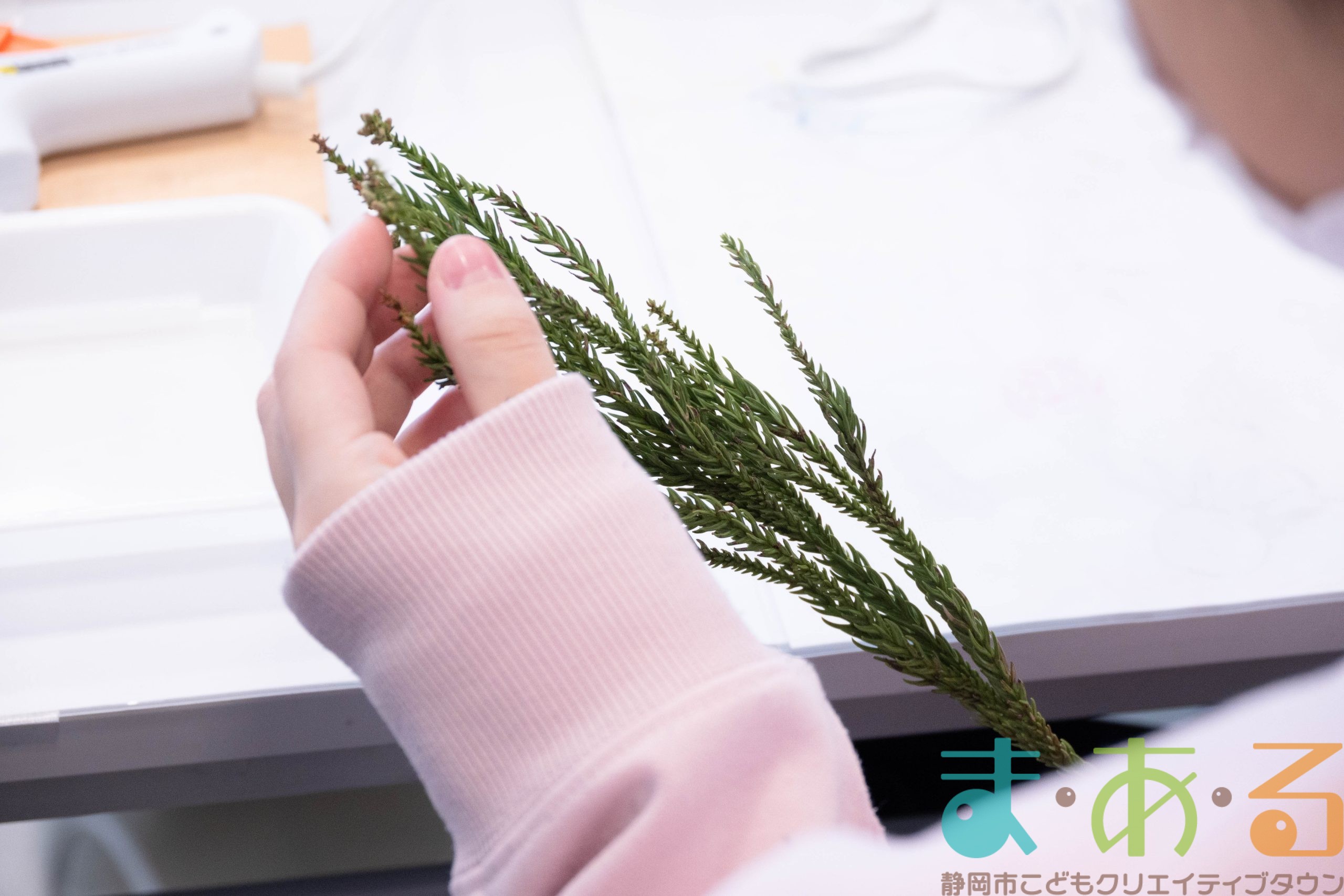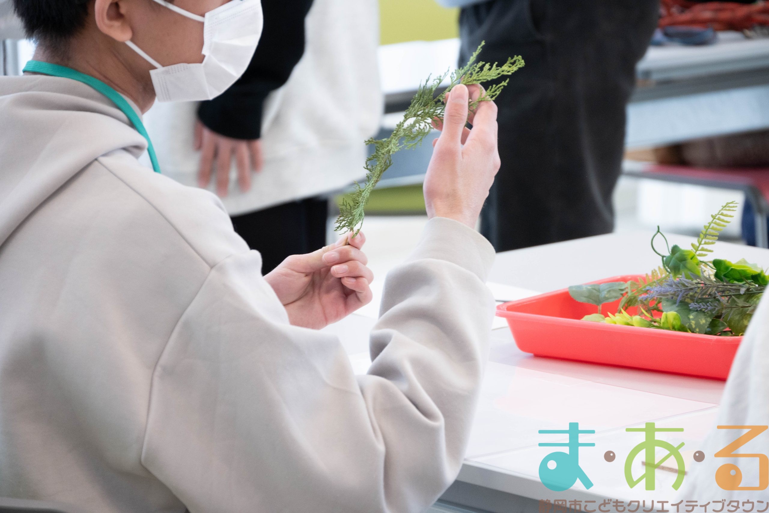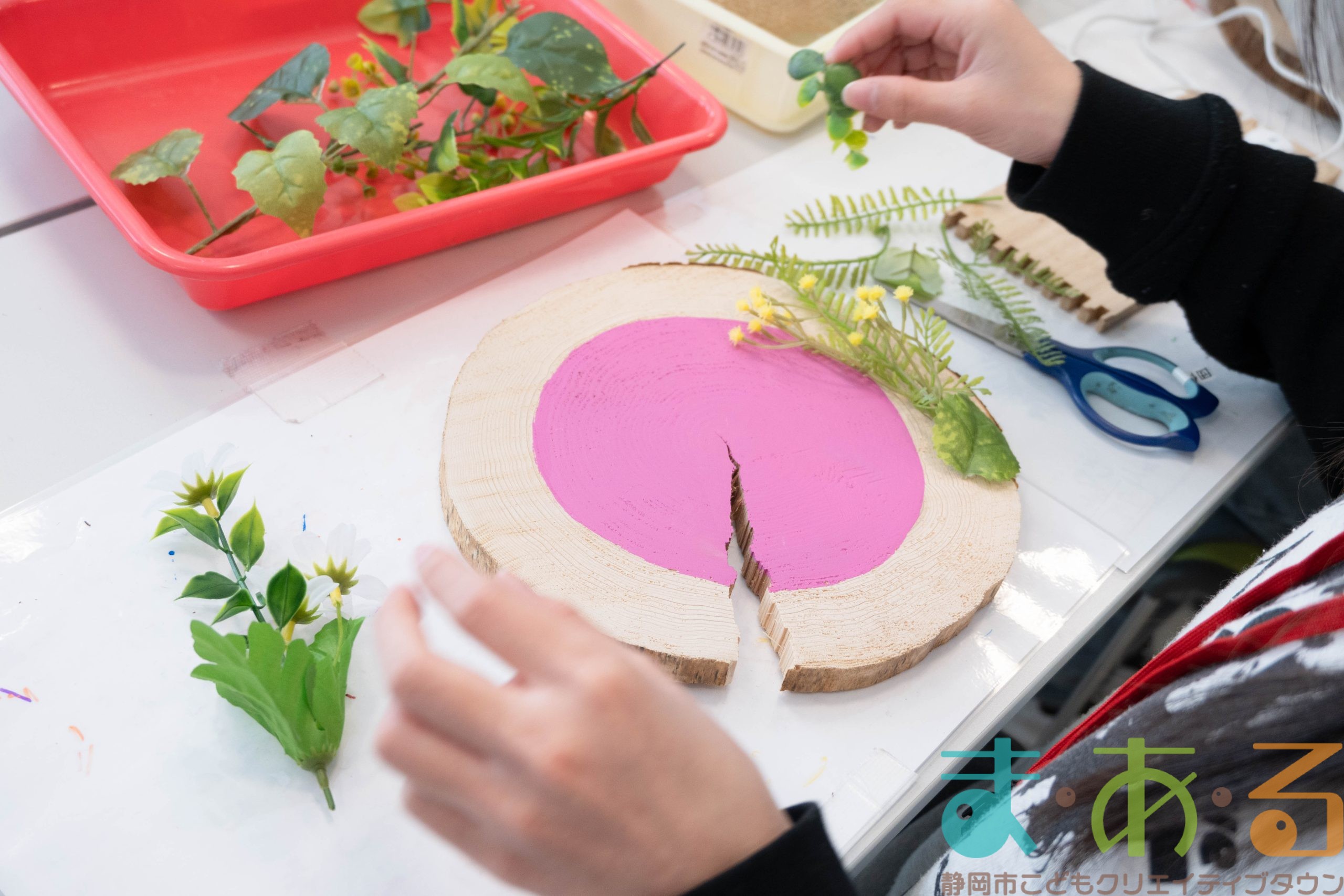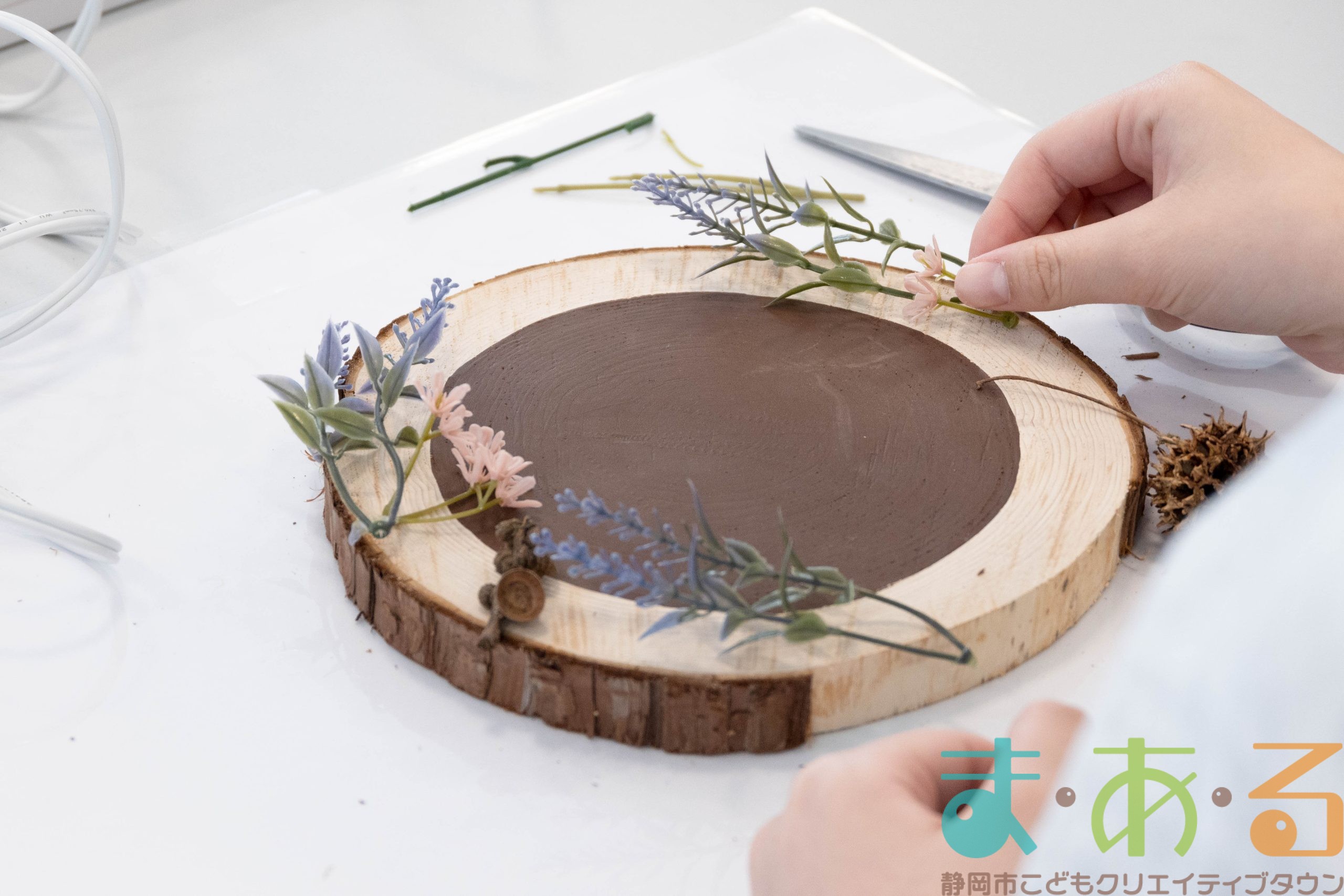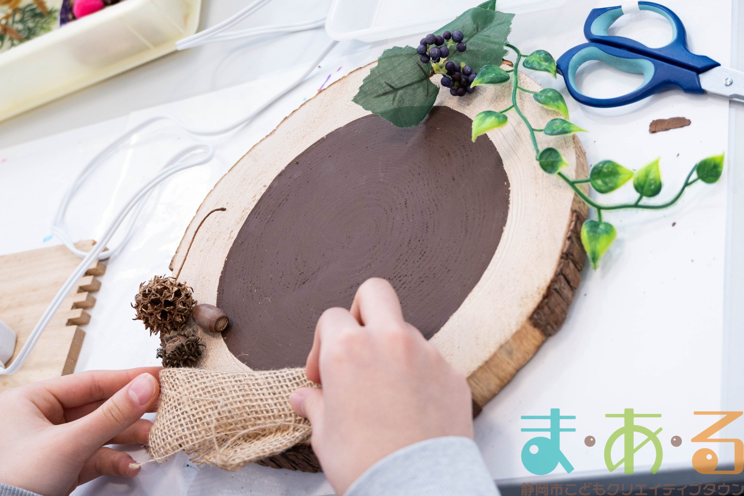 造花や木の実、フェルトボール、タイルなど自由に選びます。