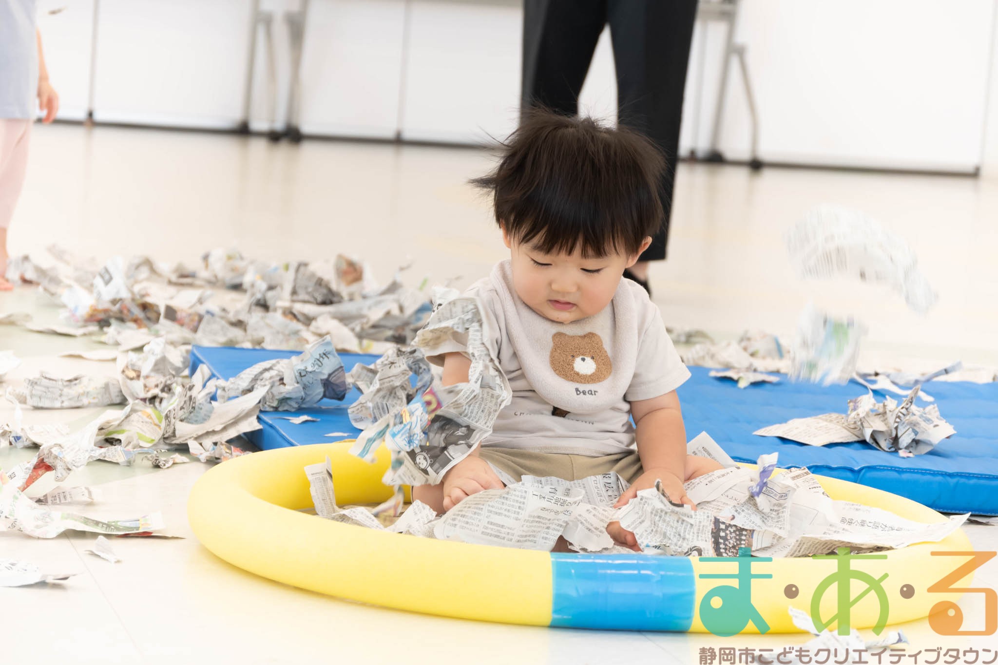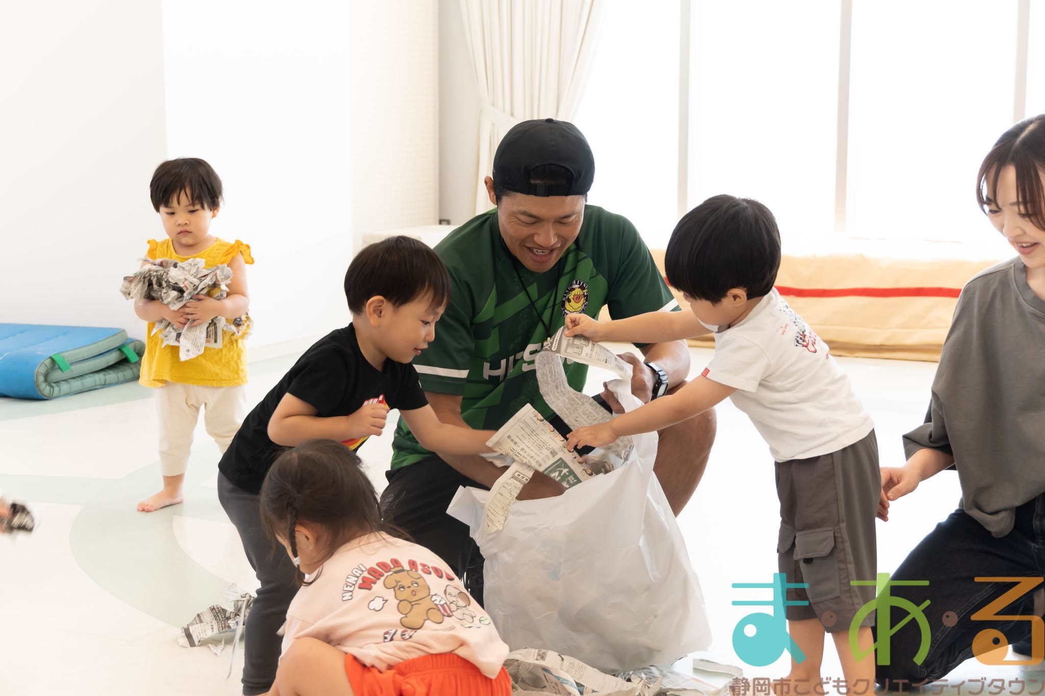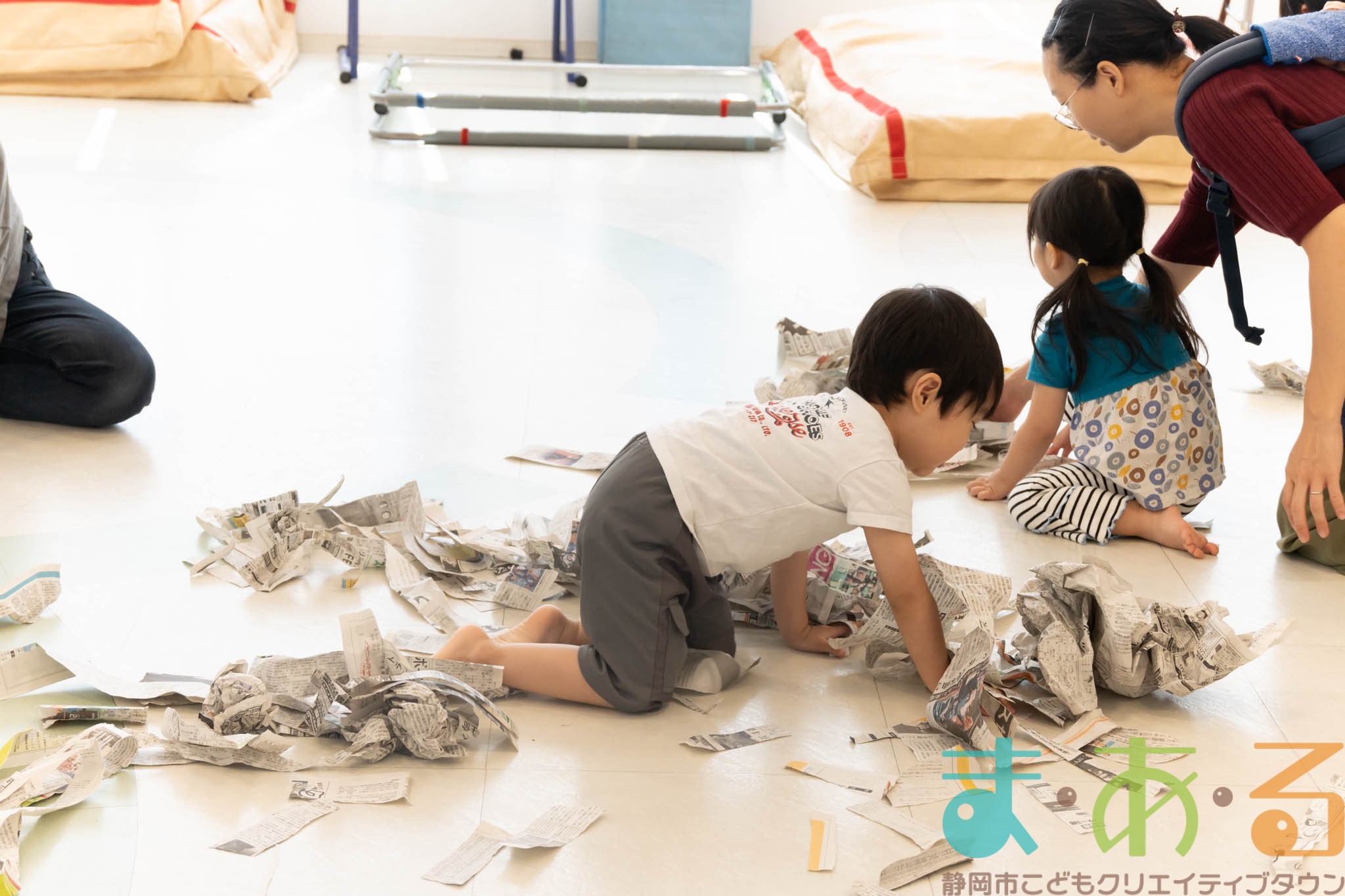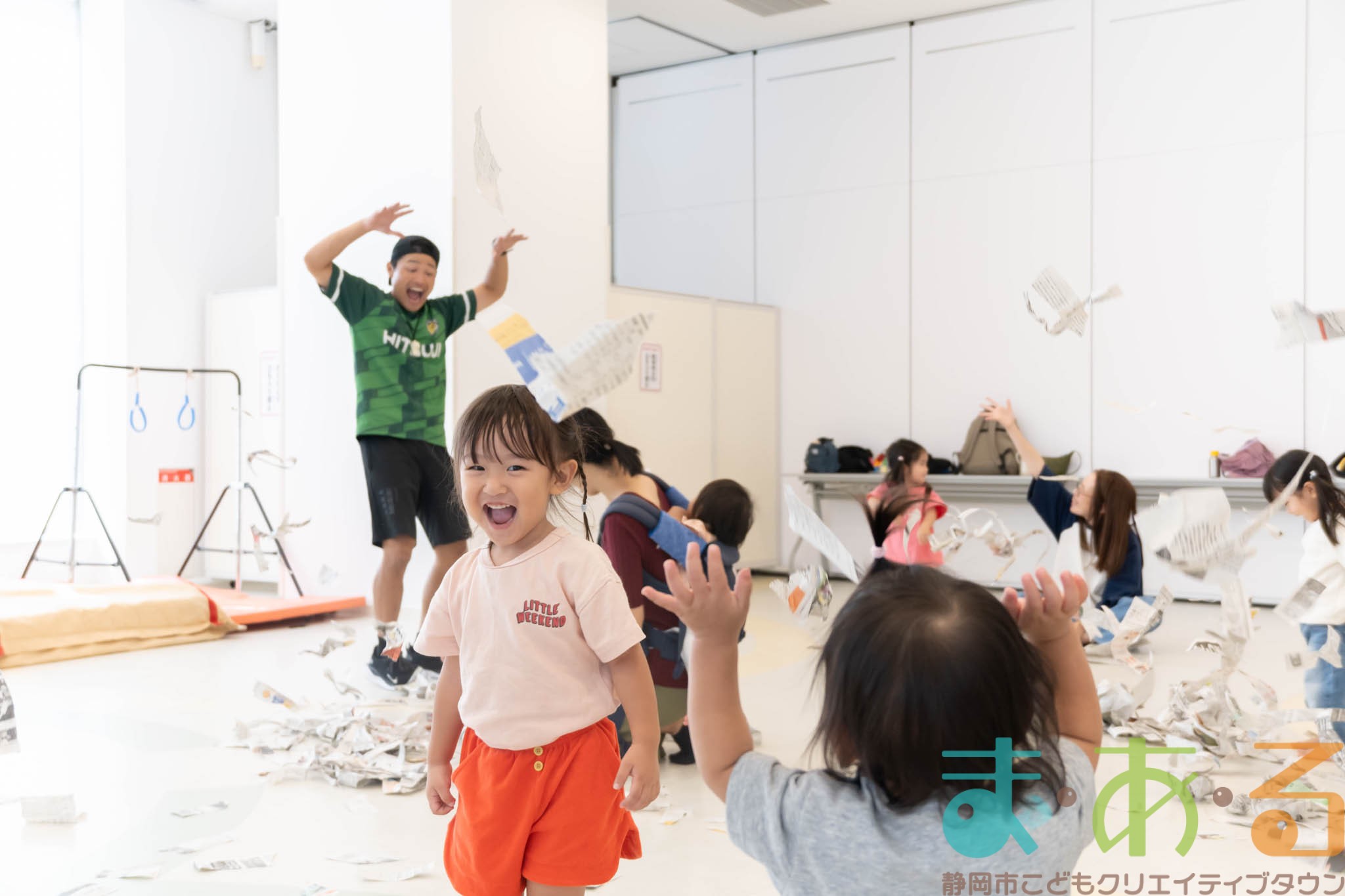 最後は破った新聞紙をブルドーザーみたいに集めて、新聞紙シャワー!