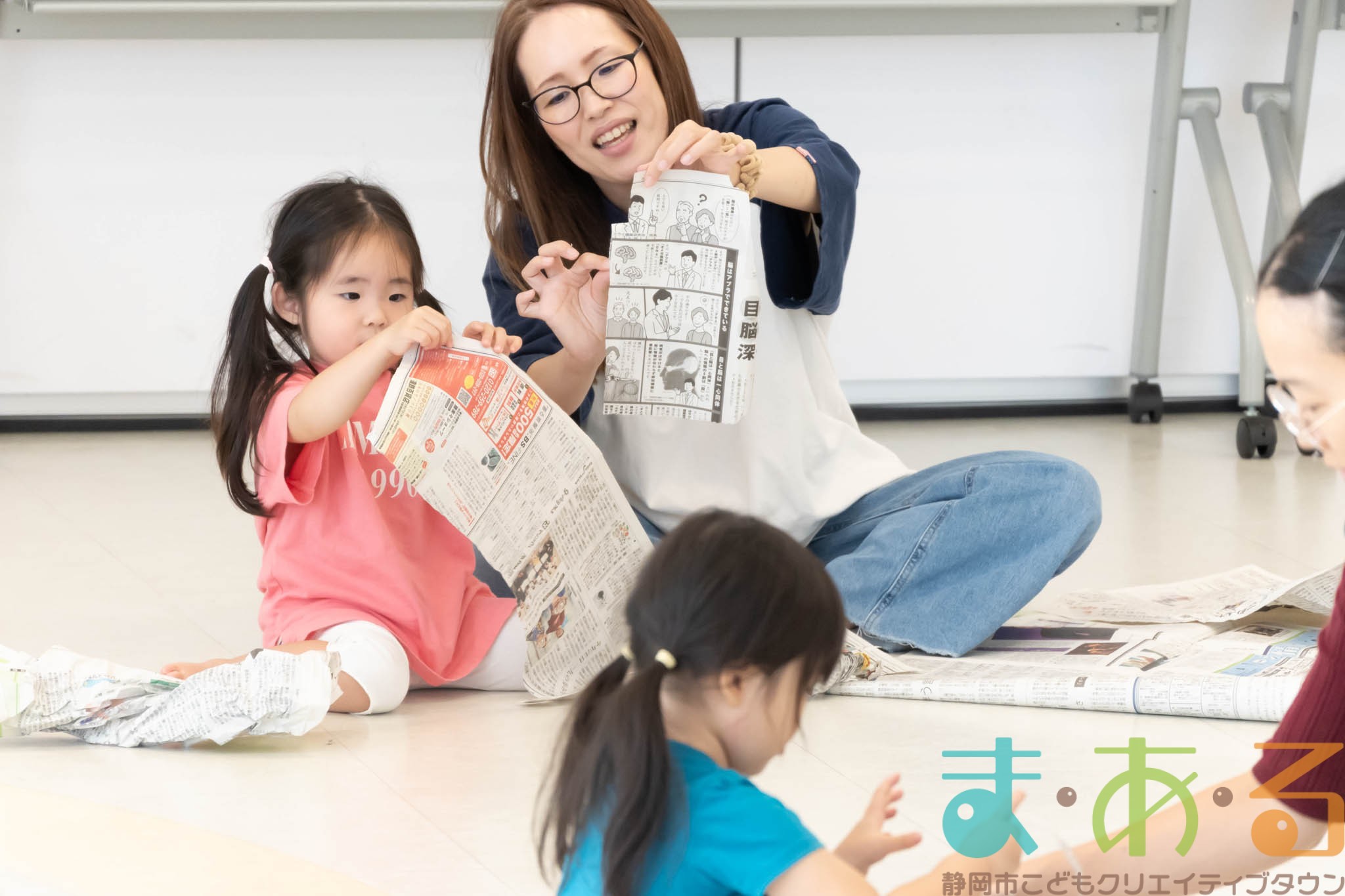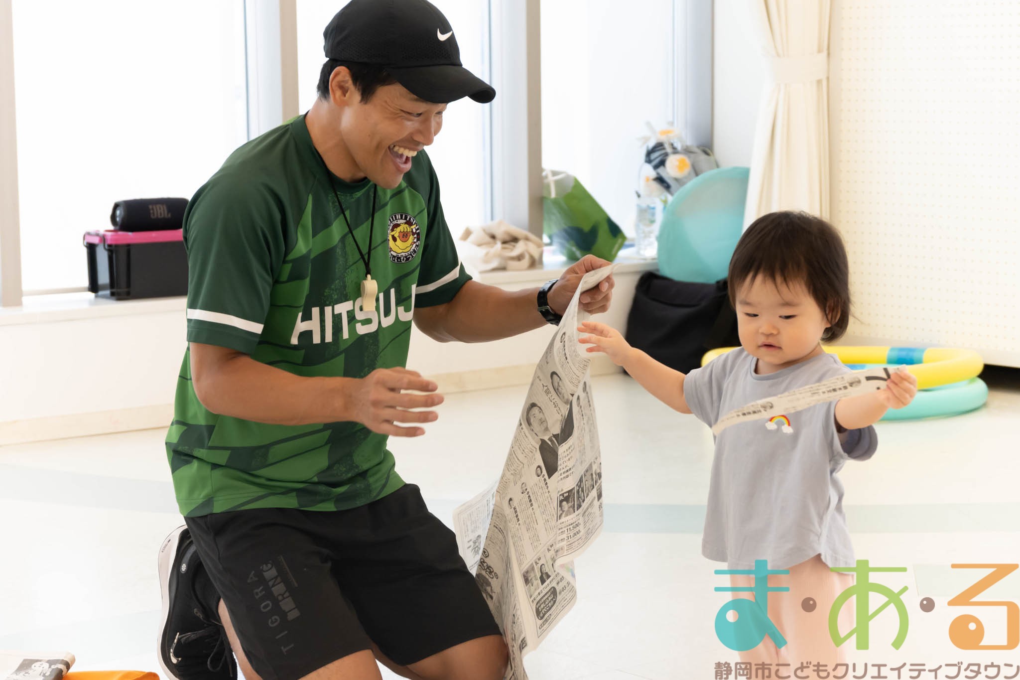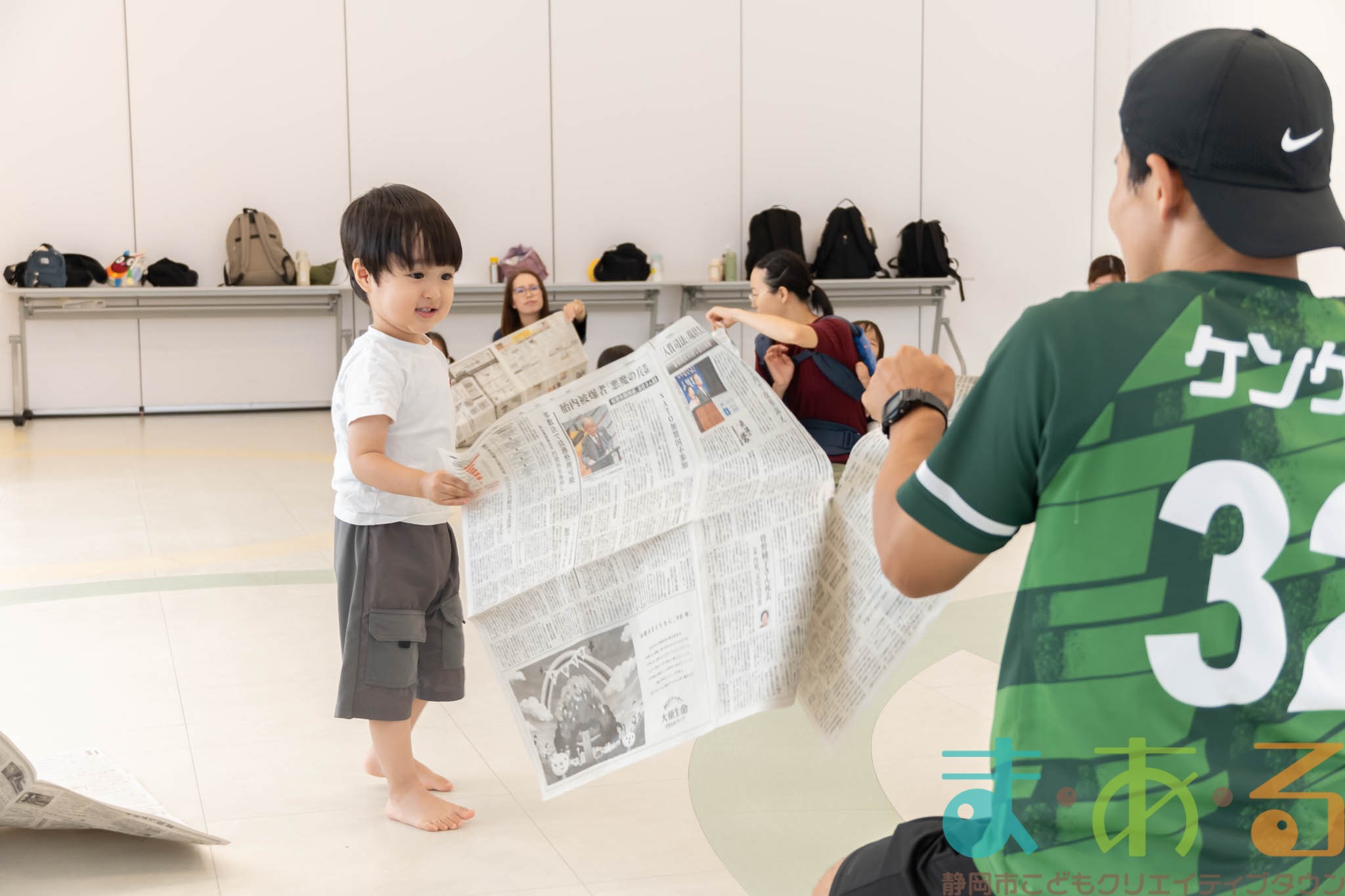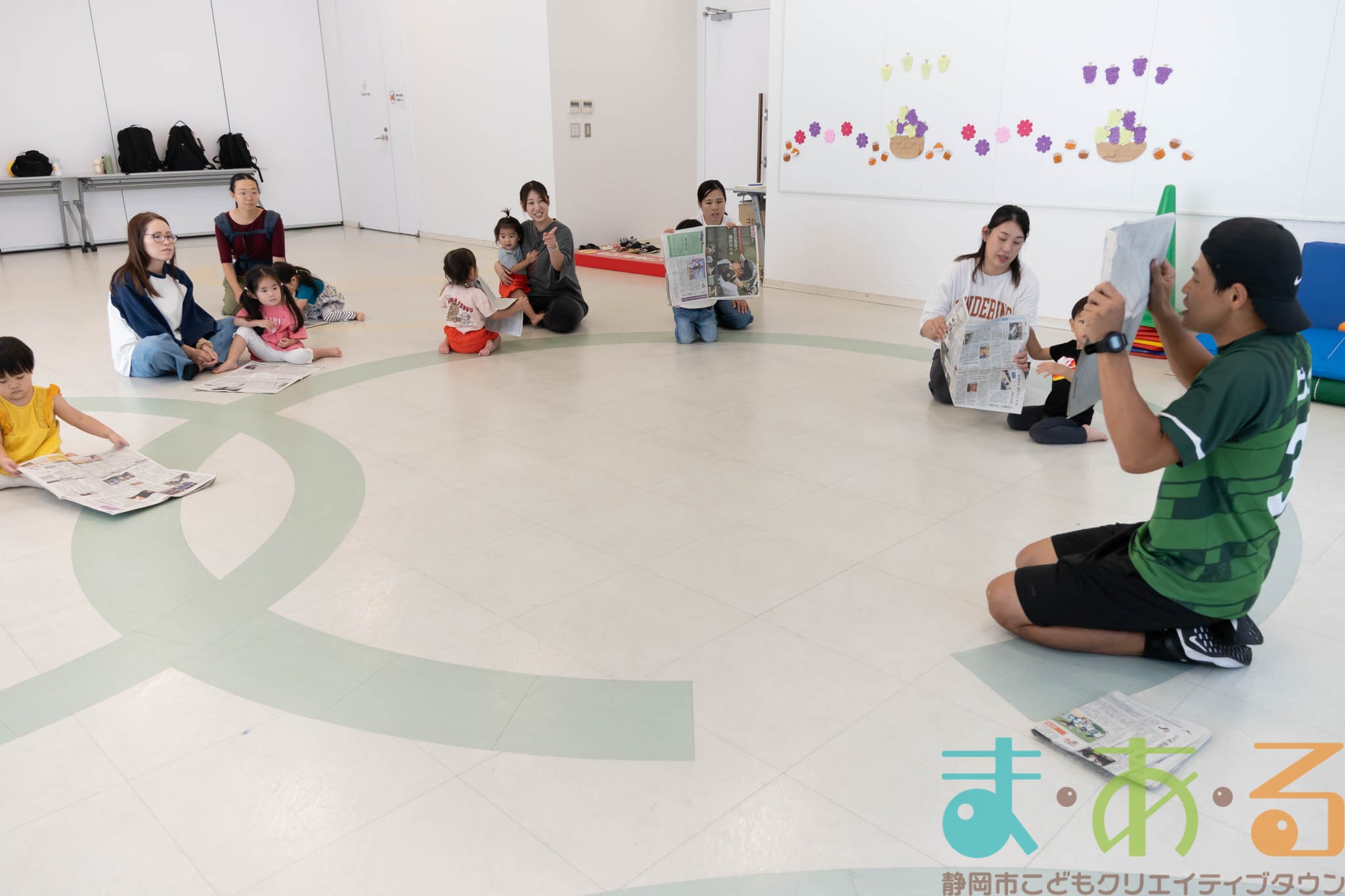 次は、新聞紙の上に座って魔法のじゅうたん。