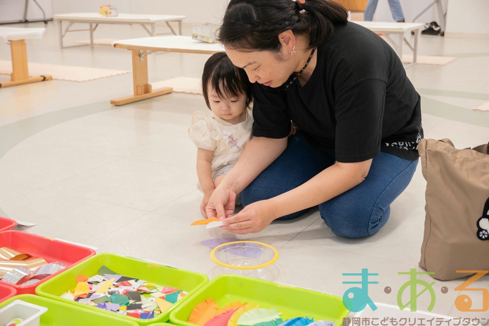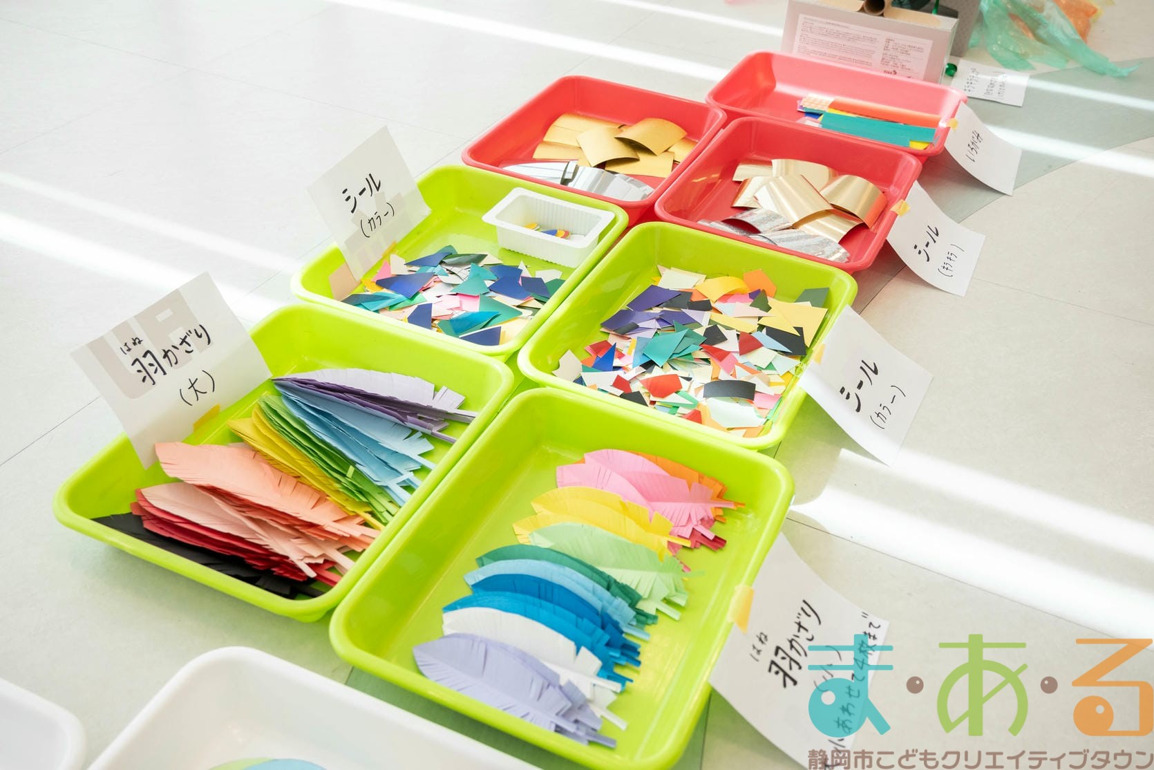 次は飾り付けのための羽やシールを選びます。この羽かざりはこどもバザールのおしごとで小学生の社員さんたちが作ってくれたものです!