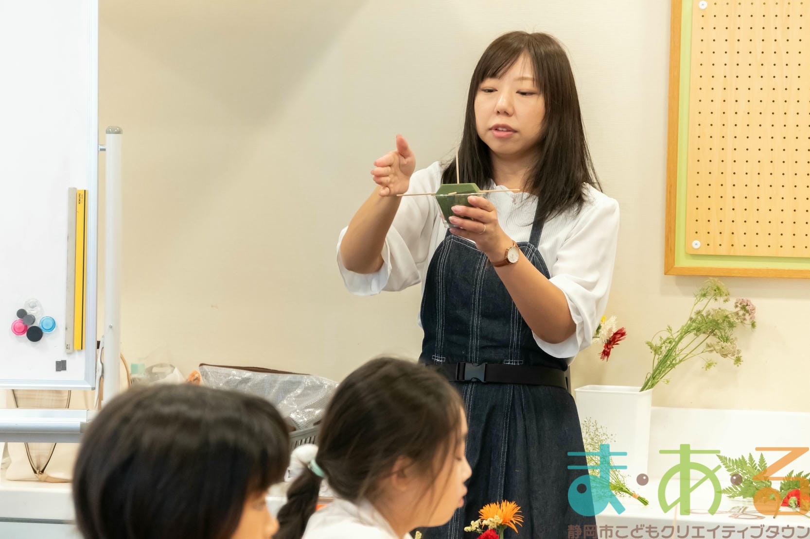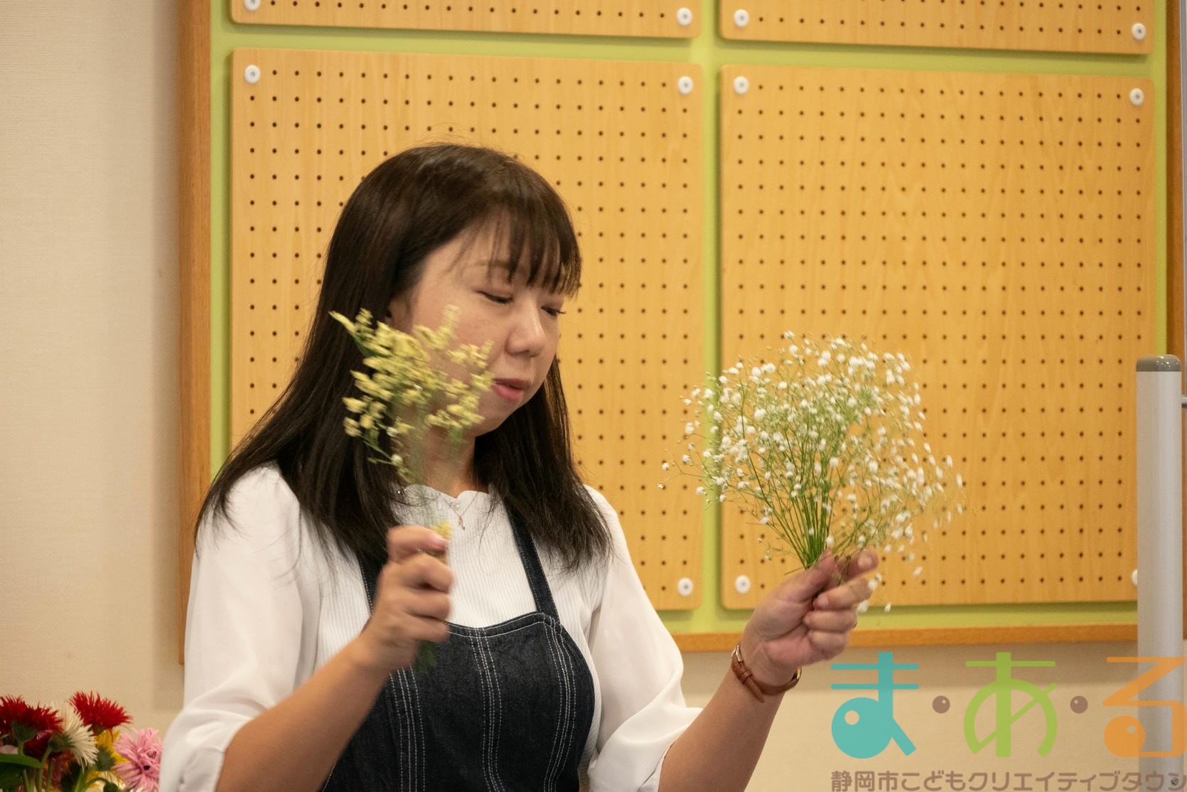 「ポイントは大きいお花から挿して、隙間に小さいお花や葉っぱを挿すといいですよ」と先生からアドバイスをもらいました。