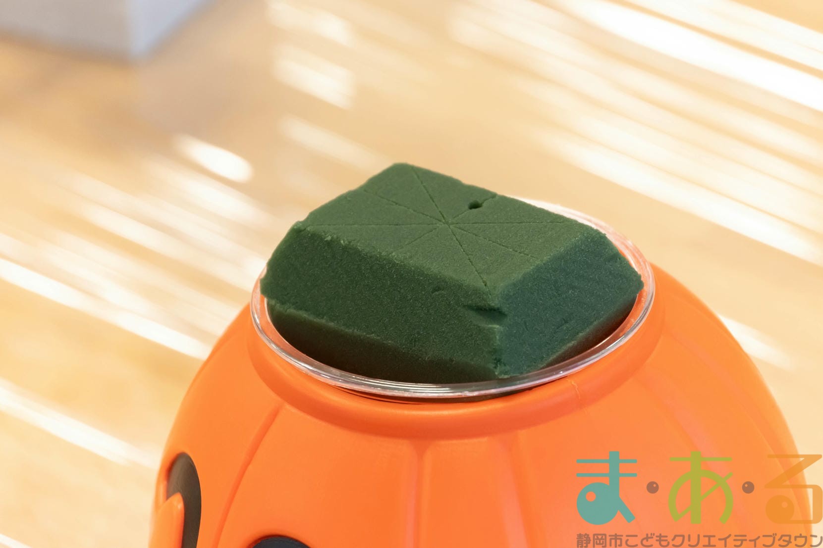 まずは、お花を挿すオアシスという緑色のスポンジに、赤い印がついた棒を差し込みます。