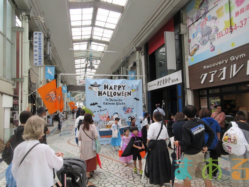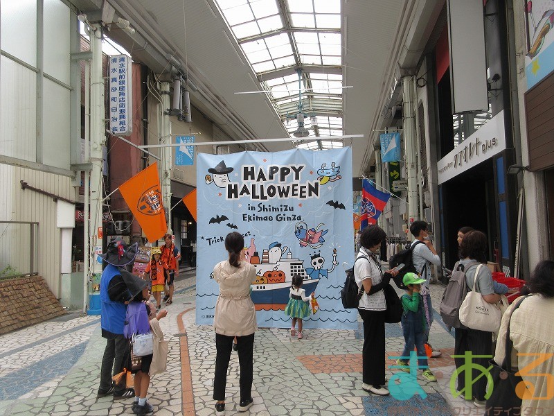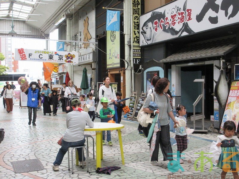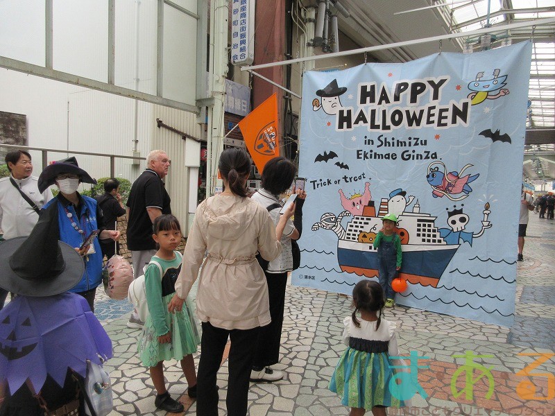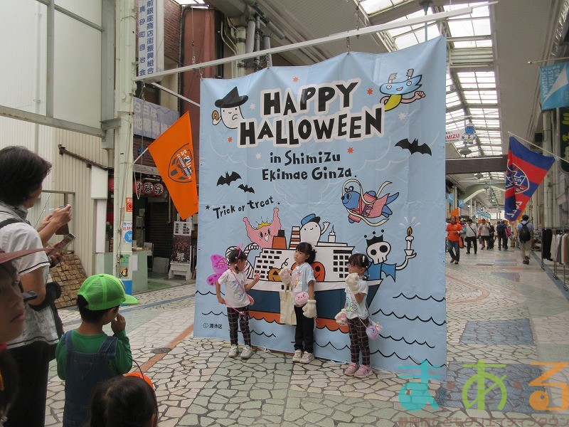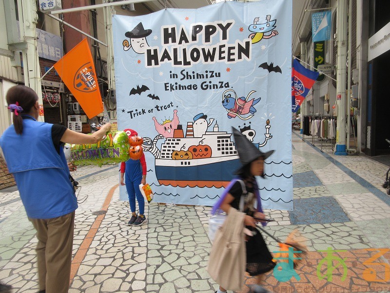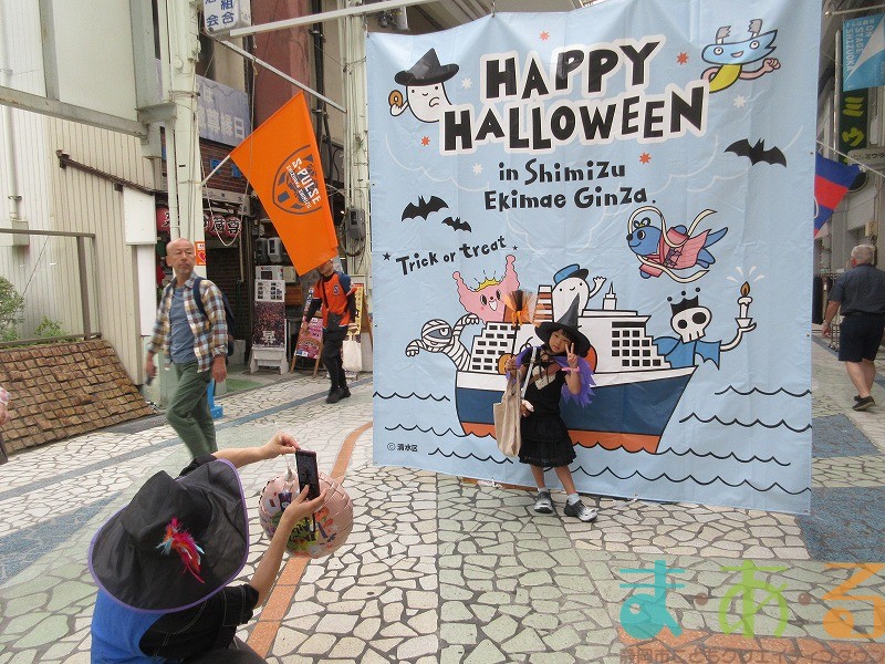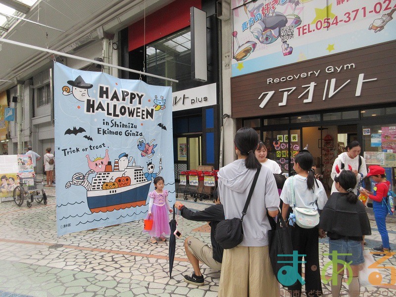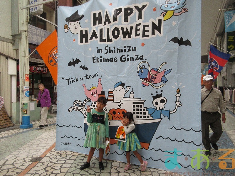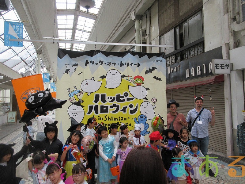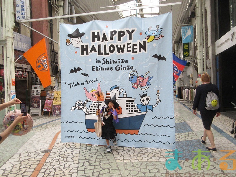 商店街のアーケード入り口にたどり着くと、外国人の観光客がたくさんいて「ハッピーハロウィン♪」とこどもたちに声をかけてくれました。この日はちょうど大型客船が清水港に寄稿していたので、そこからの観光客が特に多い日でした。