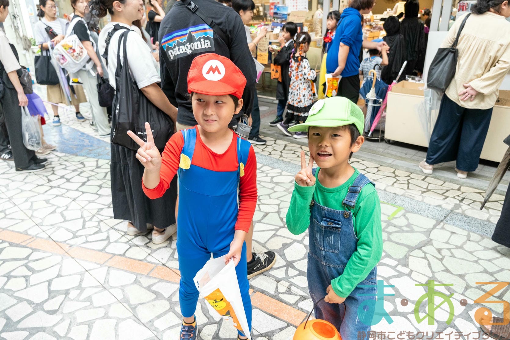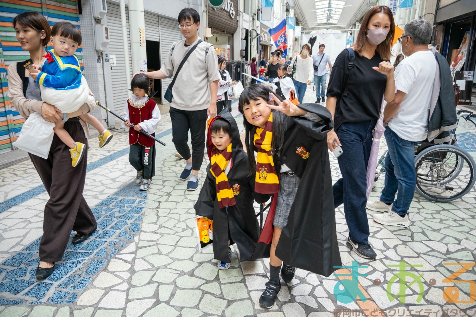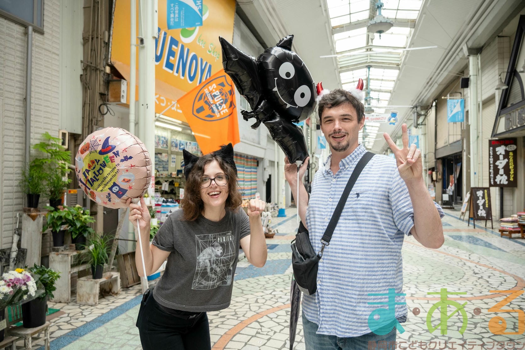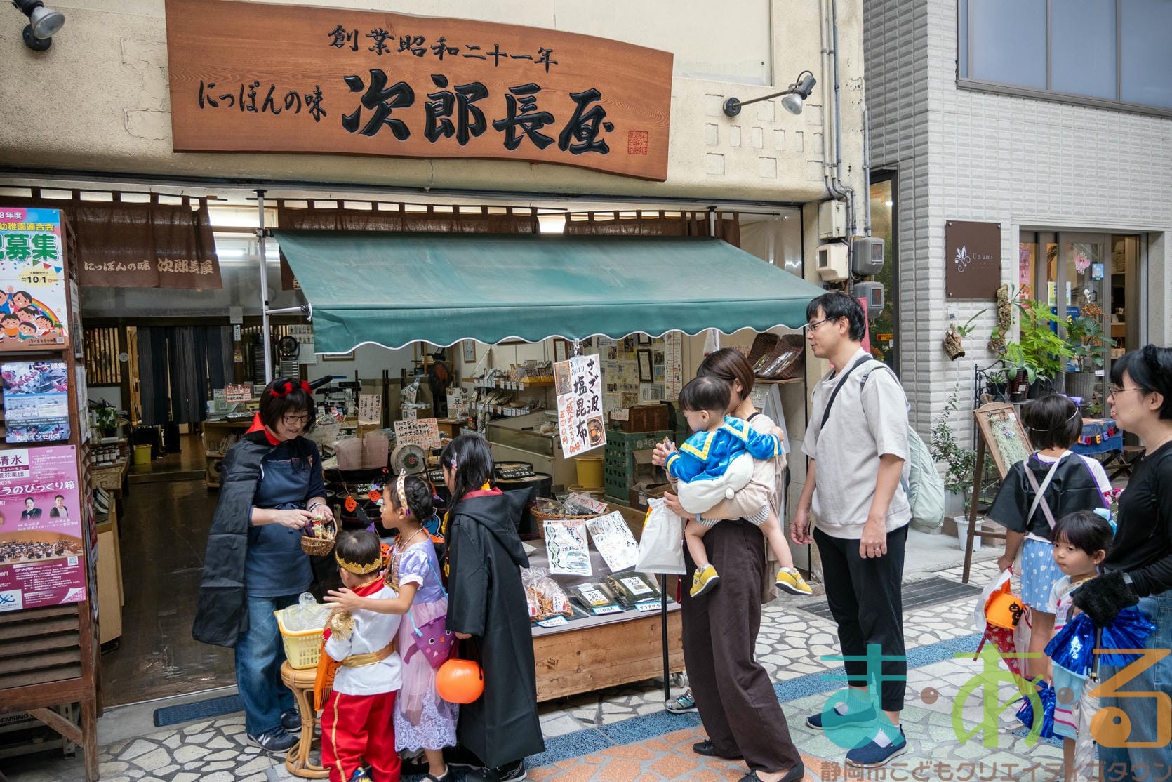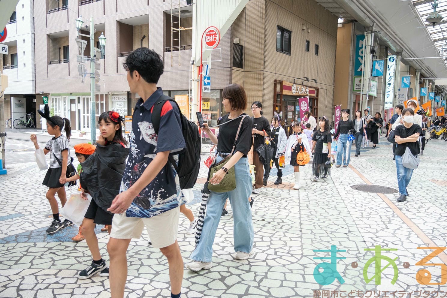 商店街のアーケード入り口にたどり着くと、外国人の観光客がたくさんいて「ハッピーハロウィン♪」とこどもたちに声をかけてくれました。この日はちょうど大型客船が清水港に寄稿していたので、そこからの観光客が特に多い日でした。