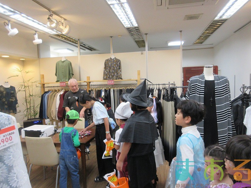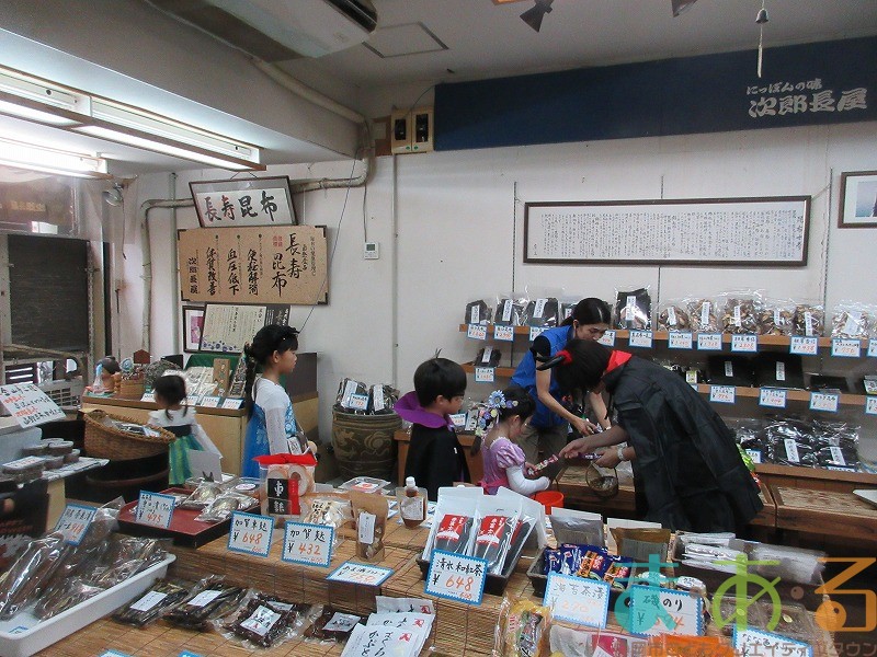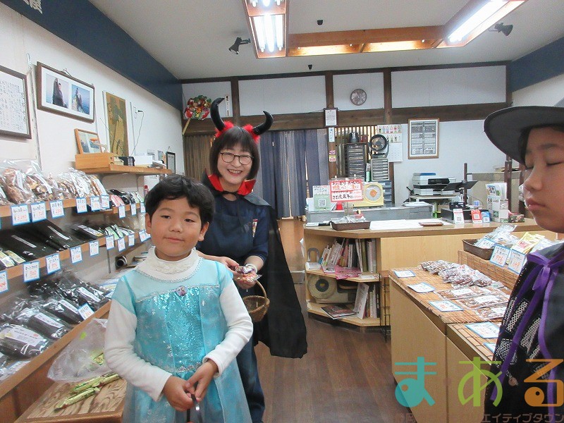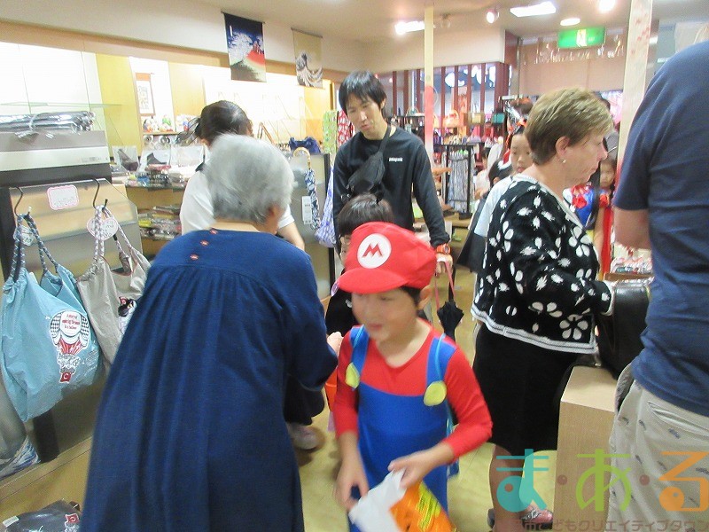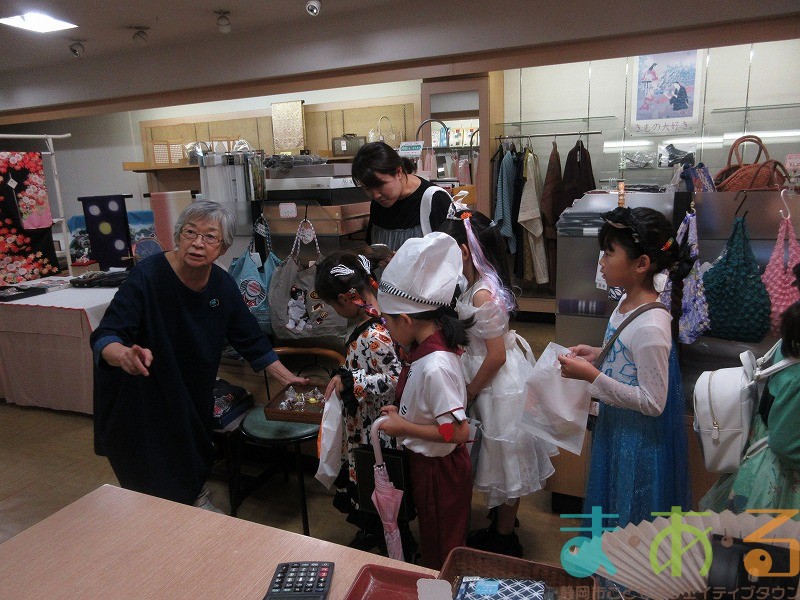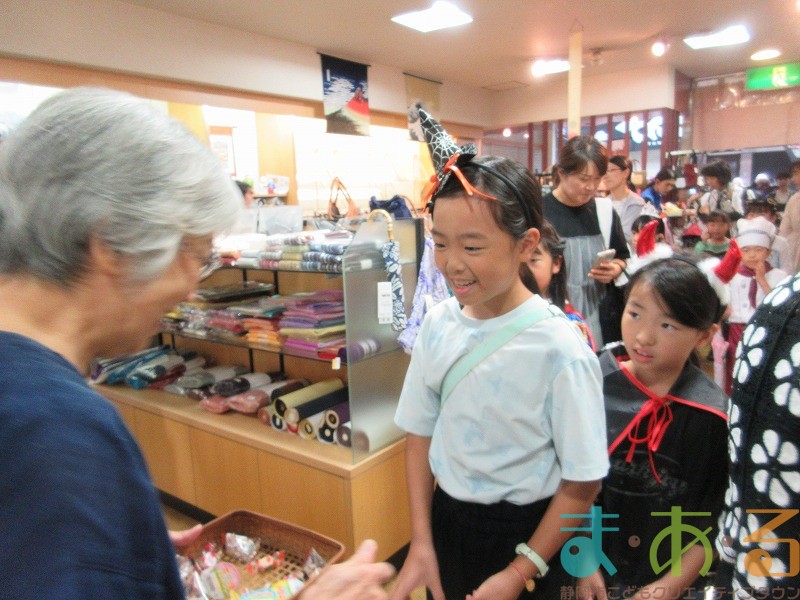 最初に目指すお店は「きもの 丸京」さんです。外国人の方の接客でお忙しい中、お店の方がこどもたちにお菓子を渡してくれました。