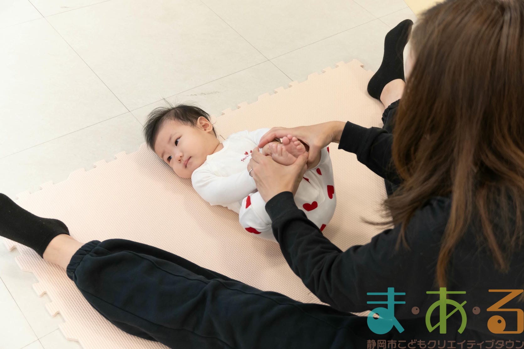 ハイハイの動きに繋がる膝の曲げ伸ばしや腕の運動で、赤ちゃんたちの身体も少しずつリラックスしてきたかな?