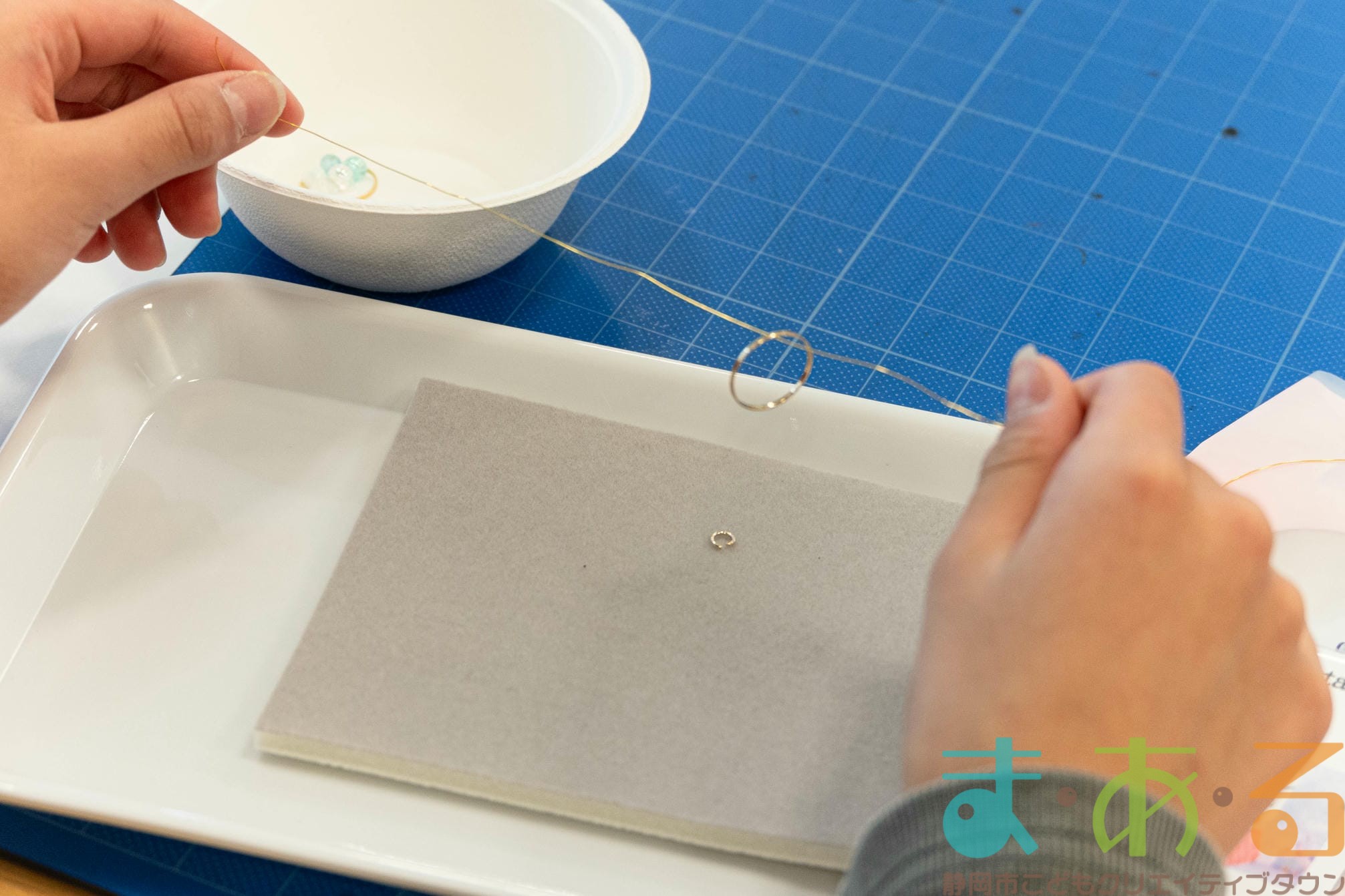 続いて、フープにワイヤーを通す方法を先生から学びます。