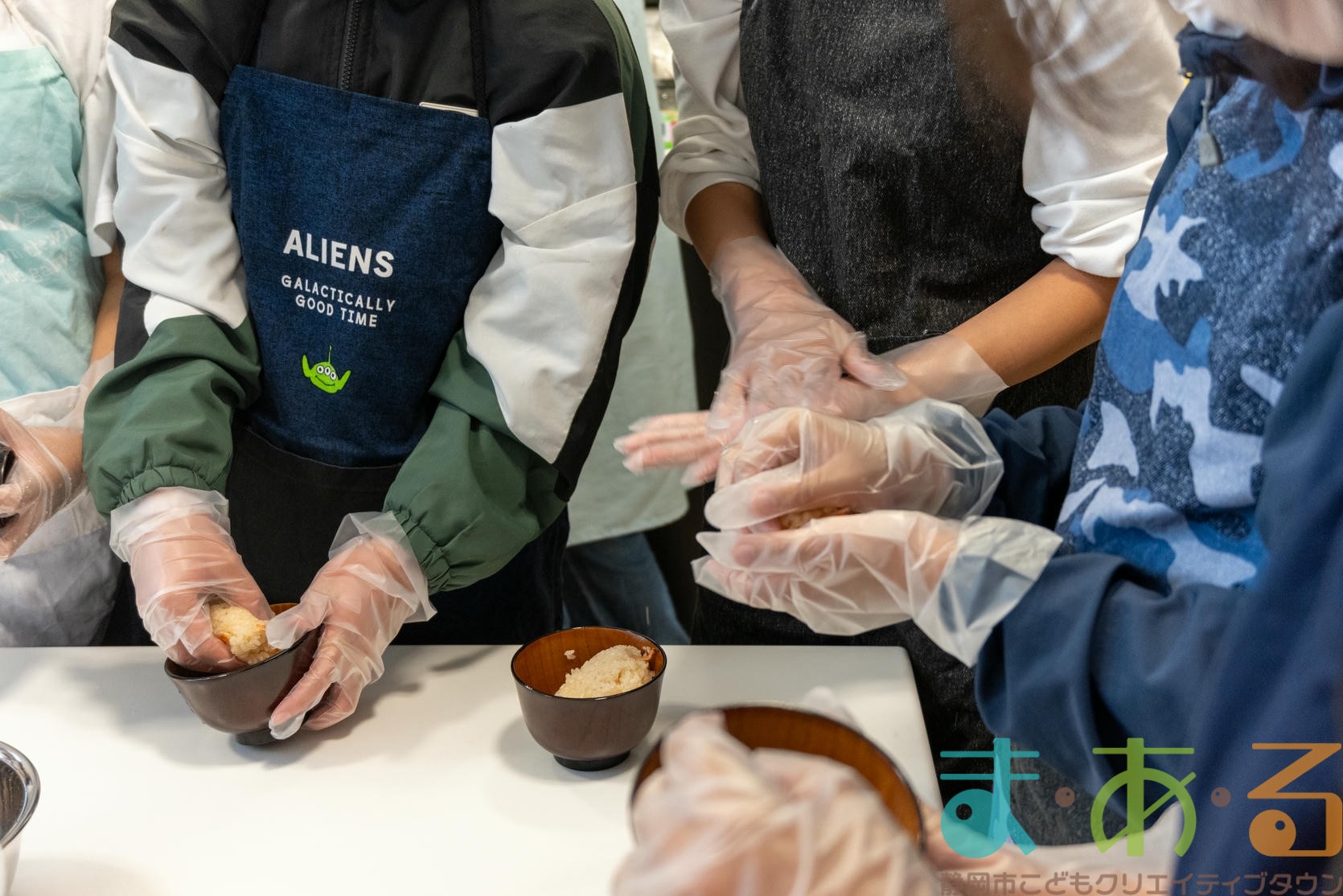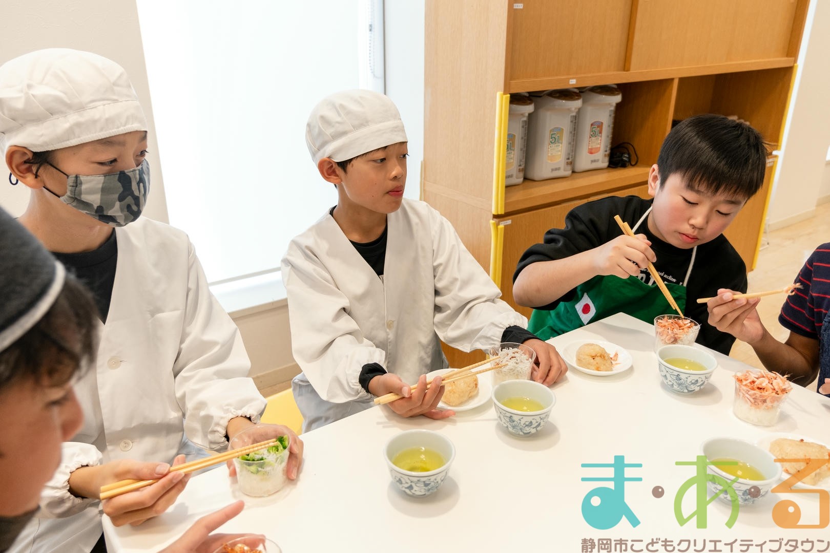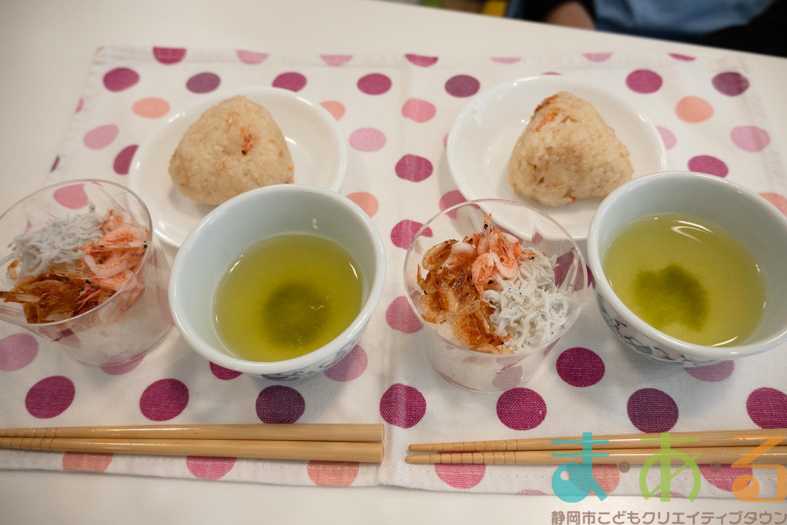 地元由比の桜えび漁について学び、桜えびの炊き込みご飯のおにぎり&カップ寿司を作りました。