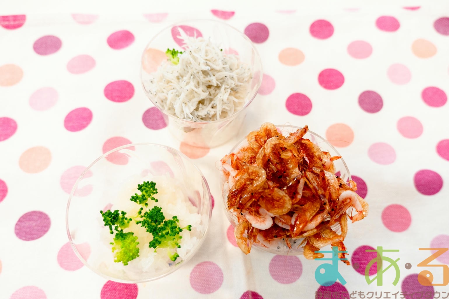 二品目は「桜えびのカップ寿司」です。酢飯を入れたカップに「しずまえ」で獲れた「ゆで桜えび」「桜えびの佃煮」「ゆでシラス」「ブロッコリー」をトッピングします。