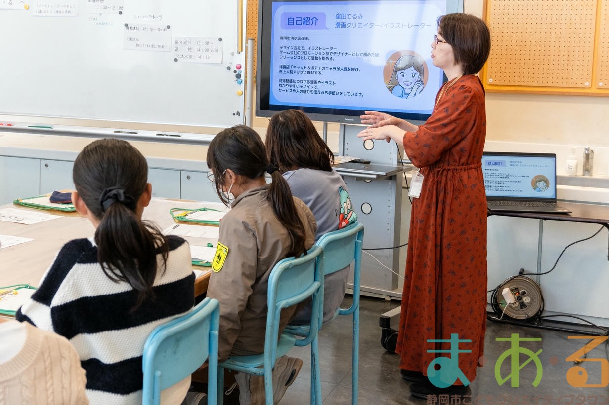最初に窪田先生の自己紹介がありました。窪田先生は、会社・行政のチラシ、マルシェで販売するカレー等のパッケージの作成や4コマ漫画も描いているそうです。