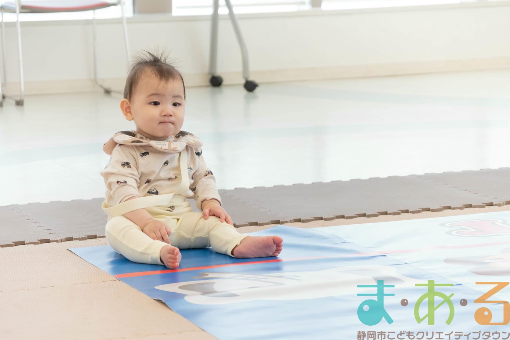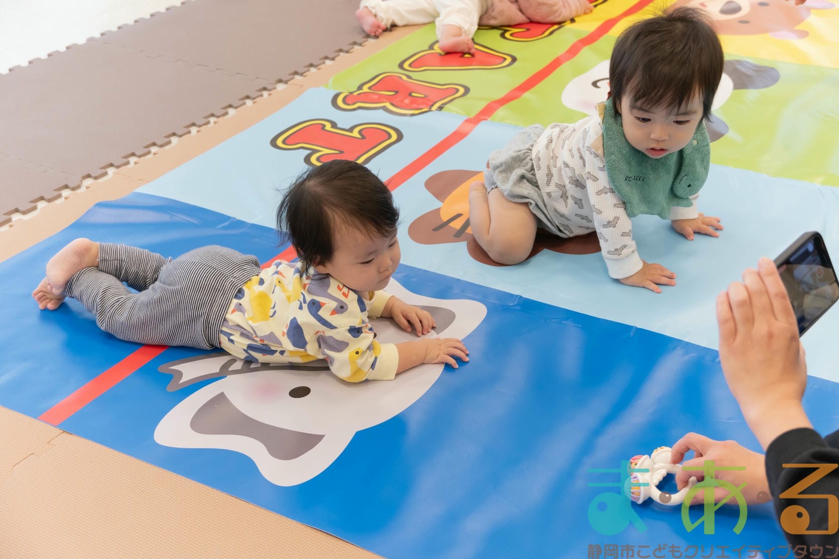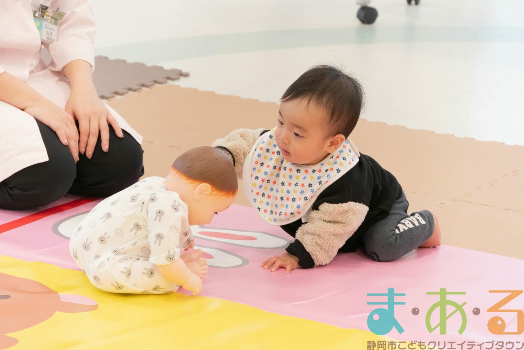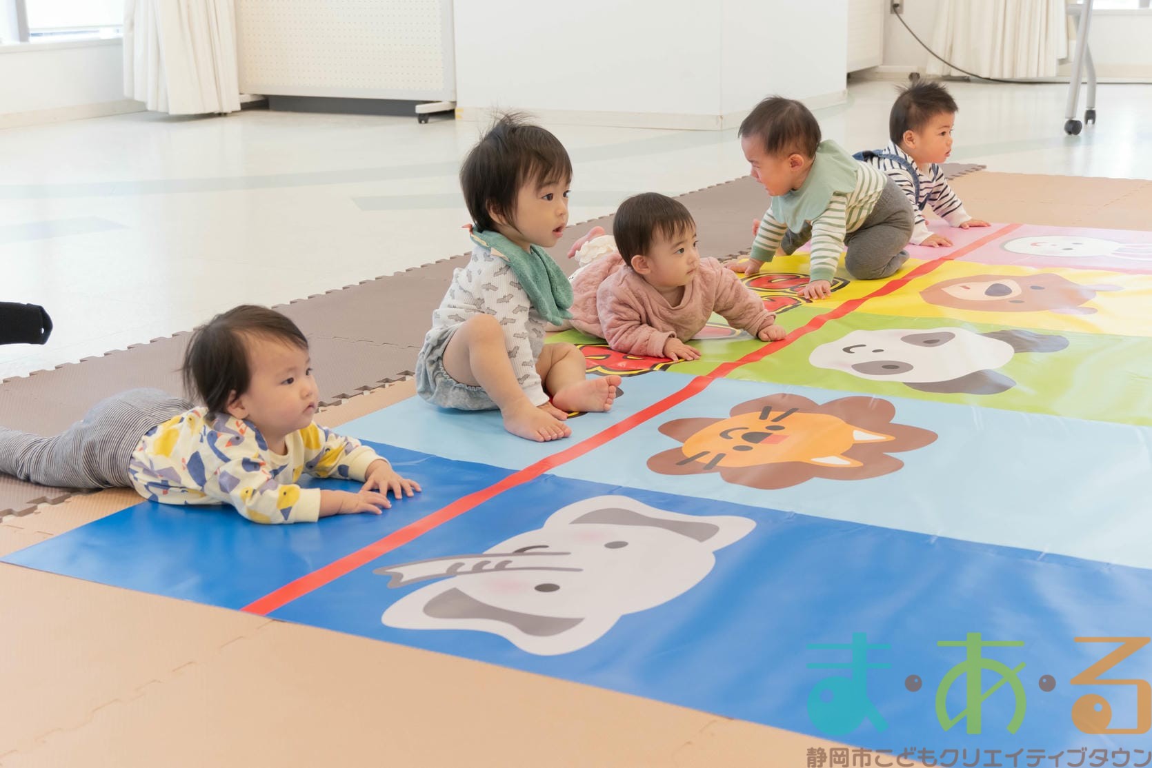 お部屋の雰囲気に慣れるため、赤ちゃんたちにはレースマットの上で自由に過ごしてもらいます。