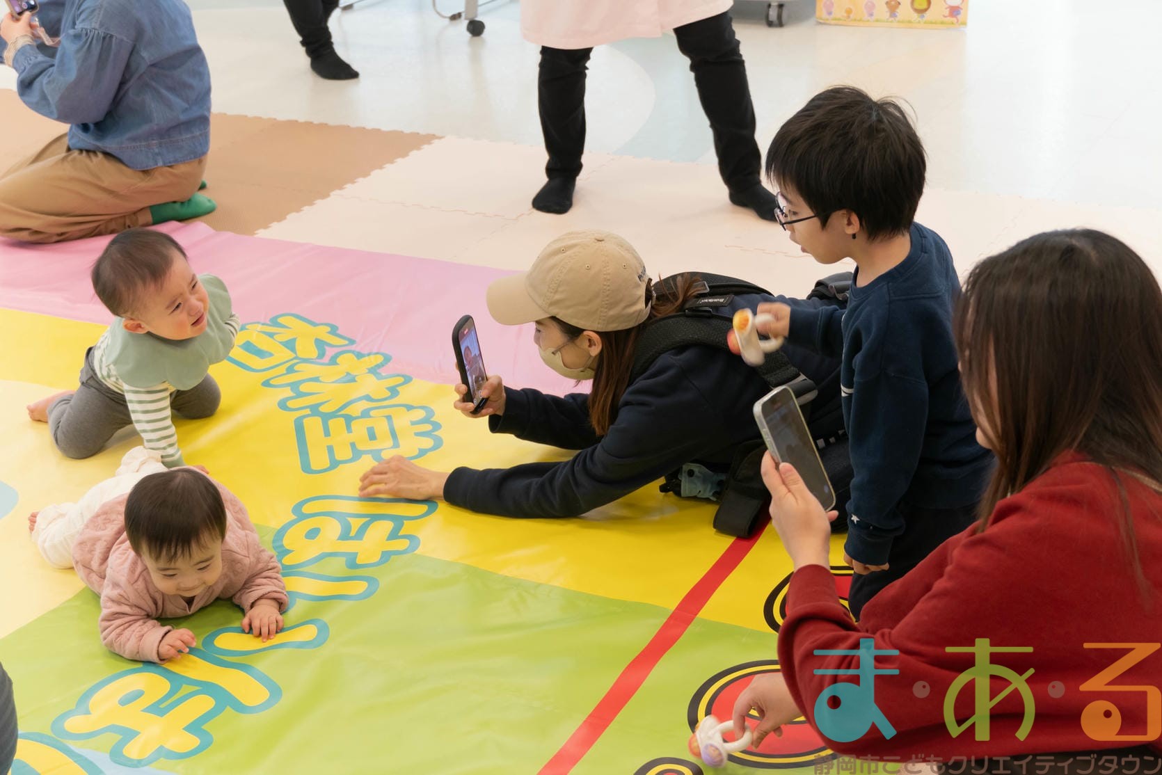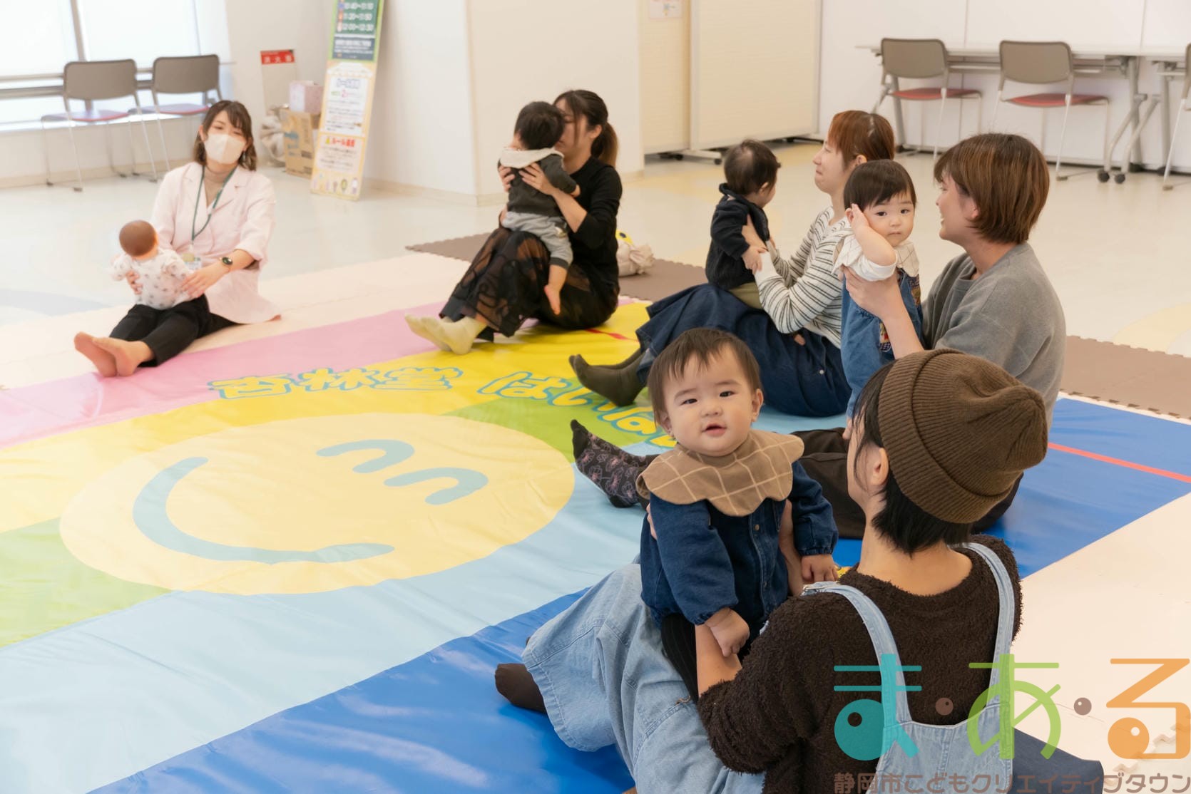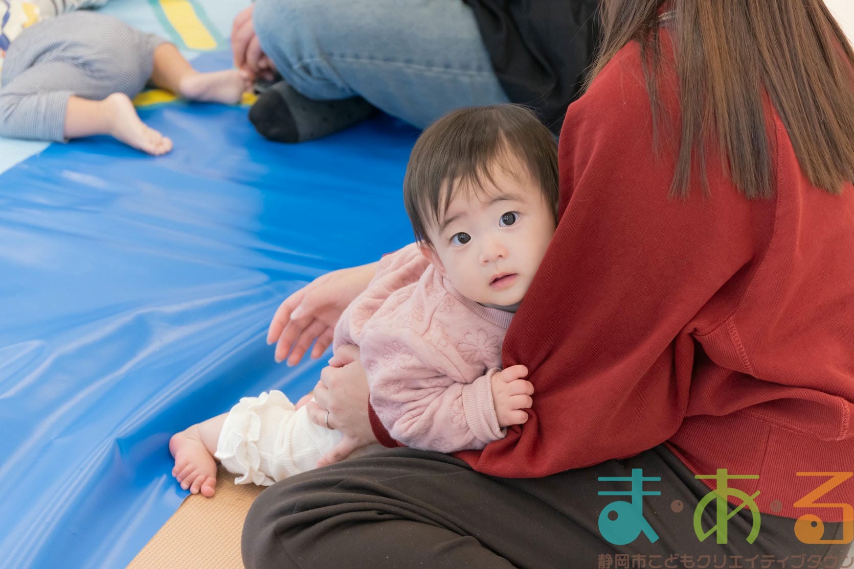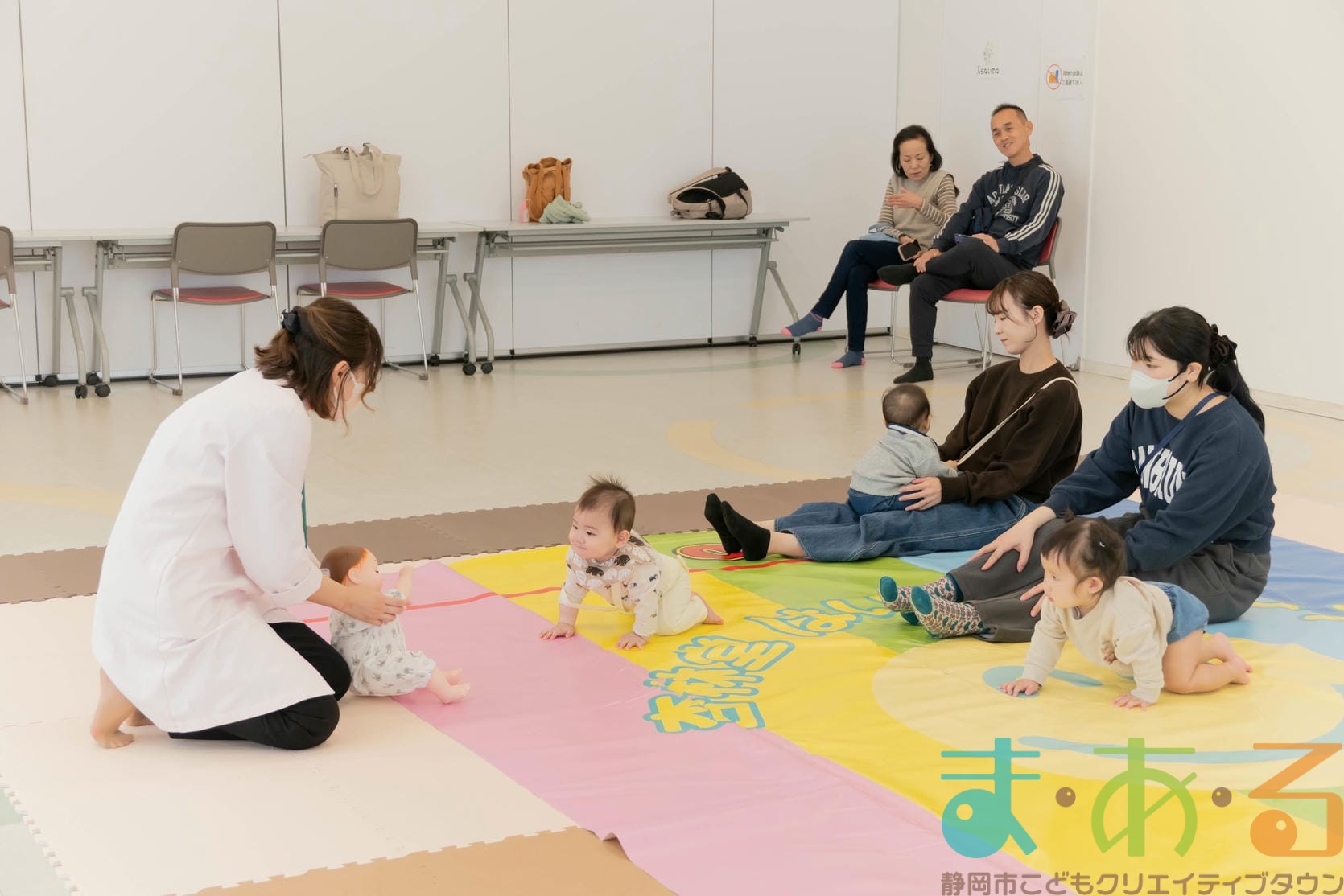 後ろを向いて座ってみる子、遠くをじっと見つめる子、泣いている子など赤ちゃんたちの反応は様々。