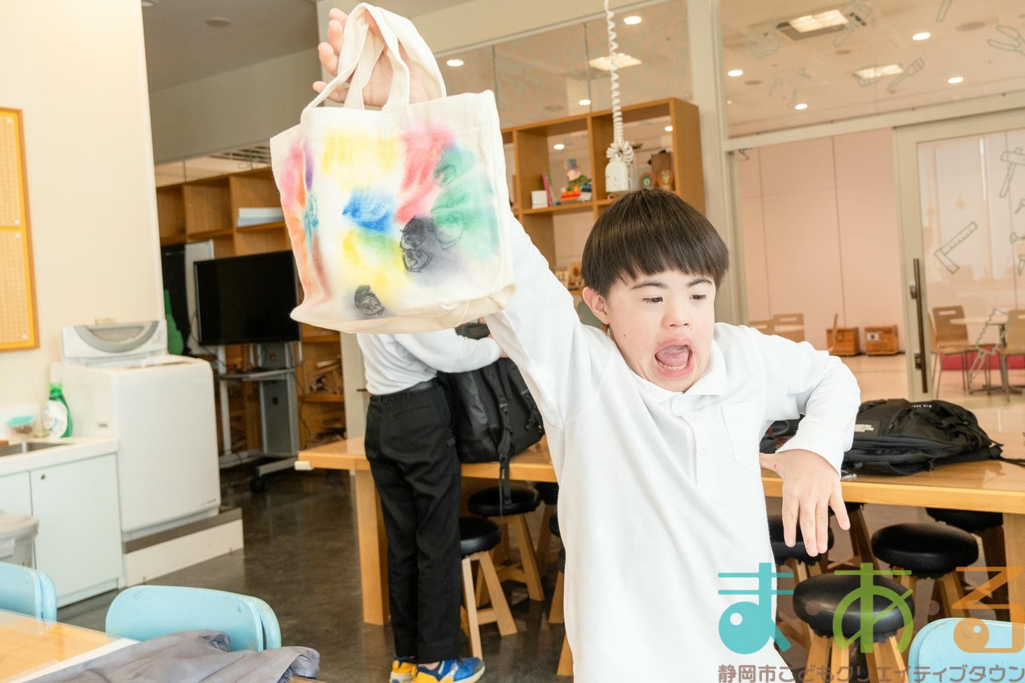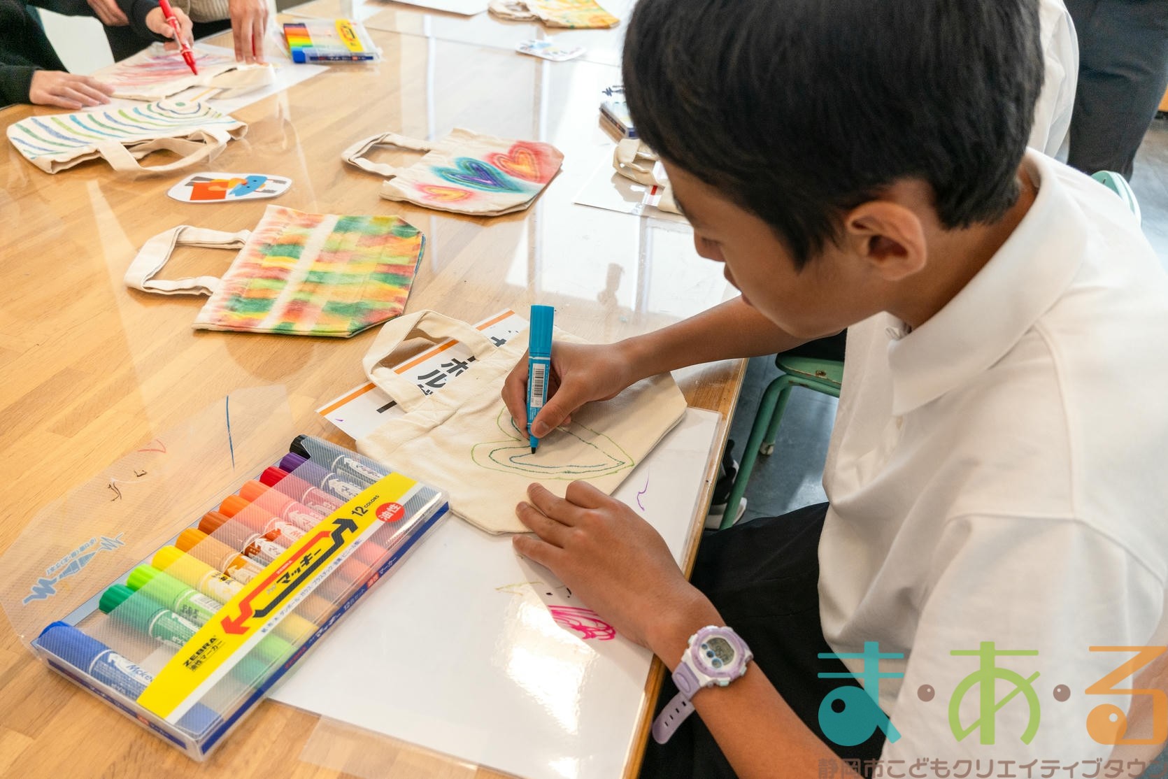 続いて「油性ペン染めバッグ」を作りました。生徒の皆さんは集中して、無言で絵や模様を描いていました。先生が「こんなに集中している姿を初めて見ました!」と、とても嬉しそうにお話してくださいました。