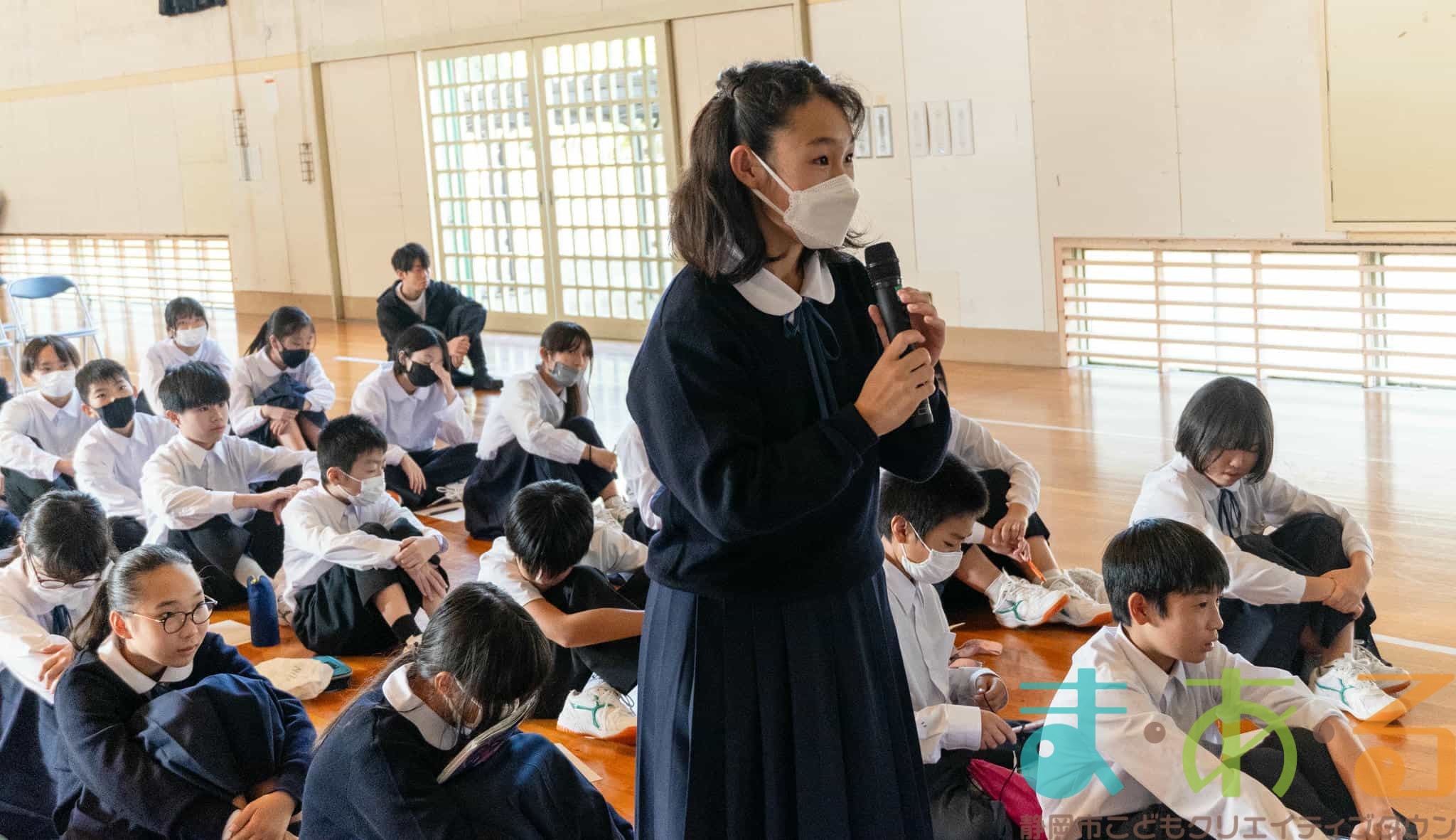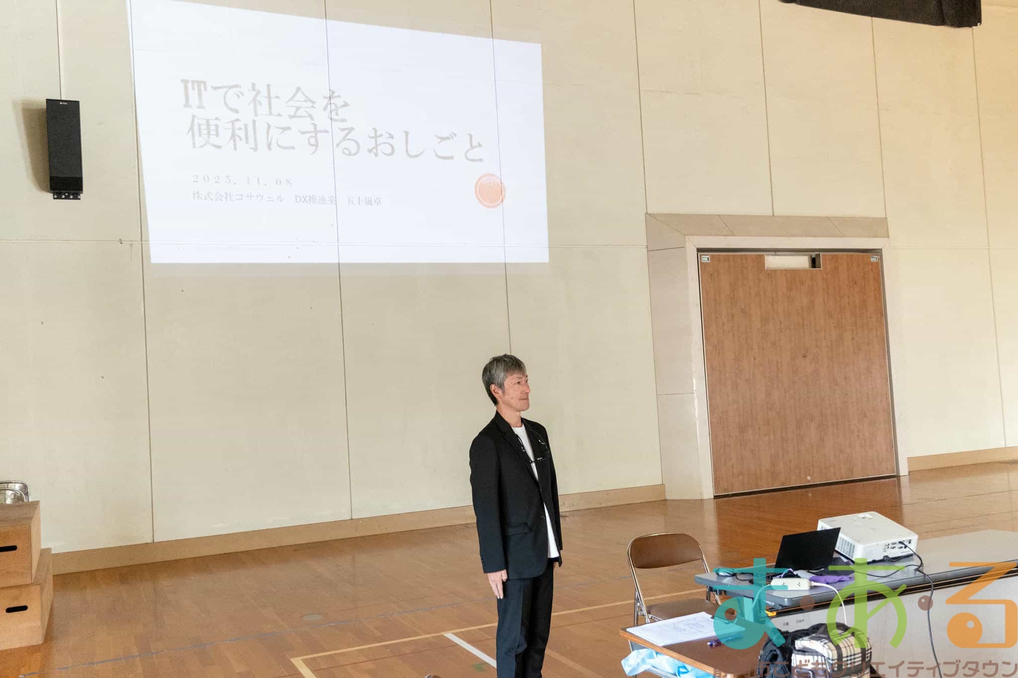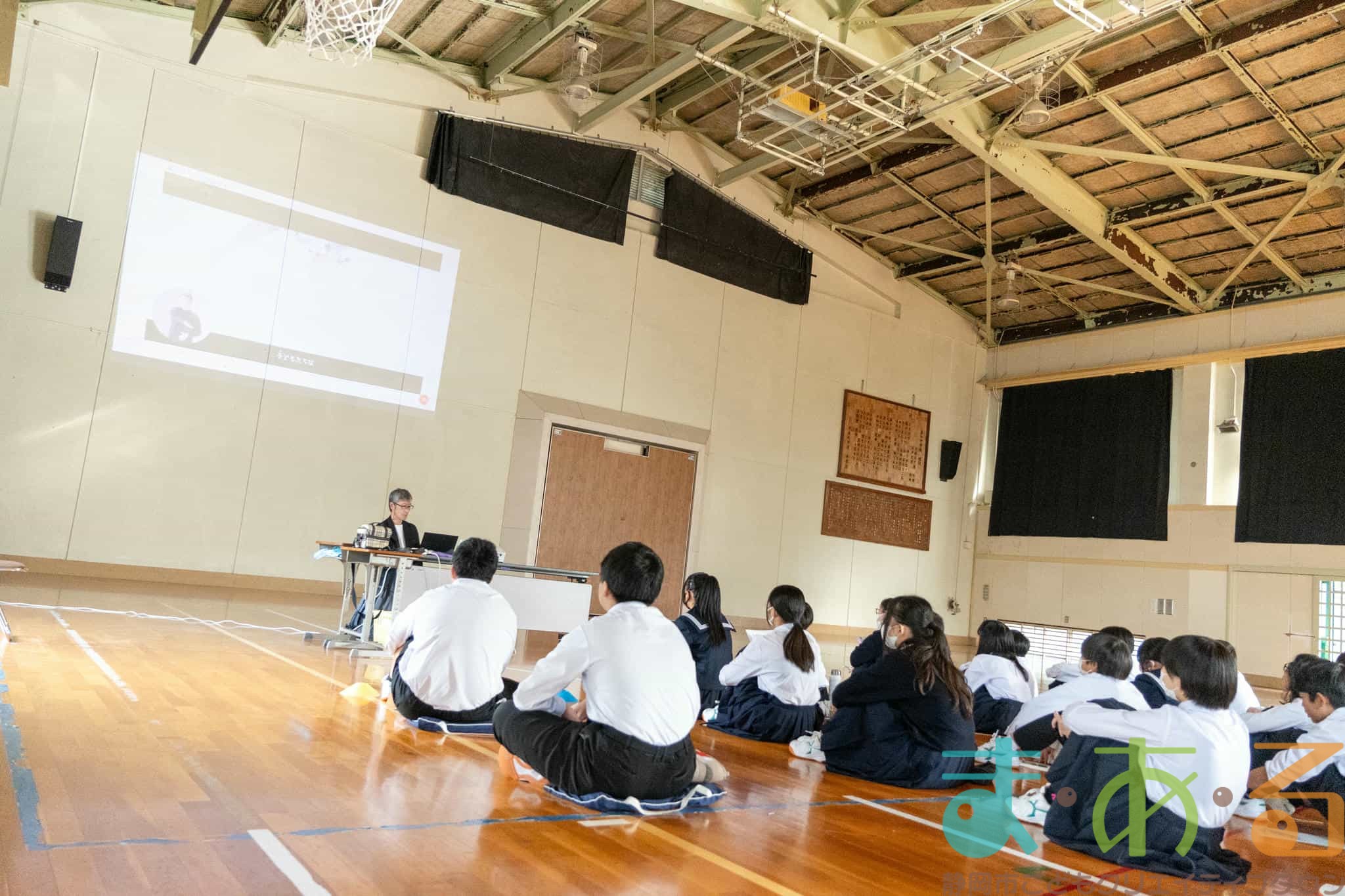 今回は学校の体育館を会場にして「ITで社会を便利にするお仕事講座」の職業講話を実施しました。