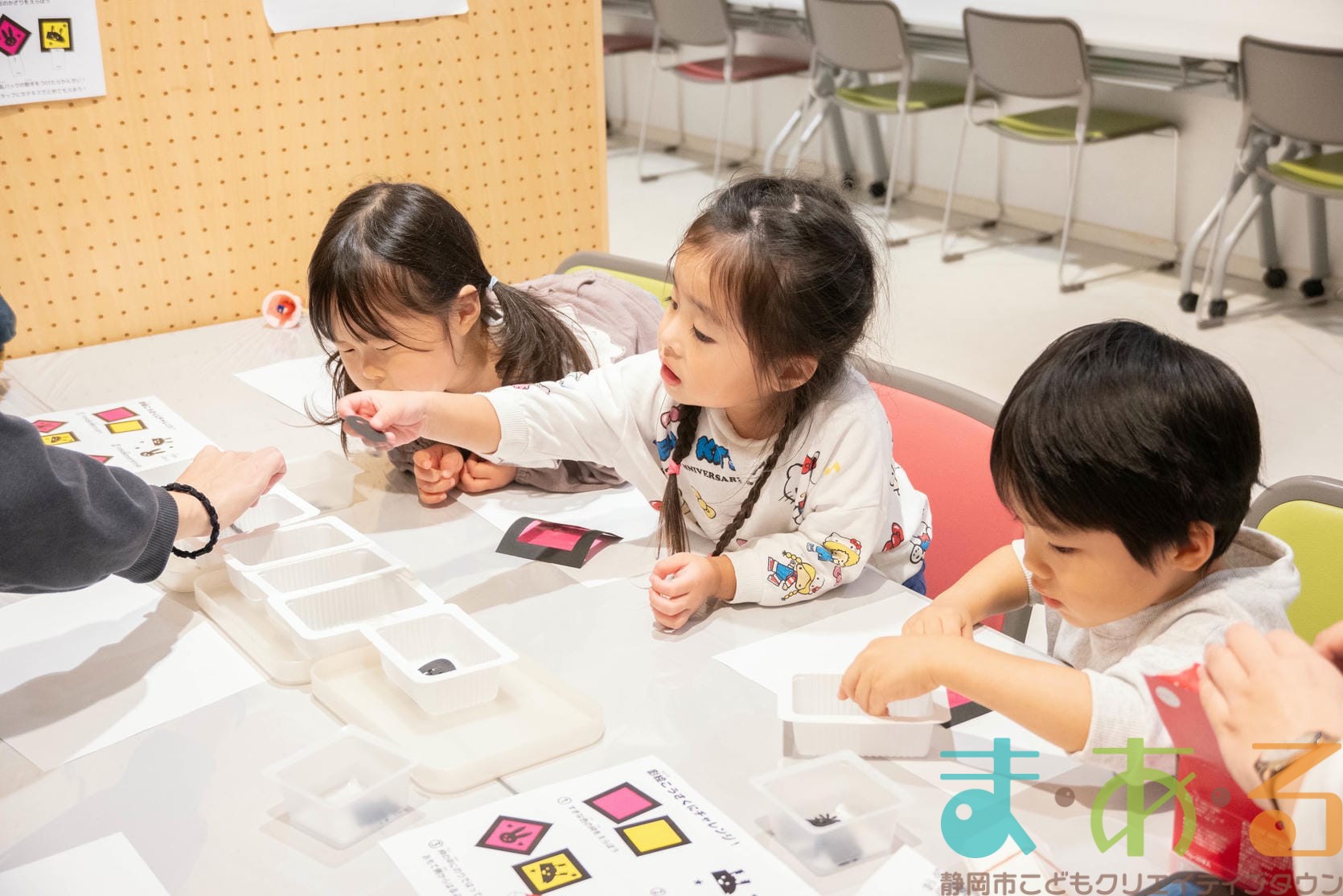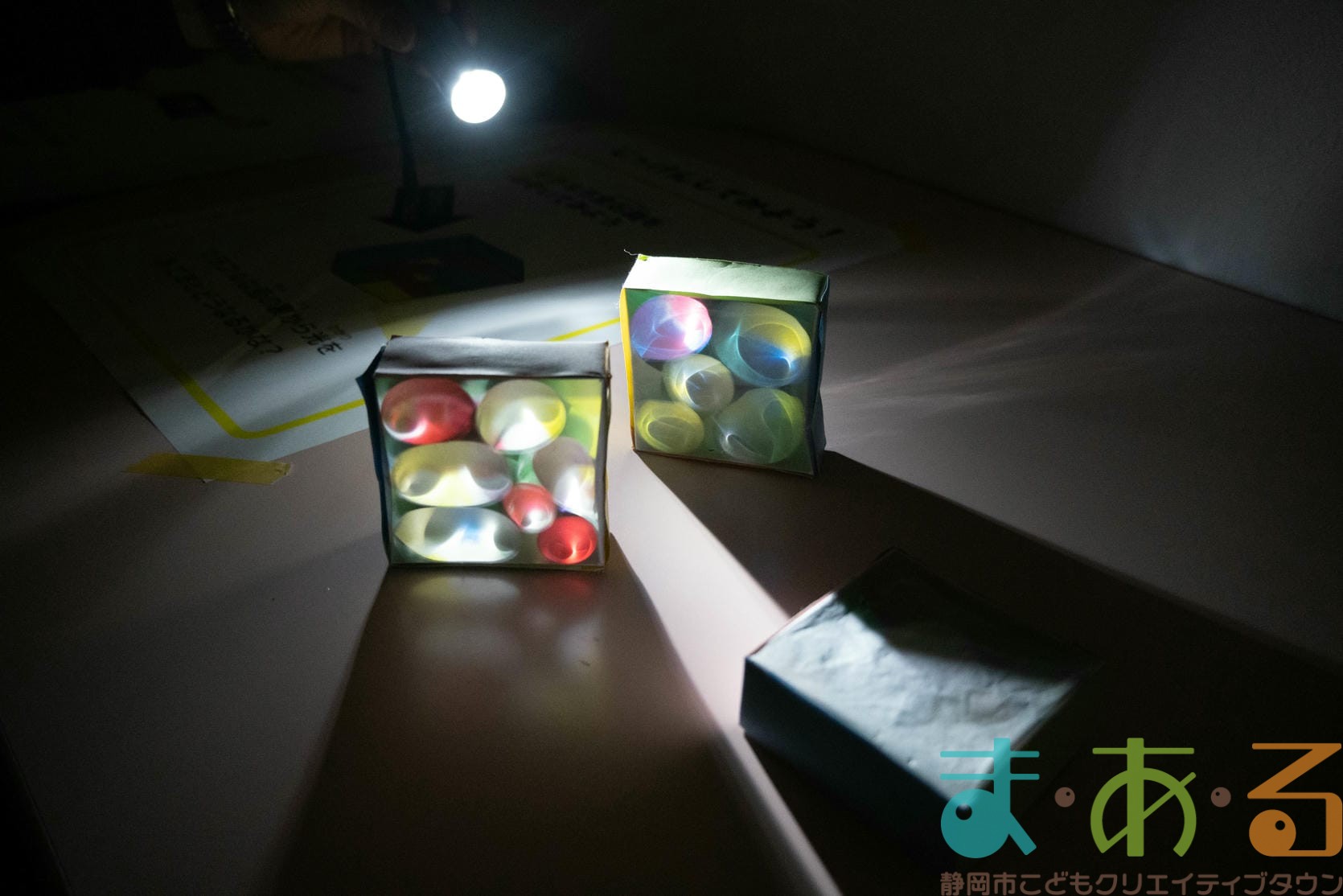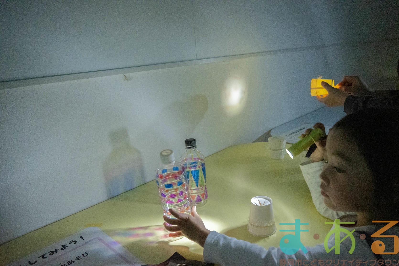 光を使った実験コーナーではペットボトルや三色めがね、紙コップの底、キラキラ宝石箱に光を当ててみてね。