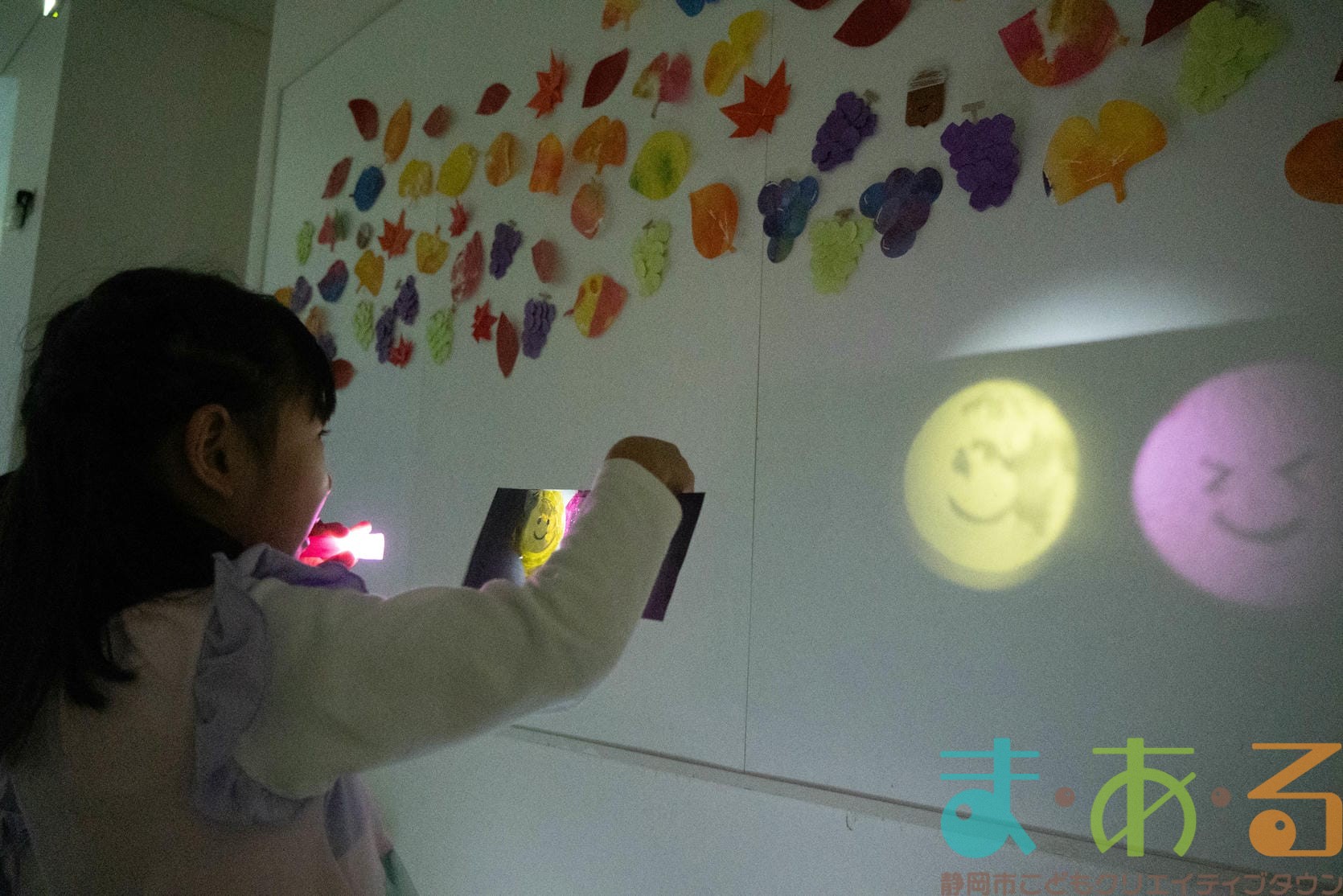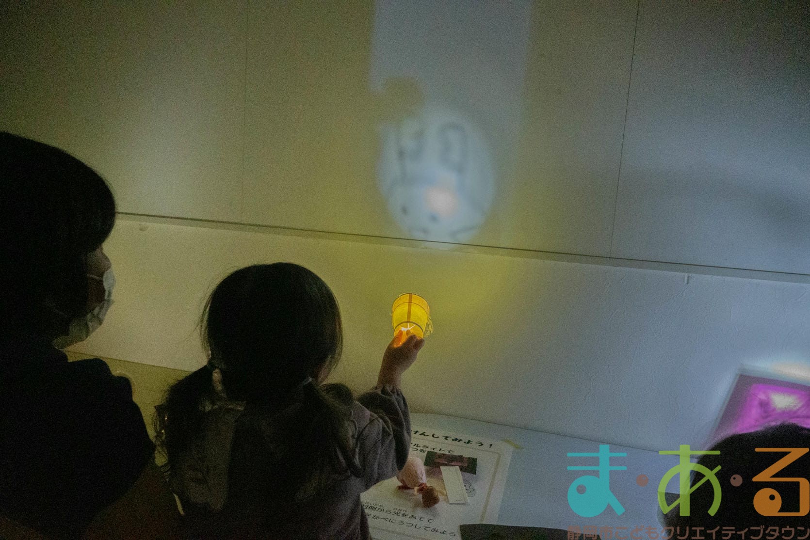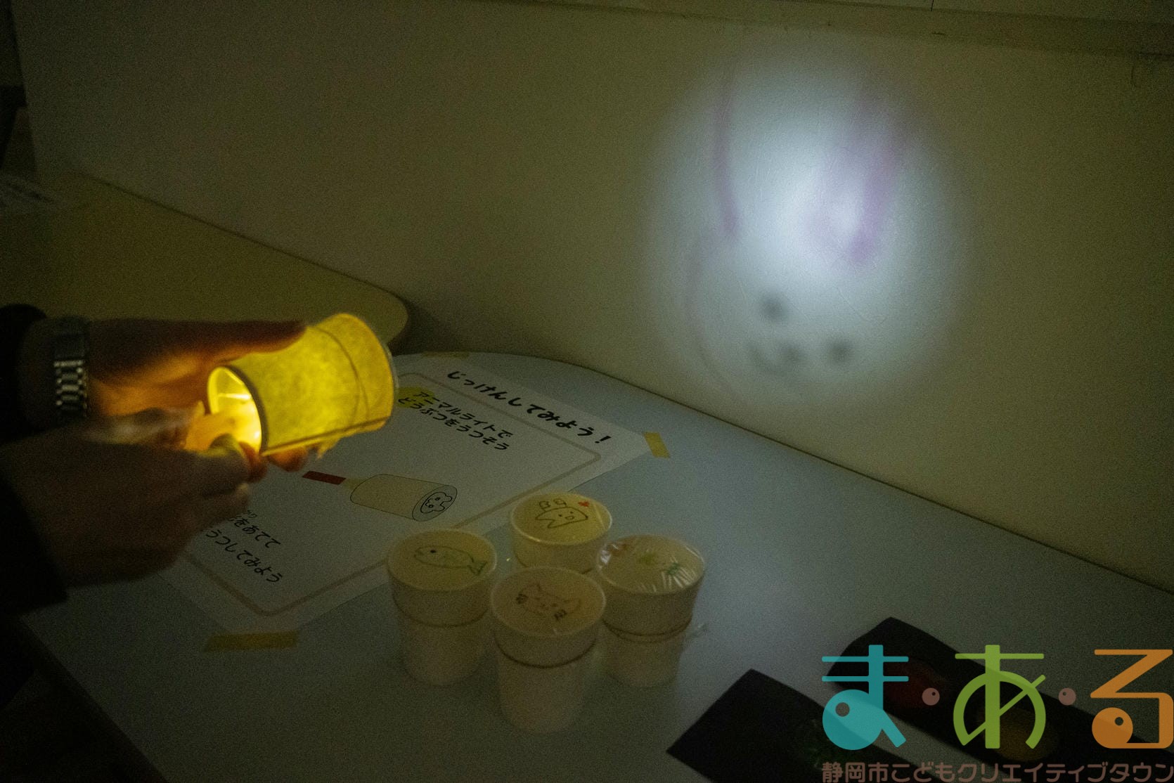紙コップの底にライトをはめ込むとまあるんや動物の絵が映し出されました。