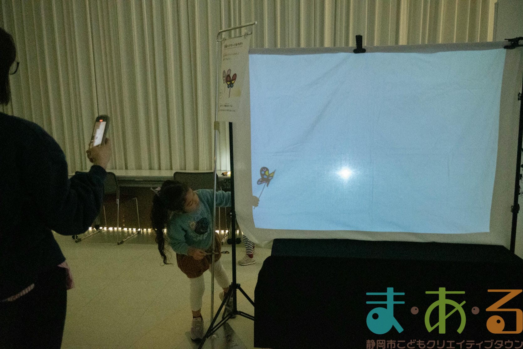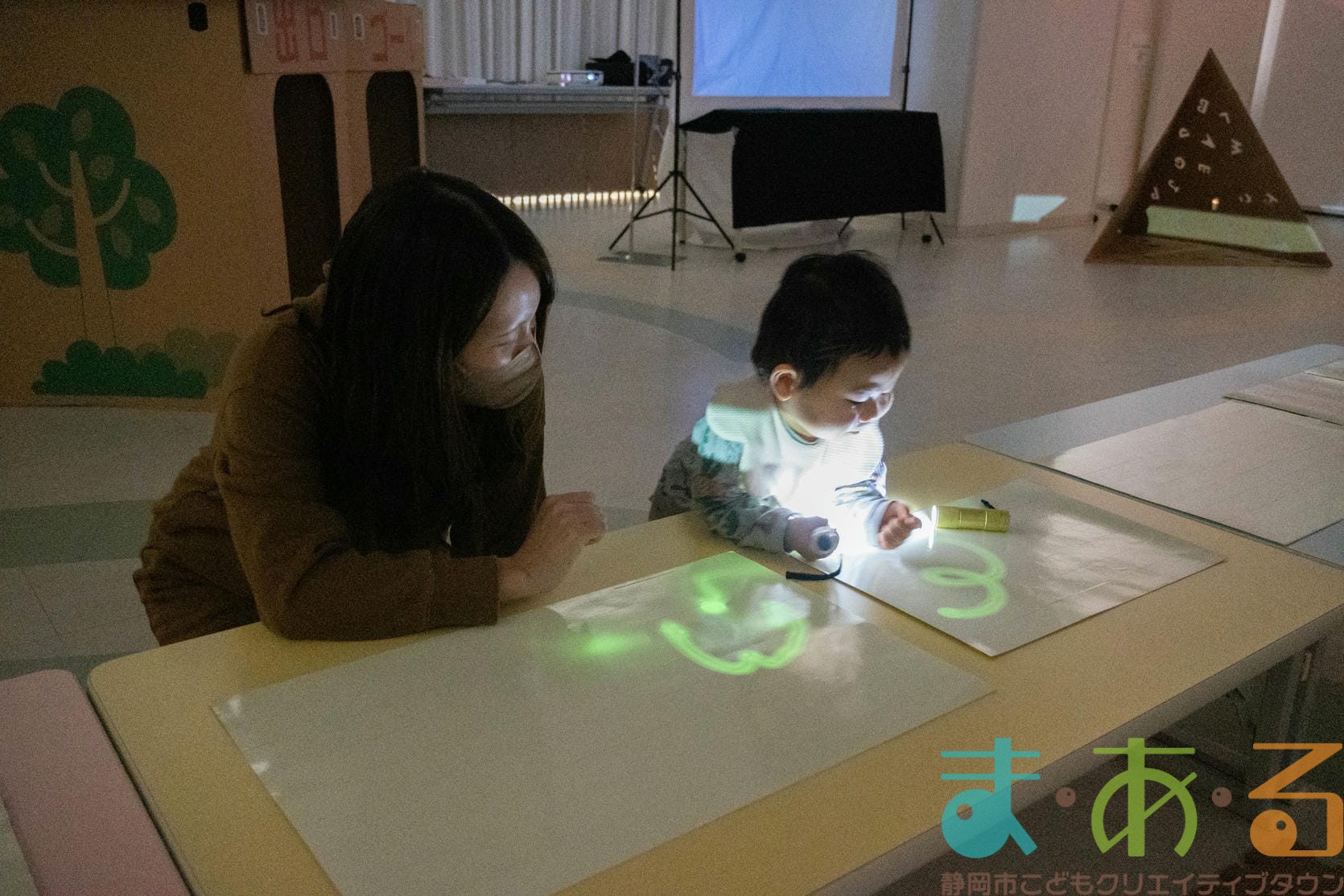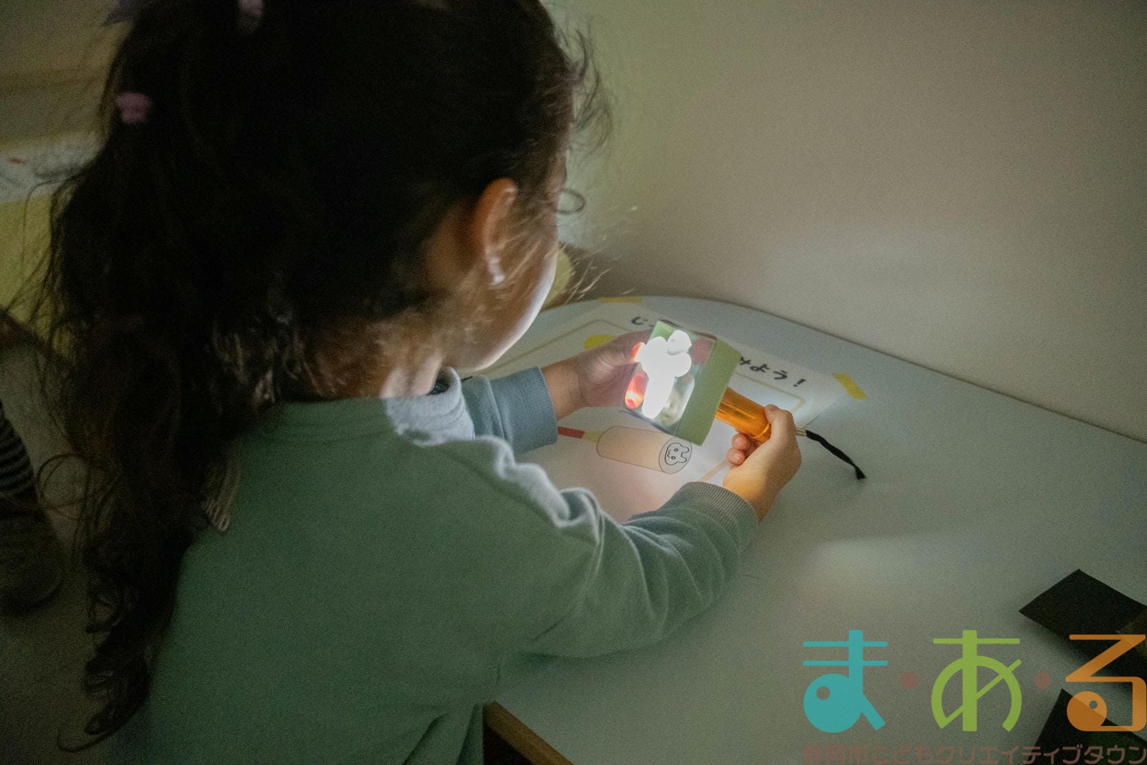 紙コップの底にライトをはめ込むとまあるんや動物の絵が映し出されました。