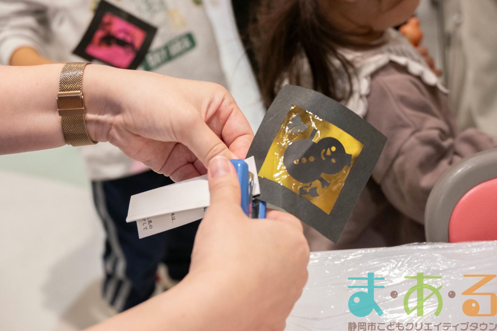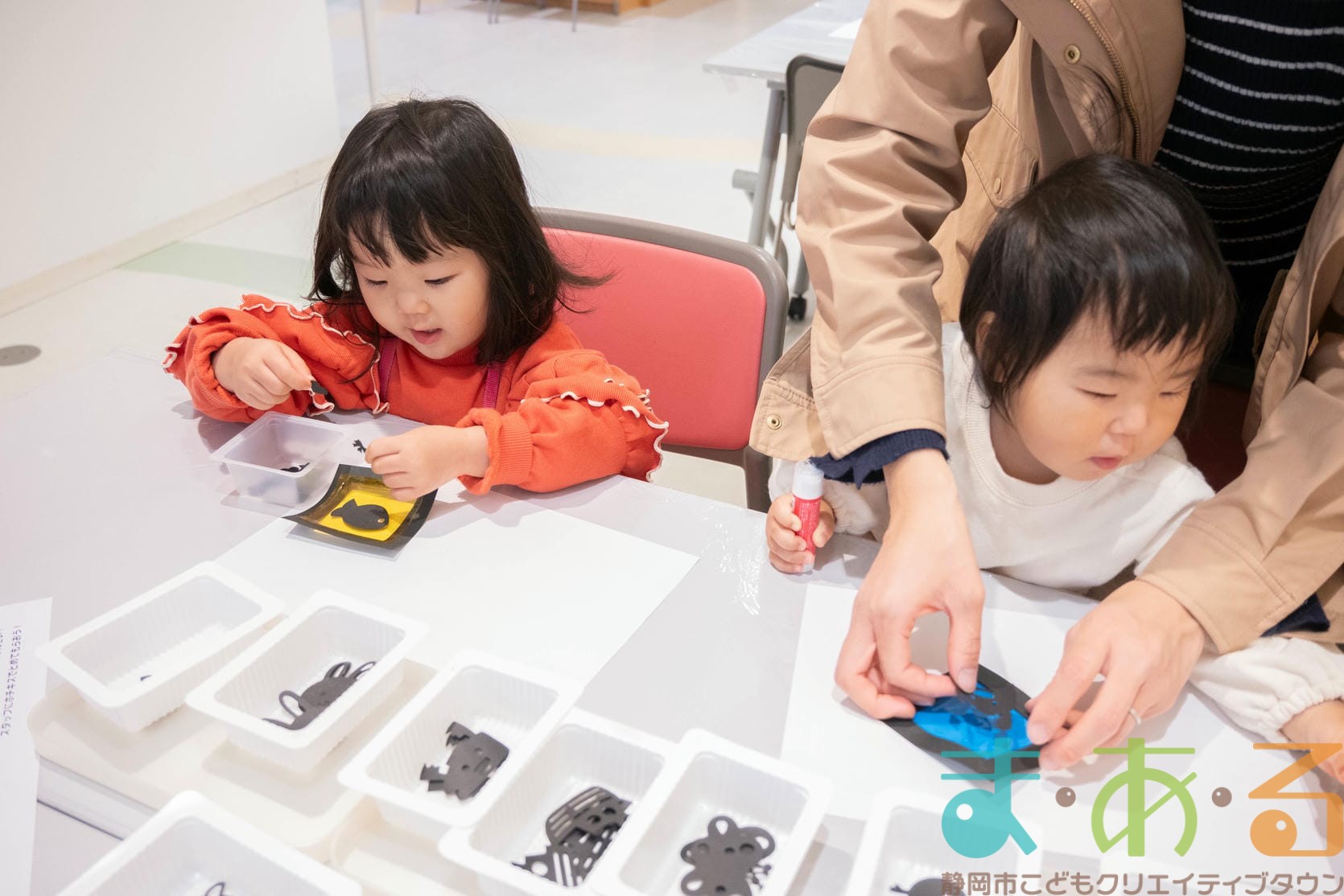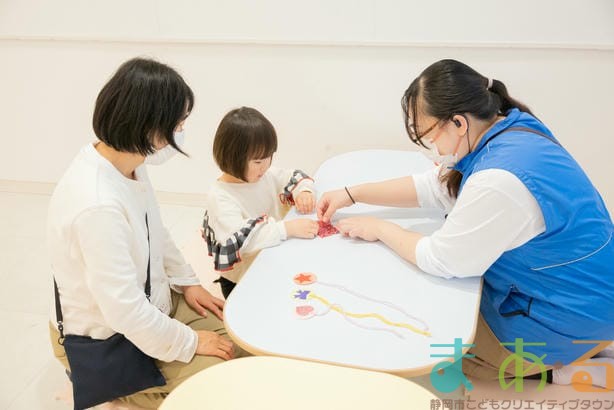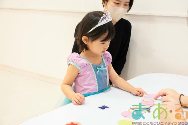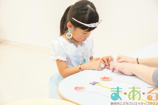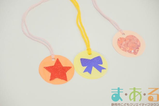 工作コーナーでは、好きな形や色の組み合わせを考えてオリジナルのキラキラペンダントを作ることができます。