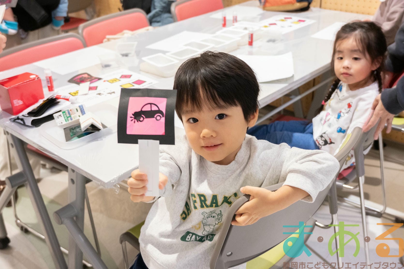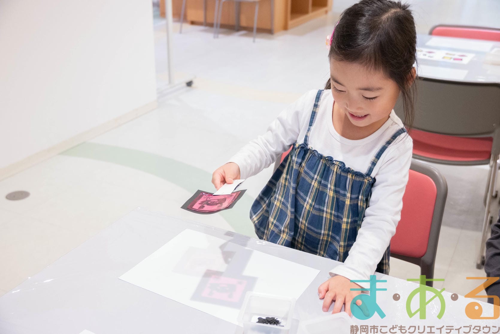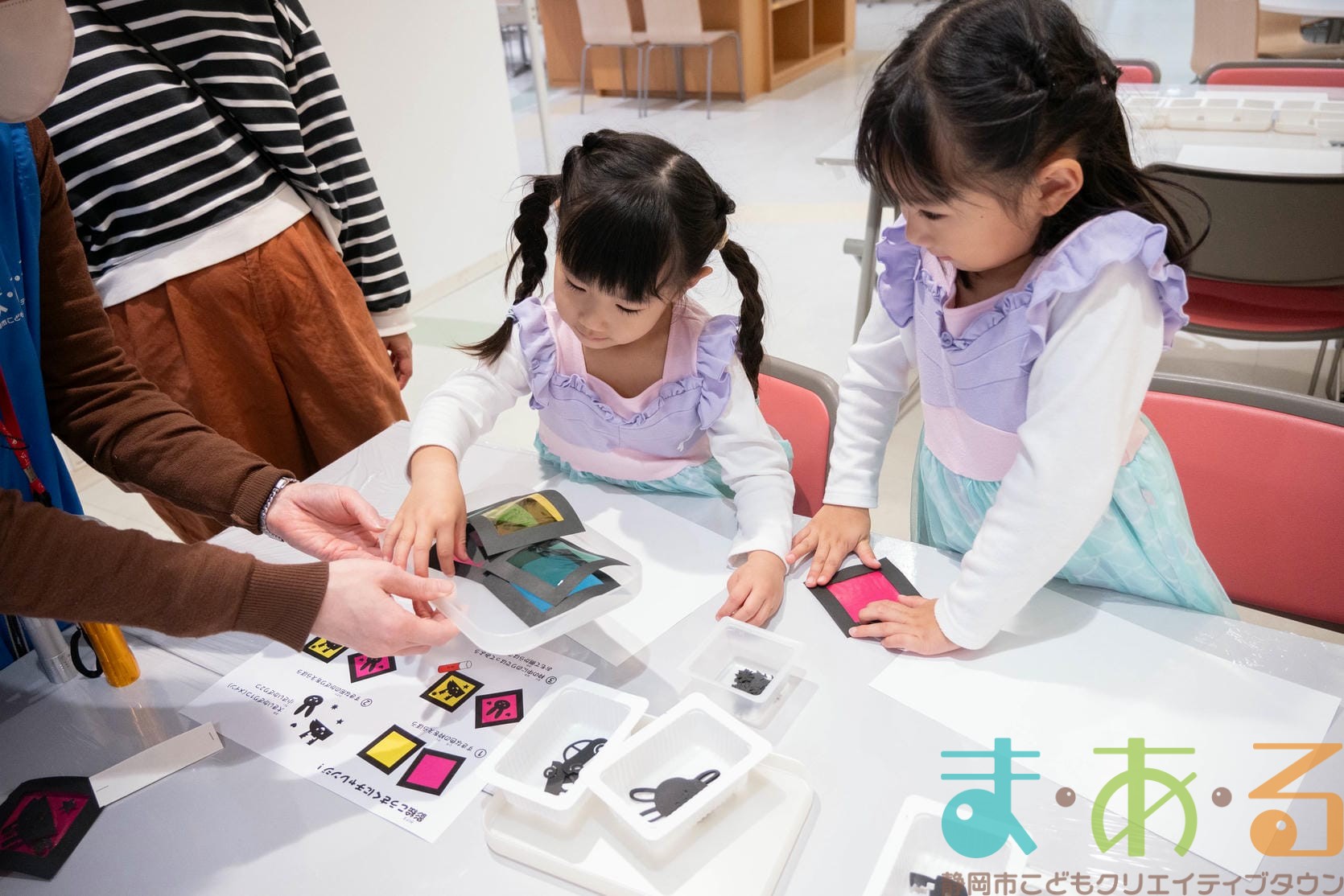 工作コーナーでは、好きな形や色の組み合わせを考えてオリジナルのキラキラペンダントを作ることができます。