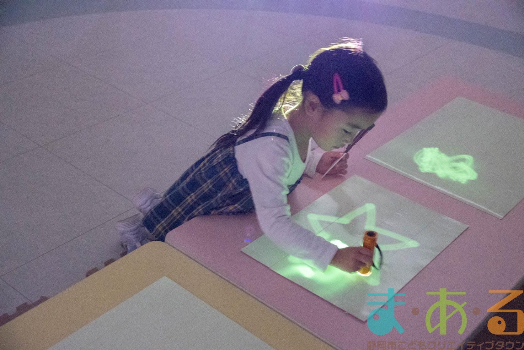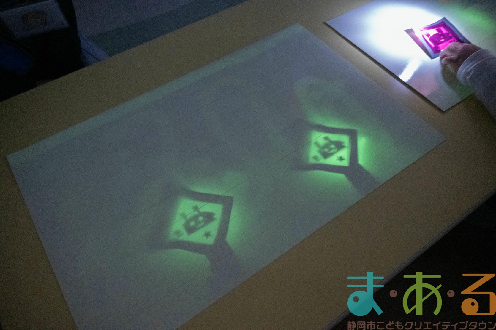 ライトに反応して絵を描くことができるシートにスティックをのせて光を当てると、スタンプを押したように絵が浮かび上がってきました。
