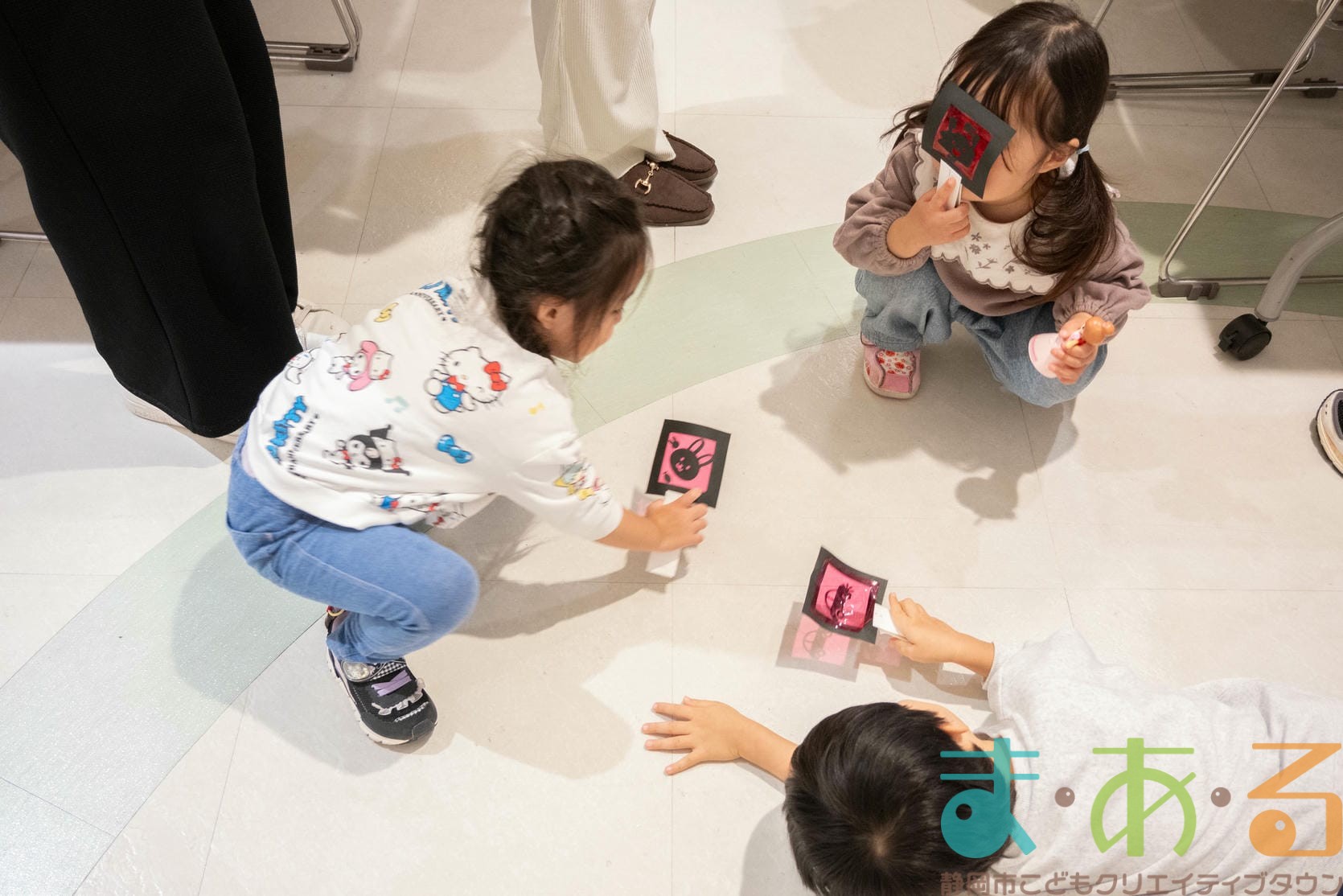机や床に写った影絵に気がついたお友だち。興味津々で観察しています。