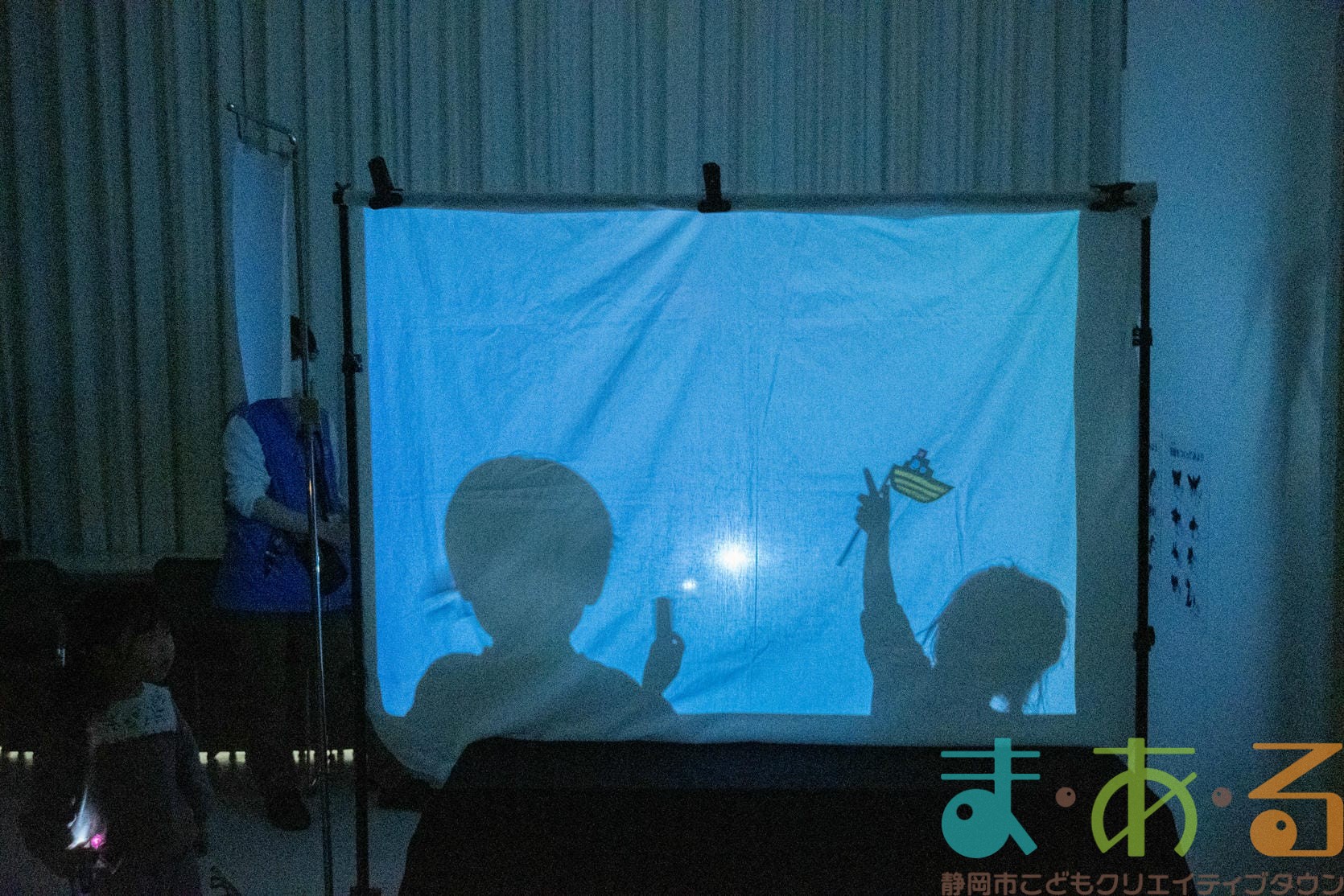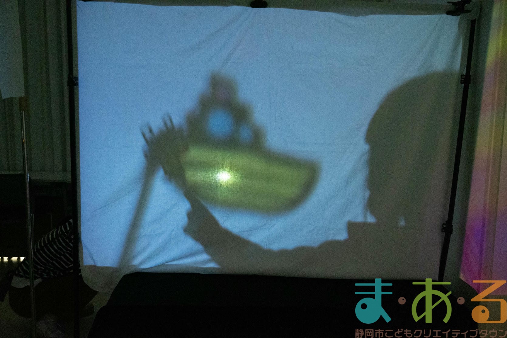 プロジェクターからの光に影絵人形をかざす位置を調整して、船の影を大きくまあるんを小さく映します。