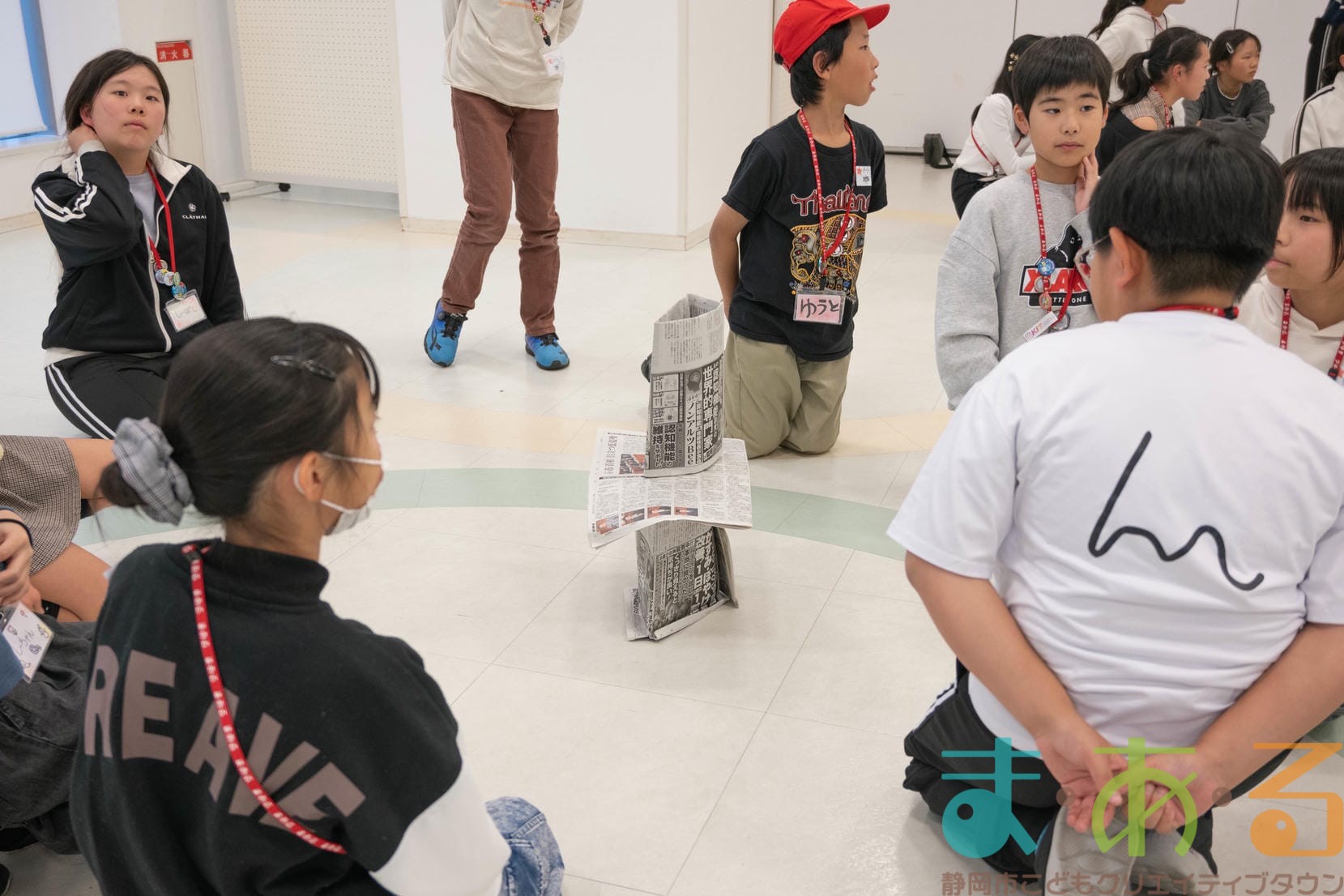 各チームに配られている5枚の新聞紙を使ってどんな方法でもいいので高いタワーを作ります。
