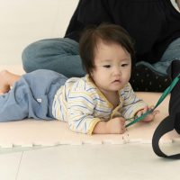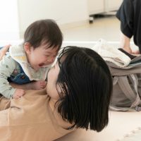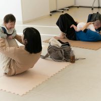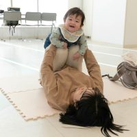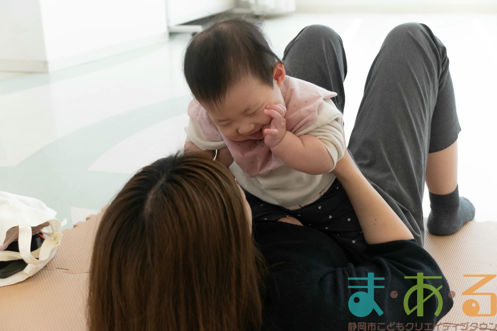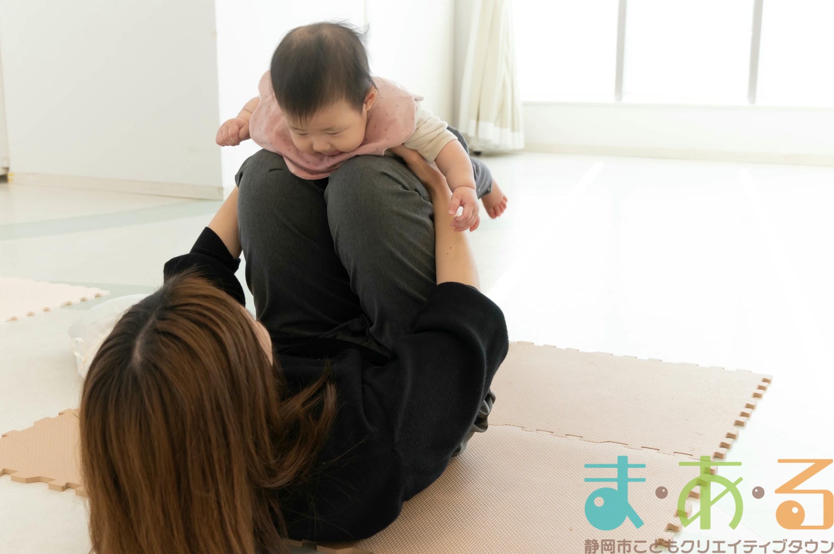 赤ちゃんを足やお腹に乗せて左右にゆらゆら揺れるふれあい遊びの後は、足を床につけた状態で簡単な腹筋に挑戦です。