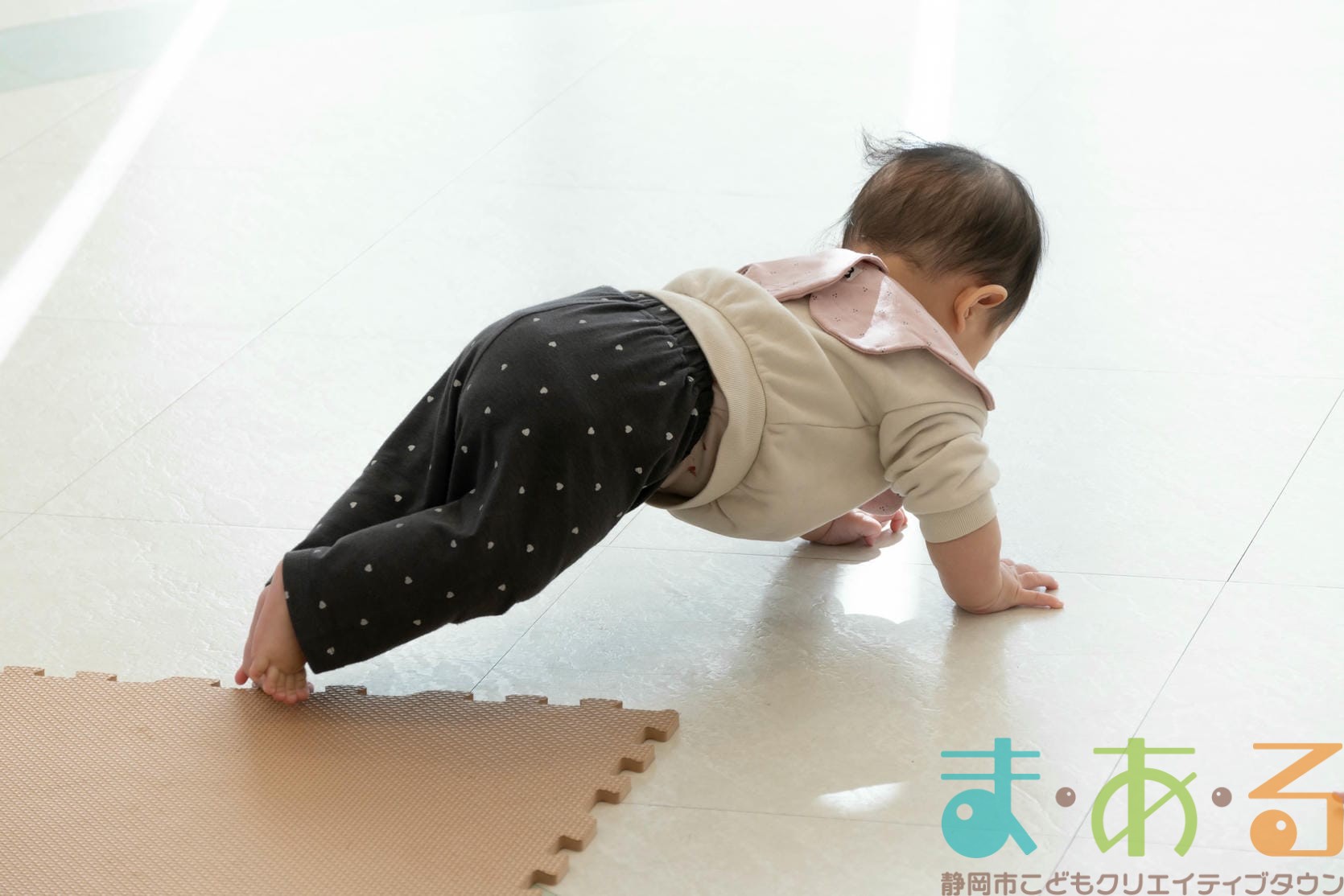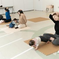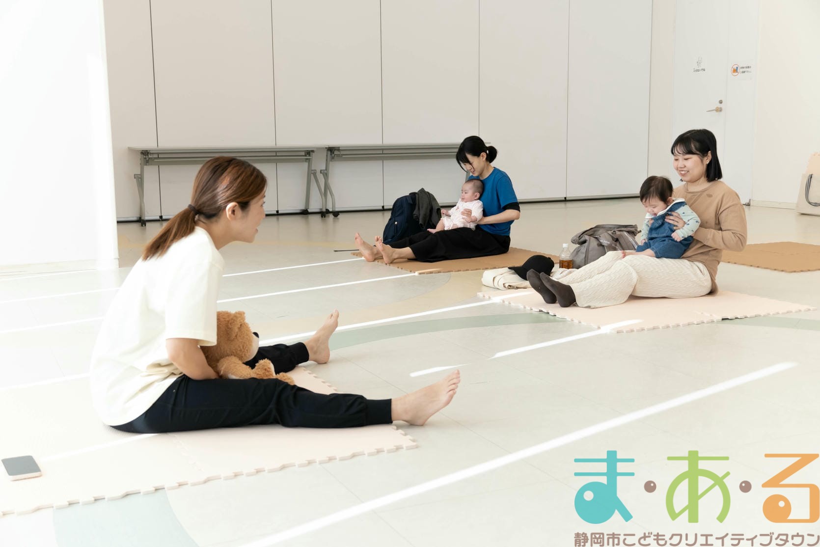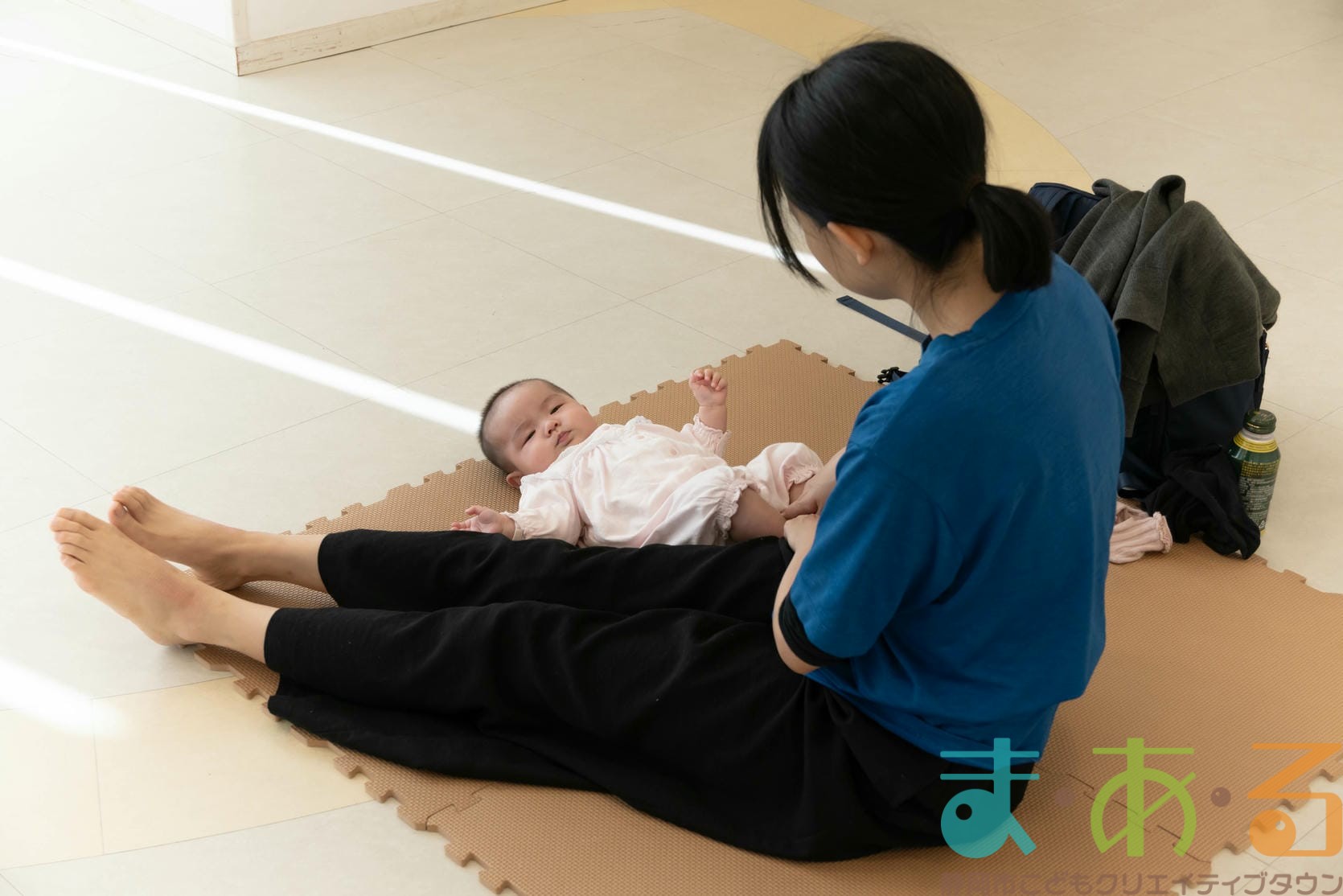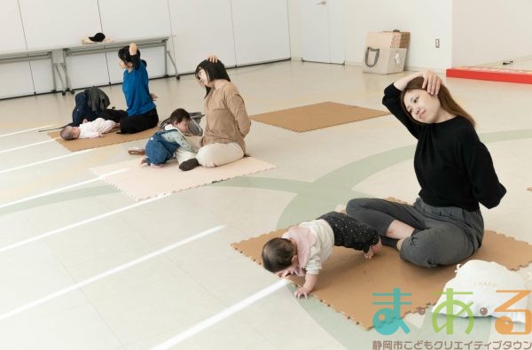 最初は少し緊張していた赤ちゃんたちも、ストレッチをするママを見つめたり、お友達のマットに遊びに行ったりとお部屋の雰囲気に慣れてきたようです。