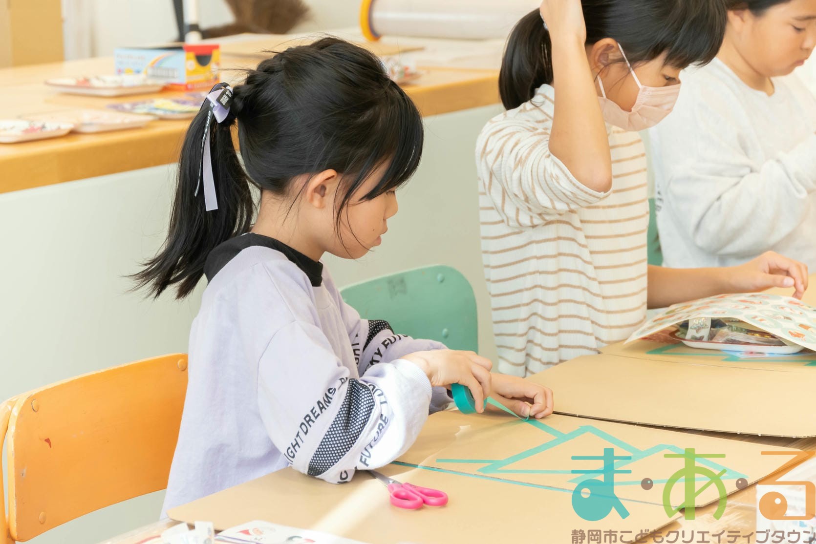 - 段ボール紙の組み立てをしよう! 太めのマスキングテープを使って、2枚の段ボール紙を貼り合わせます。
