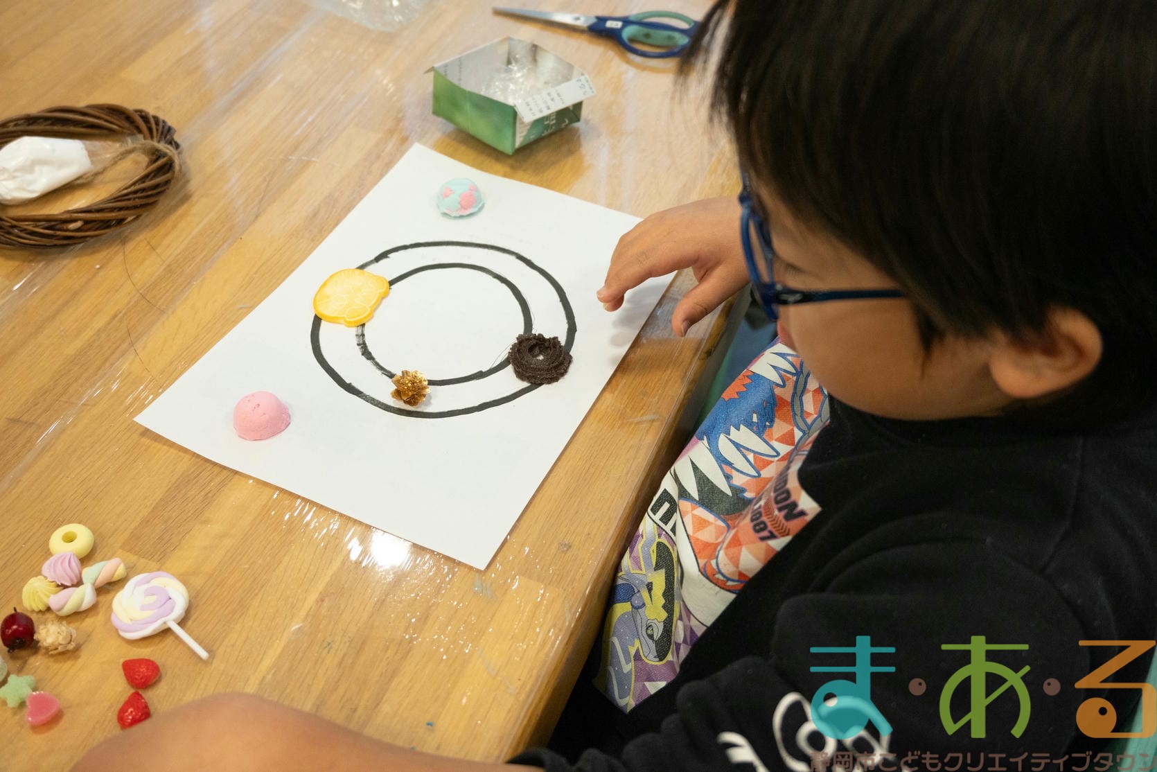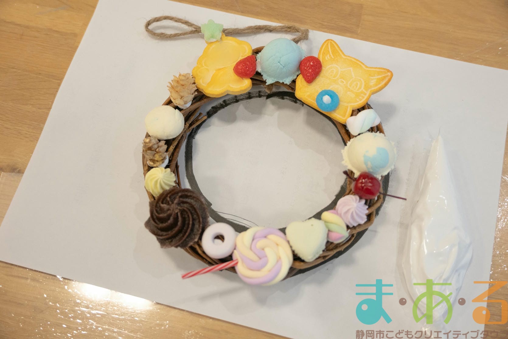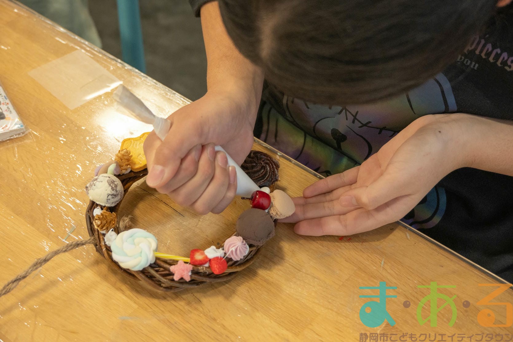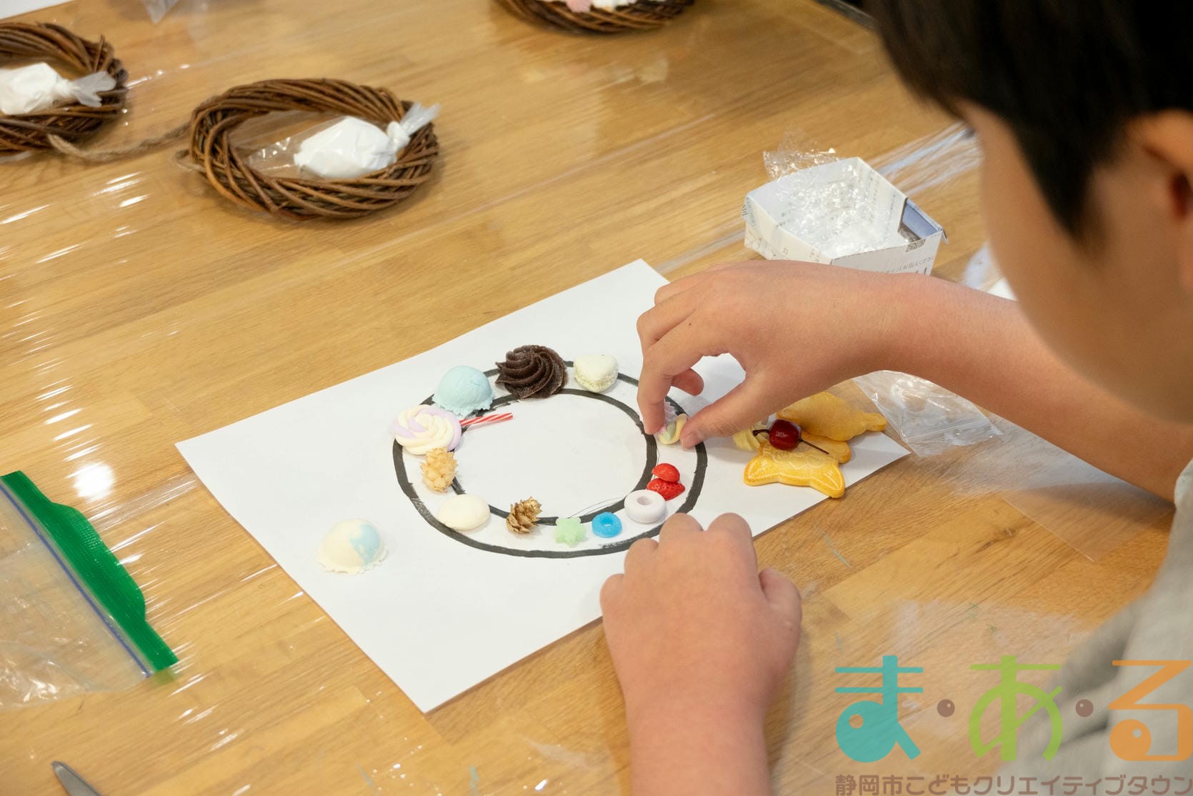 今回は職業ものづくり体験として、chamの進藤聖子先生にご協力いただき、食品サンプルを使ったクリスマスリース作りの講座を開催しました。