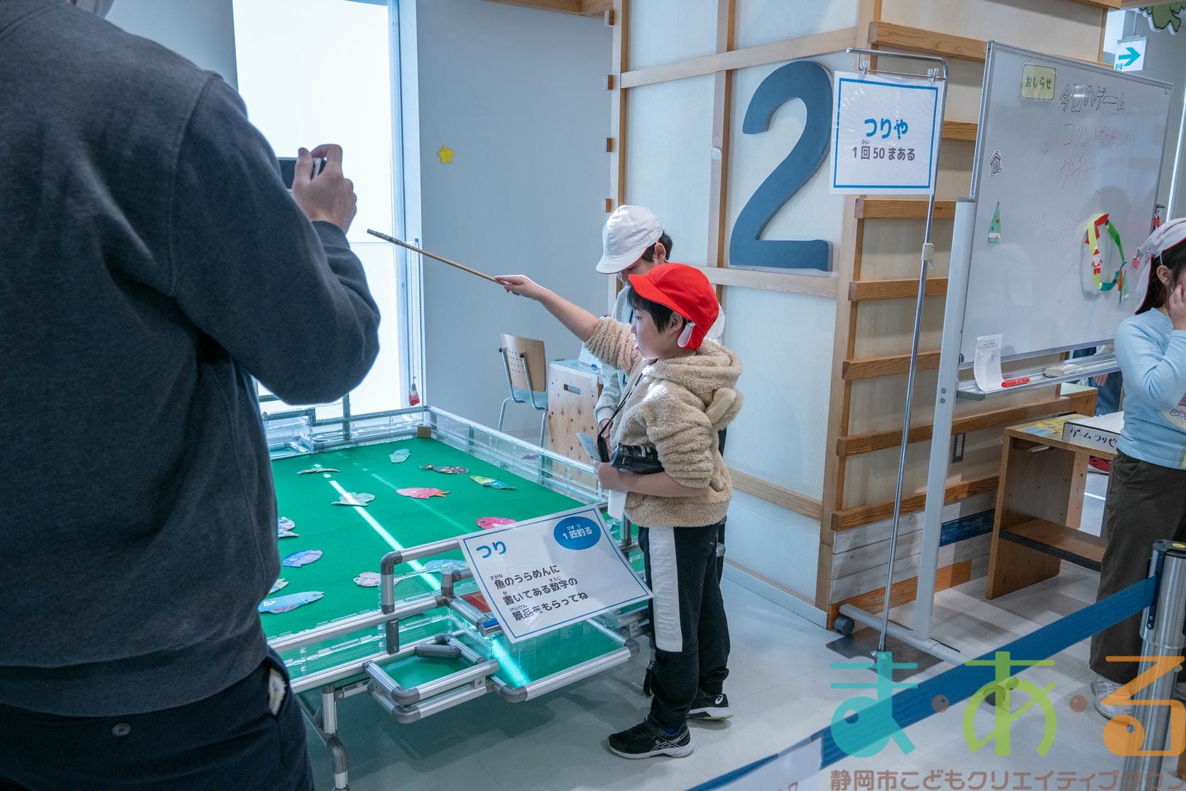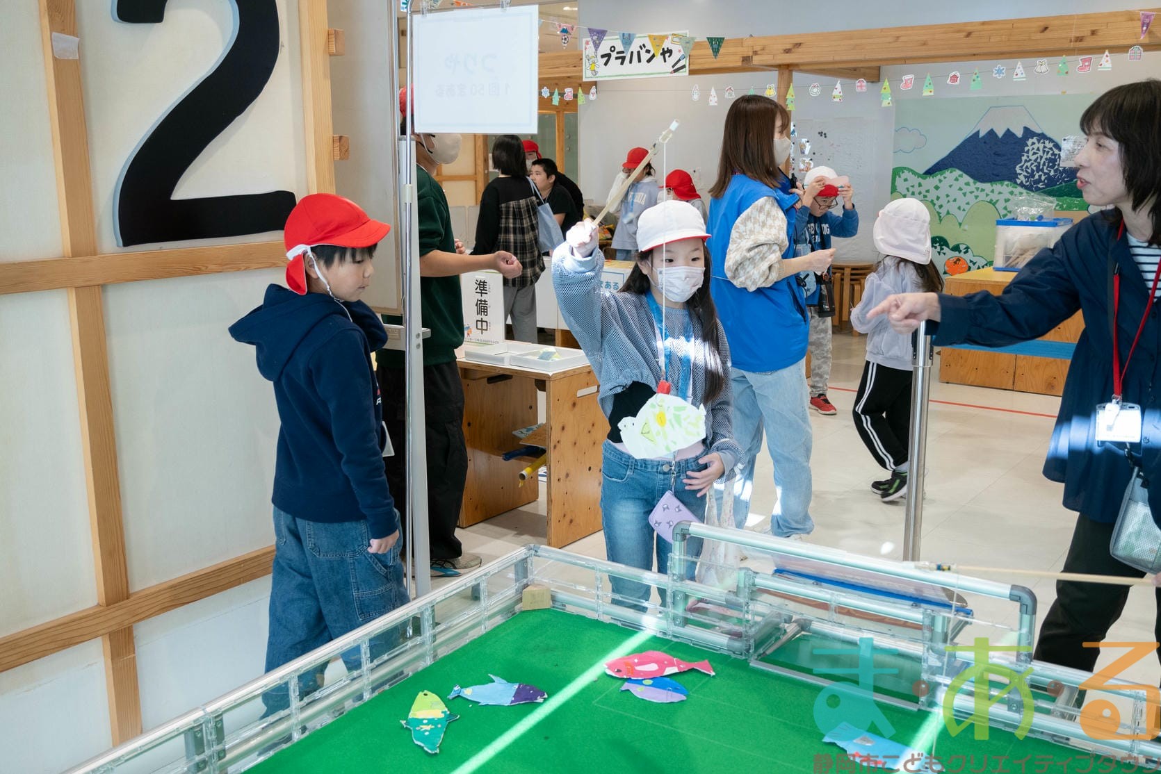 - つりやは、紙の魚を1匹つり上げ、裏に書いてある数字の景品がもらえるゲームやさんです。