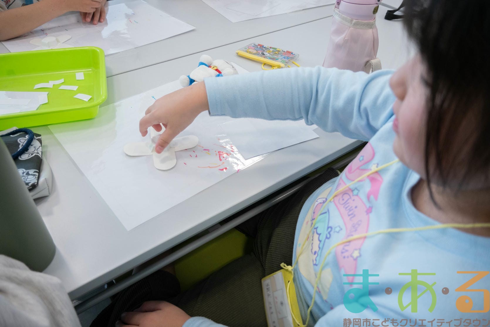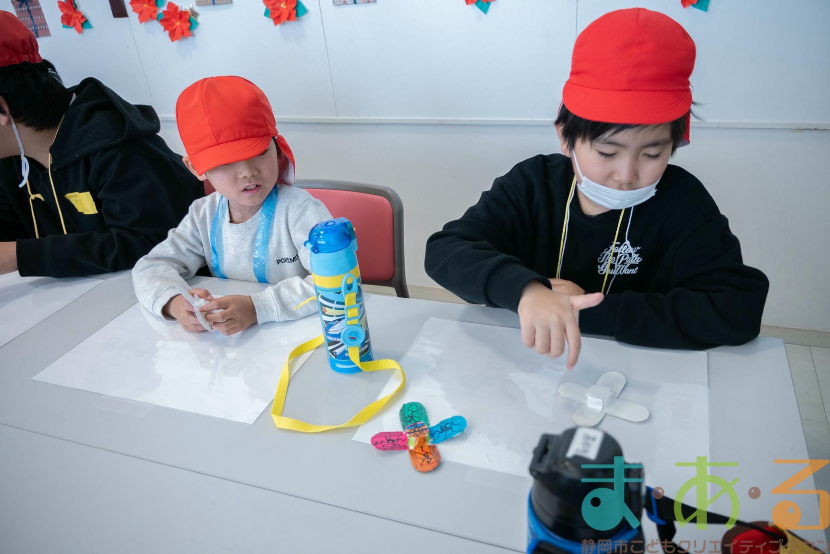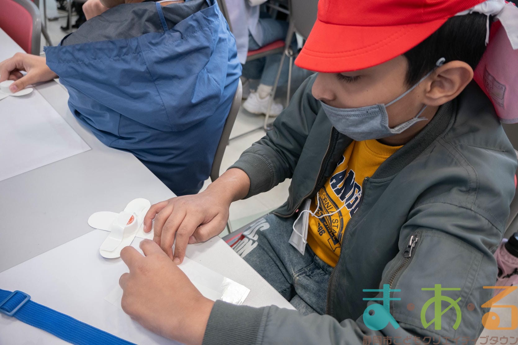 次に、ペットボトルキャップを貼り付けますが、ここが少し難しいポイントです。テープがキャップから離れないように、密着させると上手にできましたね。